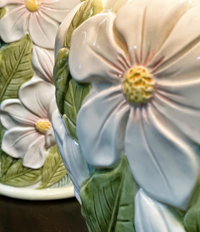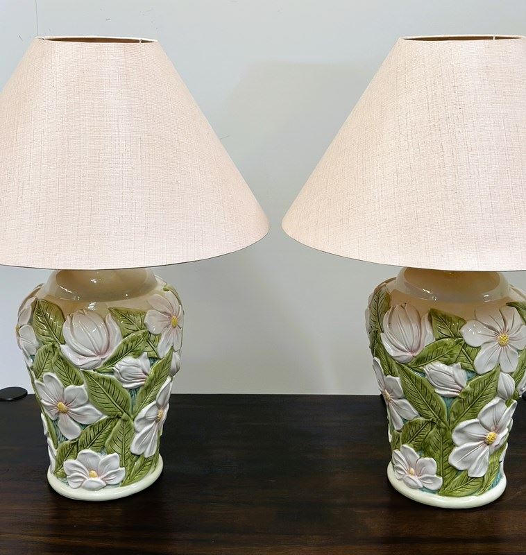 Bring the charm of vintage botanical design into your interior with this delightful pair of ceramic table lamps from the 1970s. Each lamp base is adorned with sculptural white flowers and lush green leaves in high relief, creating a vivid, textural presence that recalls classic Italian Capodimonte style. The original linen shades emit a soft, warm glow, perfect for bedside tables, consoles, or reading corners. In excellent vintage condition and fully rewired for modern use. Sold as a pair.