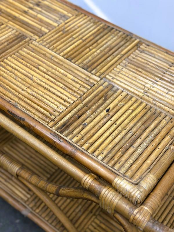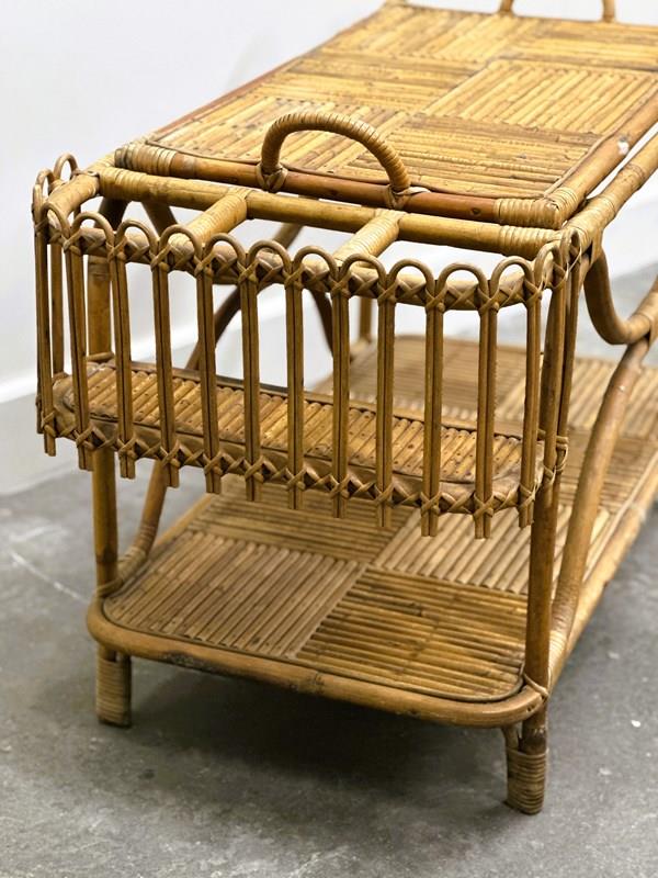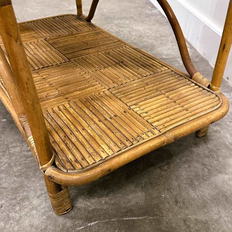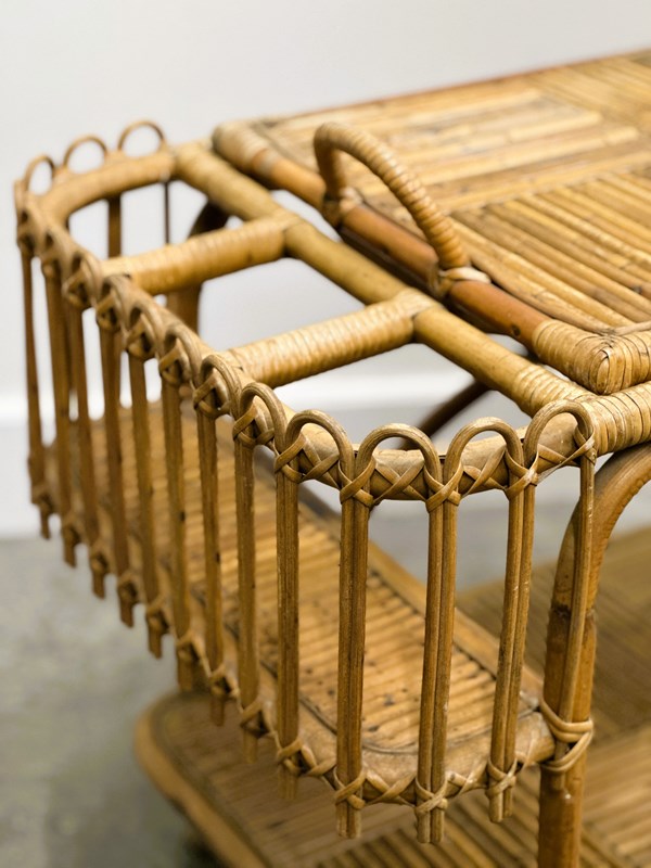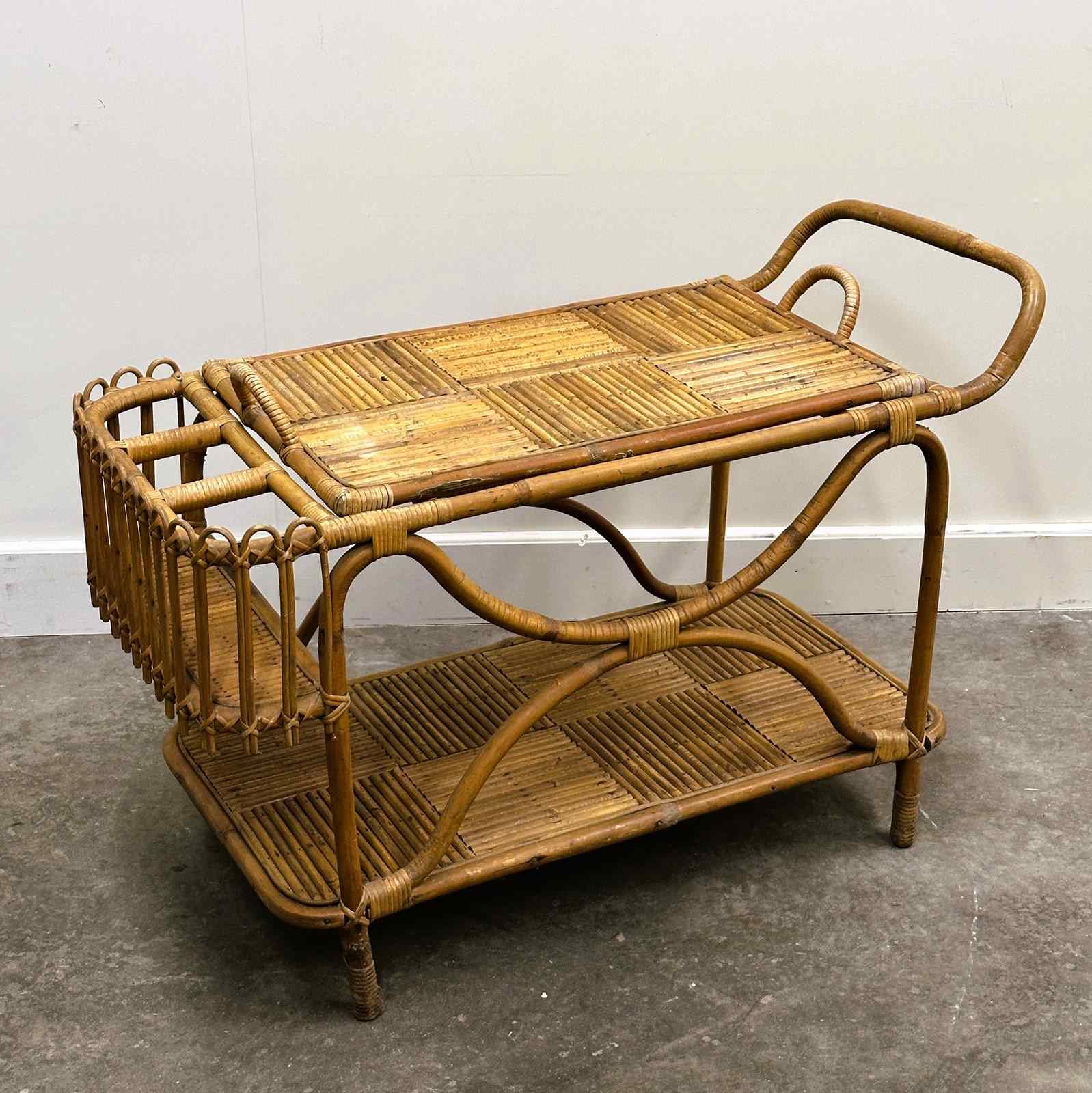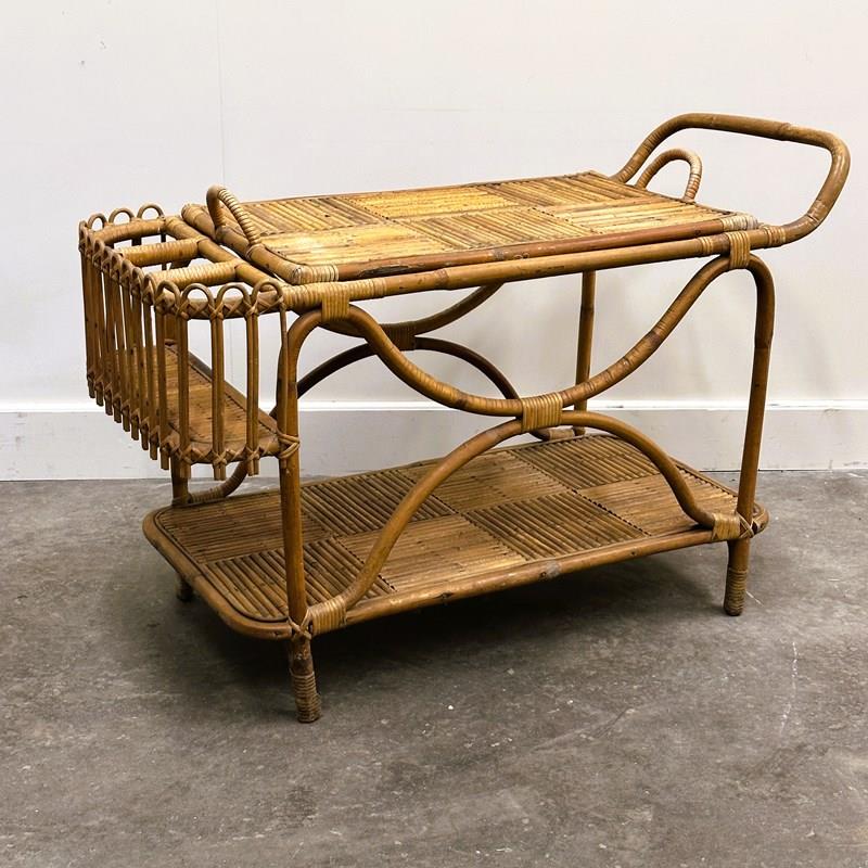 Evoking the effortless charm of the French Riviera, this large 1960s rattan bar cart brings warmth, texture, and a touch of mid-century glamour to any space.