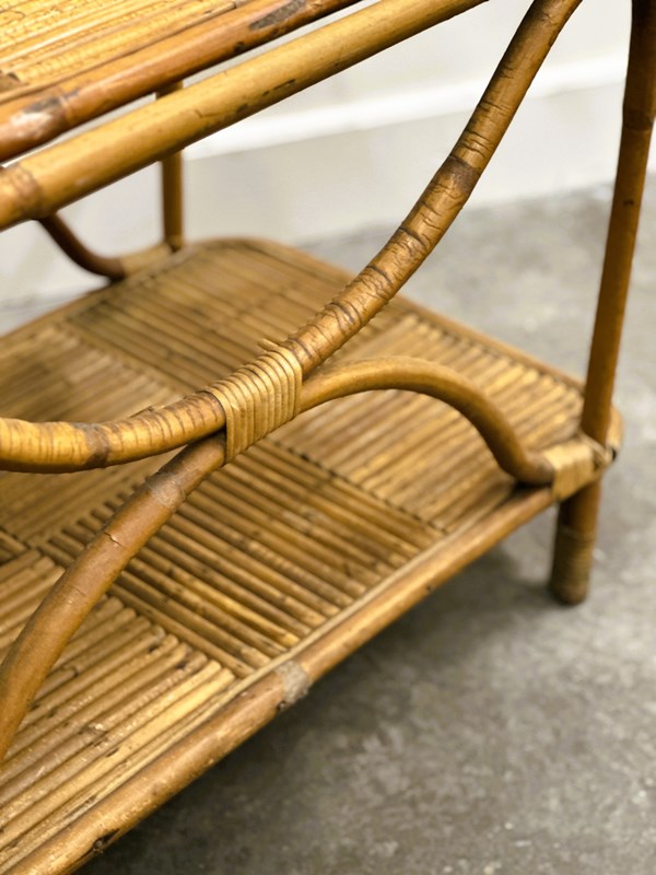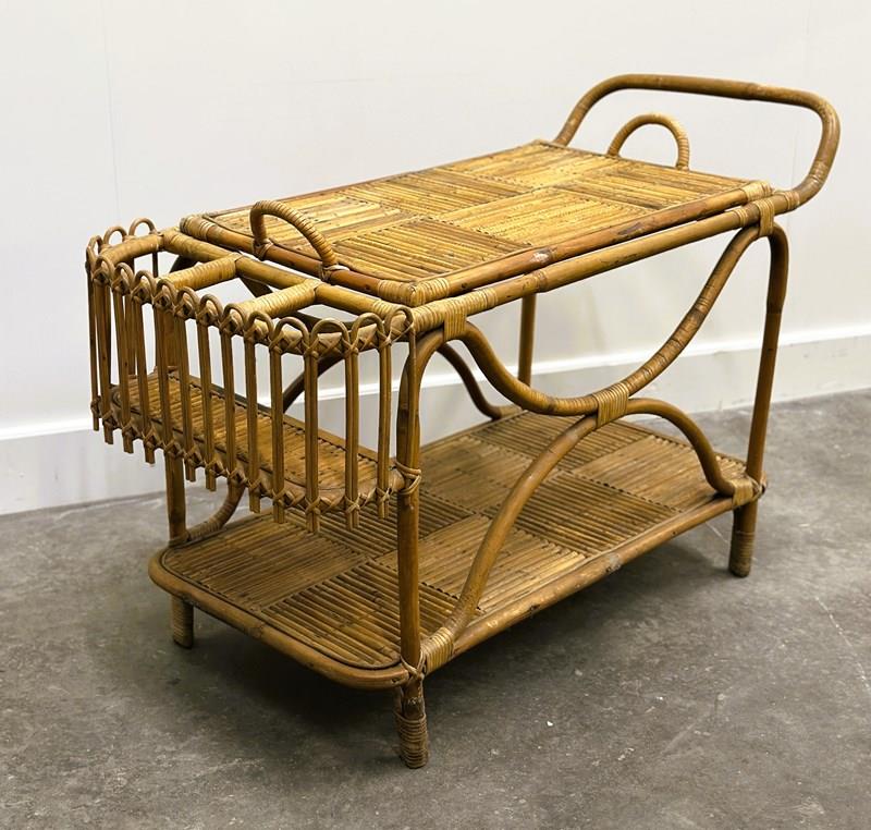 Beautifully handcrafted in natural rattan with a honey-toned patina, it features two spacious woven tiers and elegant curved lines typical of coastal French design. The integrated bottle holder adds both practicality and vintage appeal — perfect for serving cocktails, displaying glassware, or styling with plants and decor.