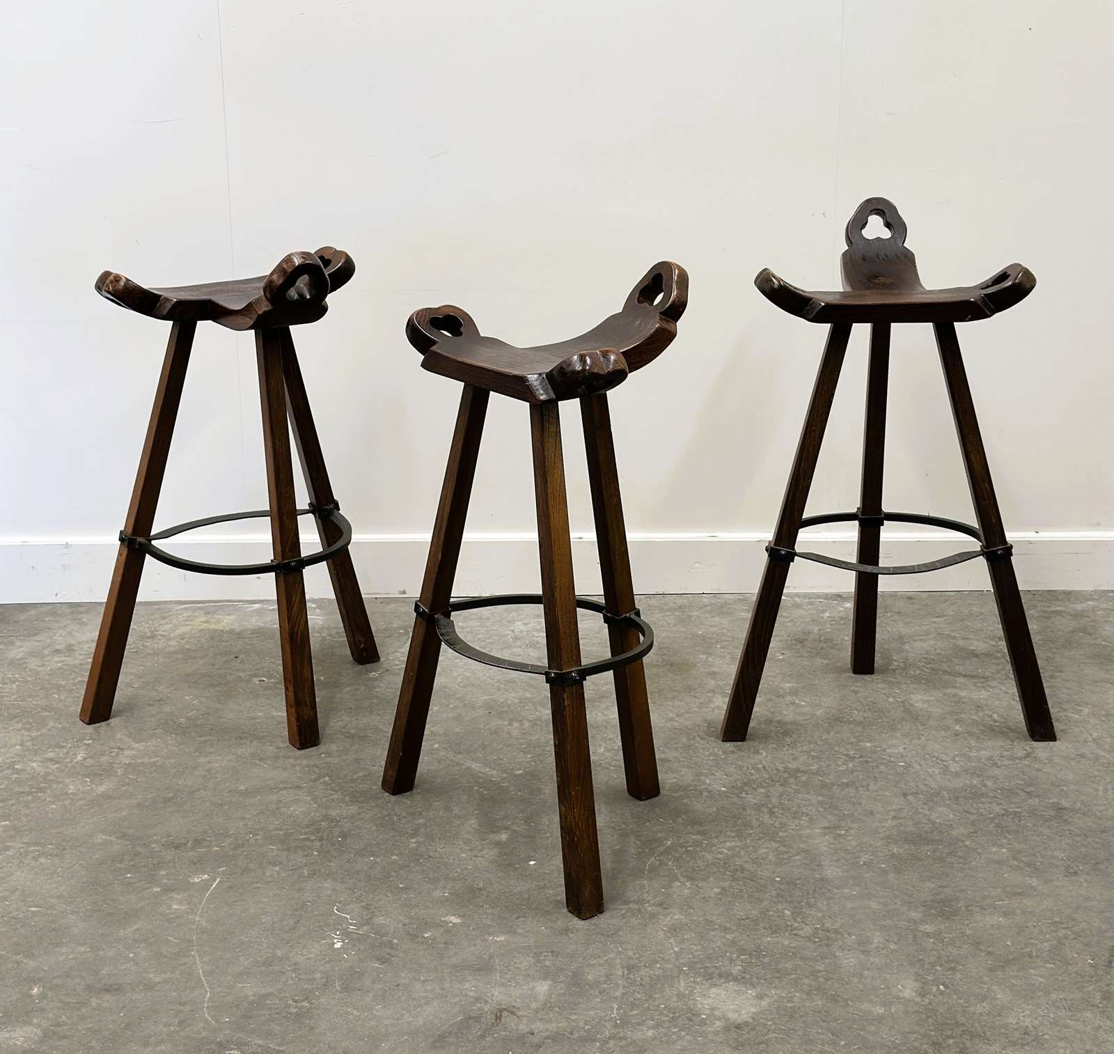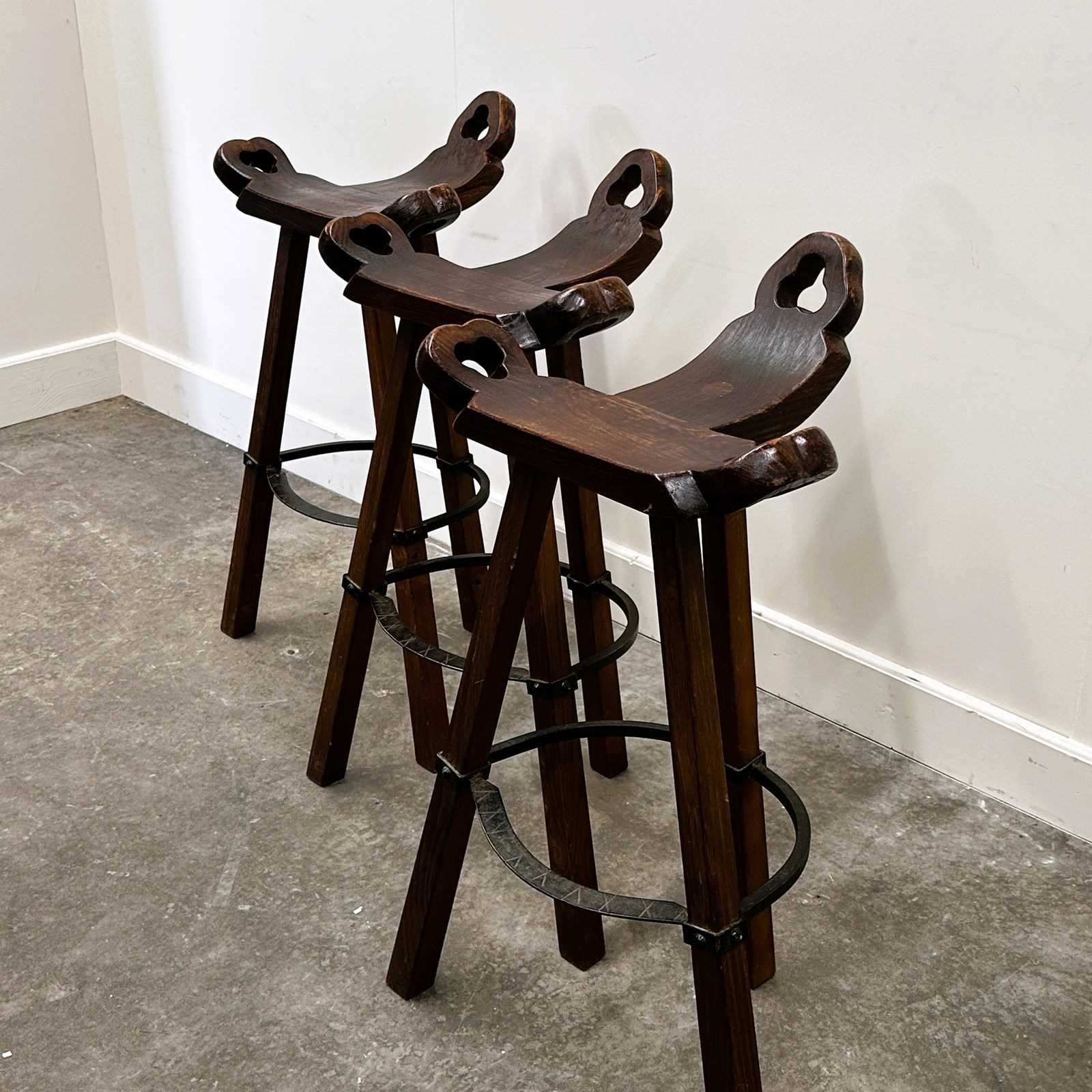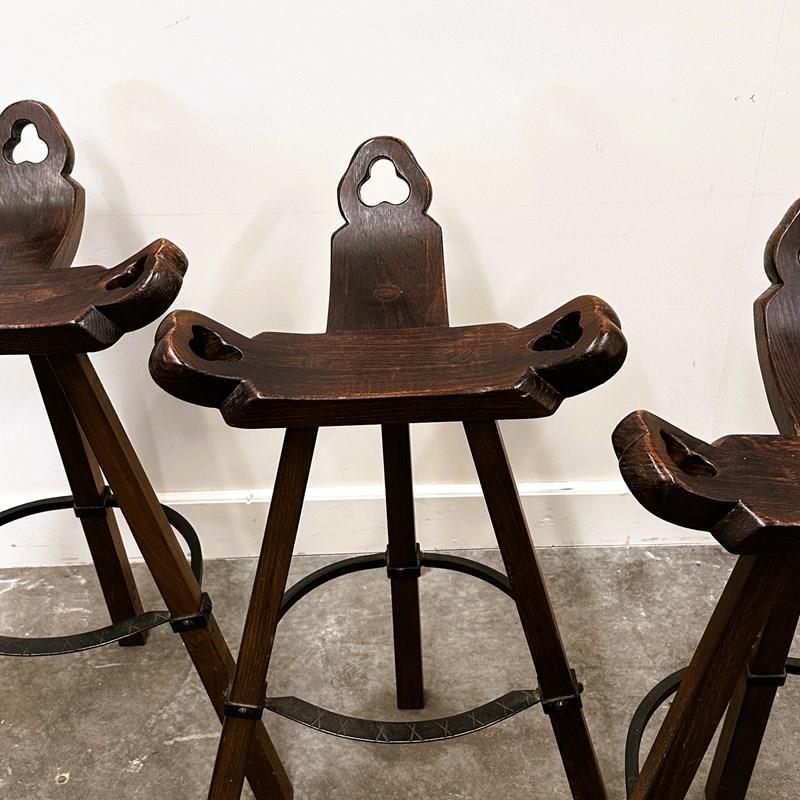 Set Of 3 Rustic Carved Oak Bar Stools With Iron Footrests, 1970S
