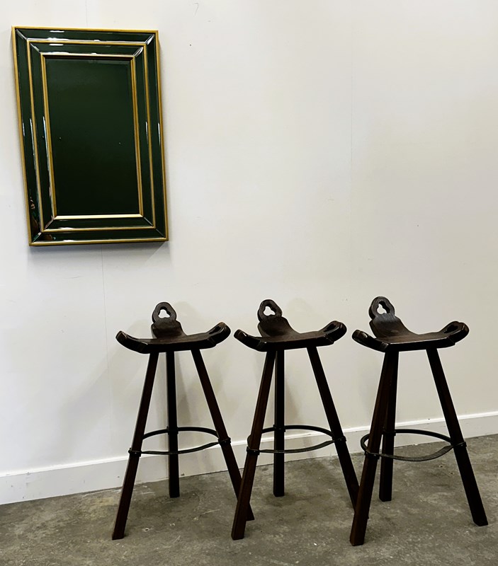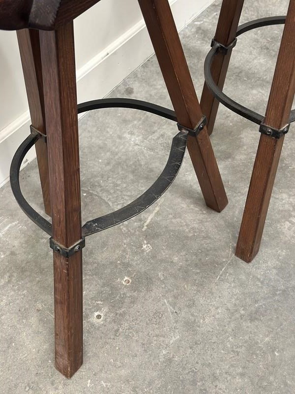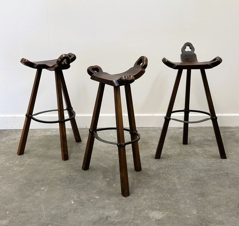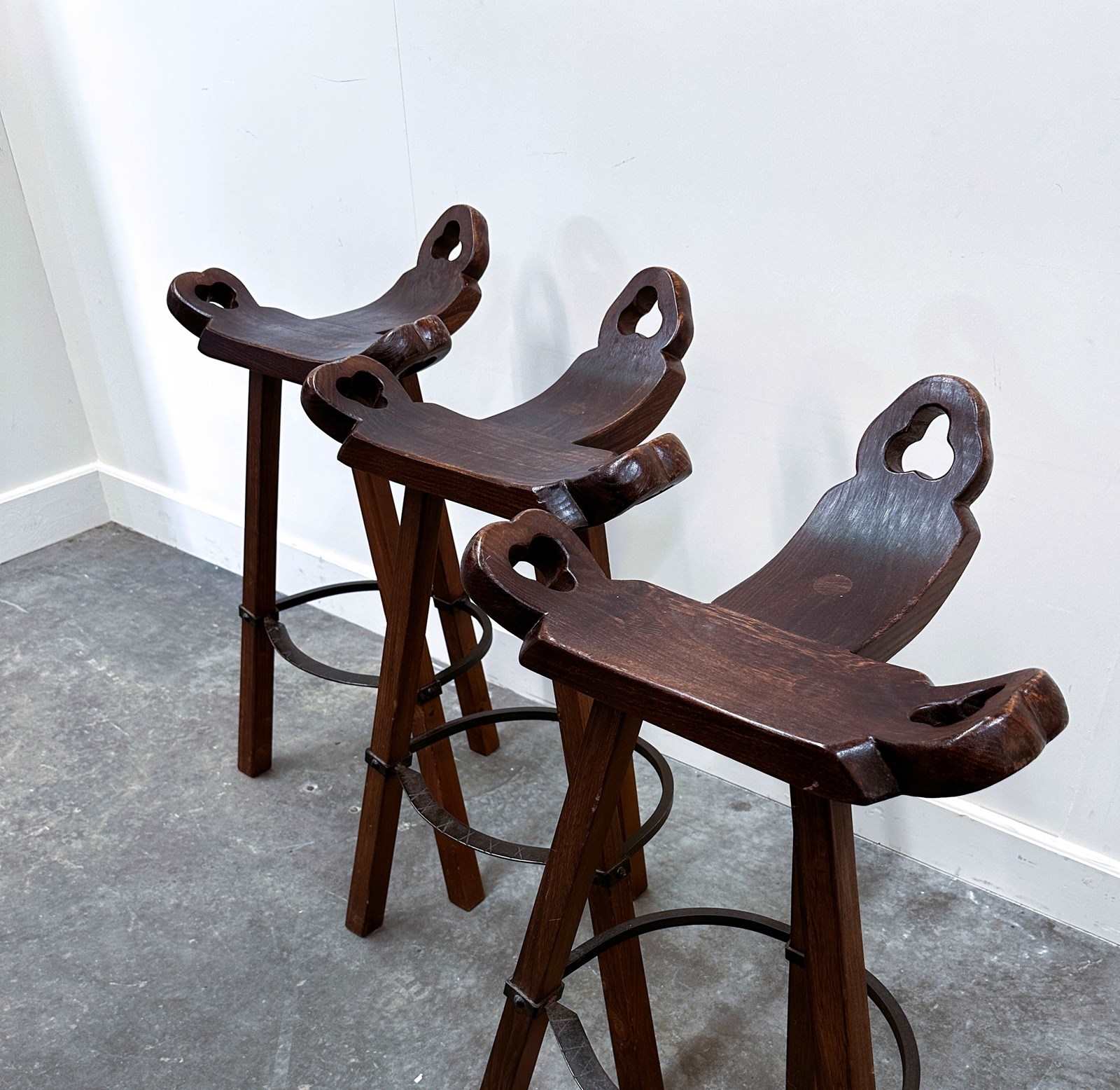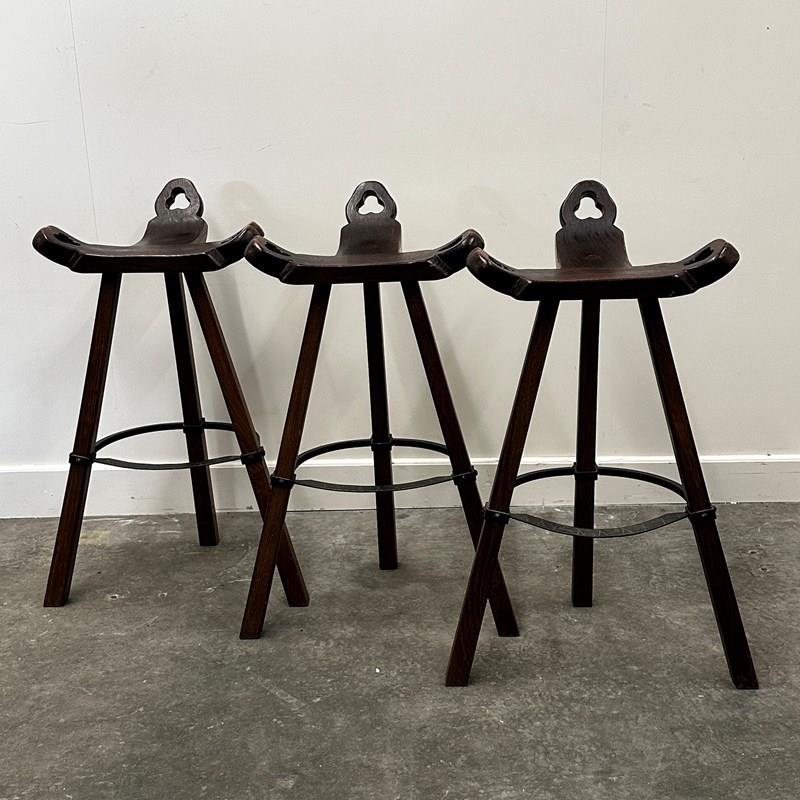 Set Of 3 Rustic Carved Oak Bar Stools With Iron Footrests, 1970S