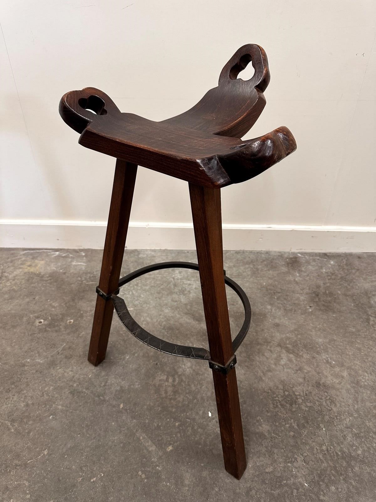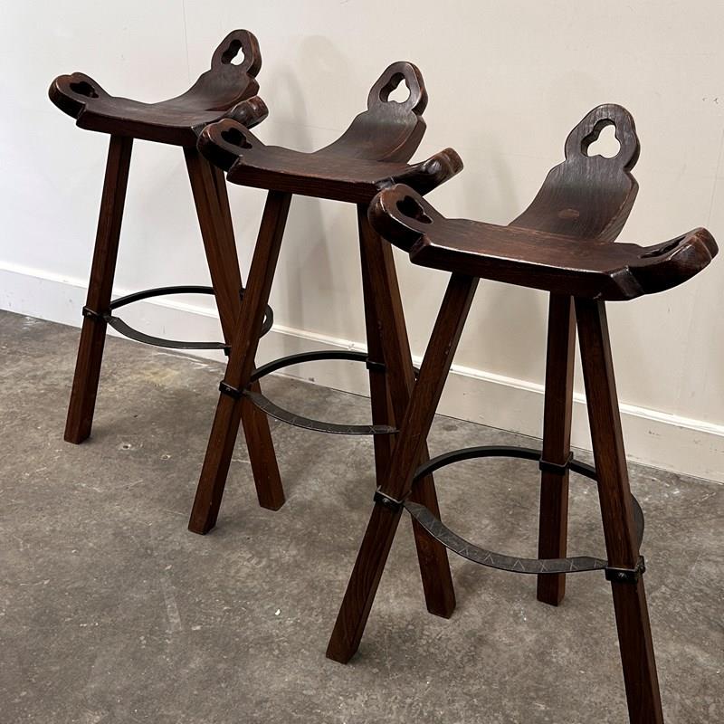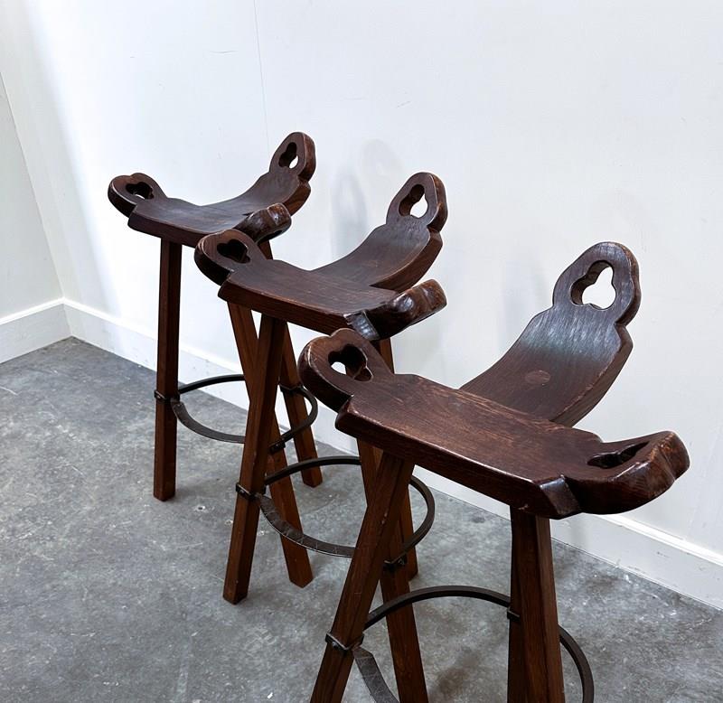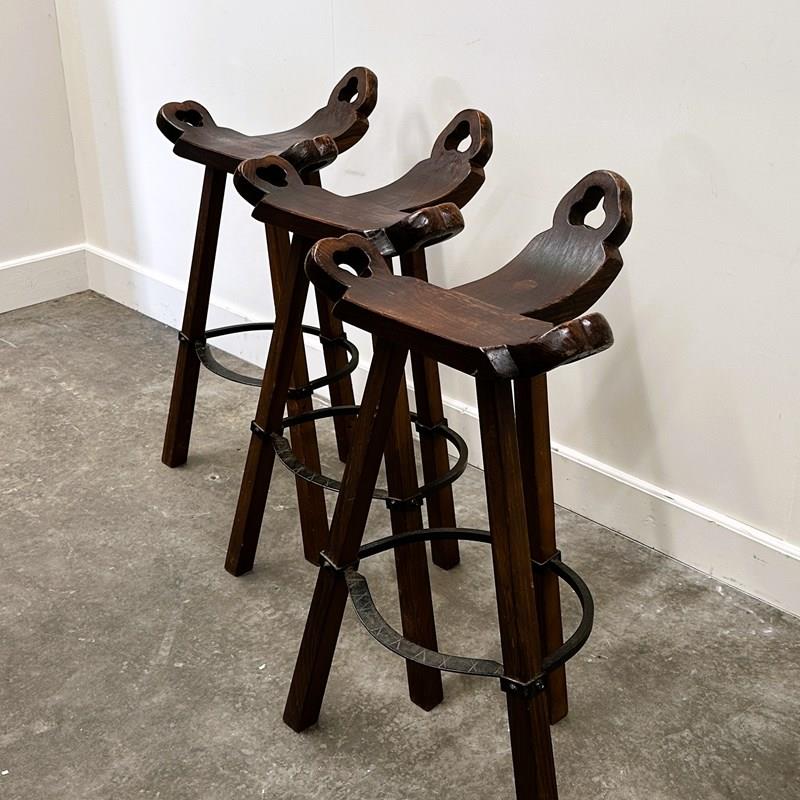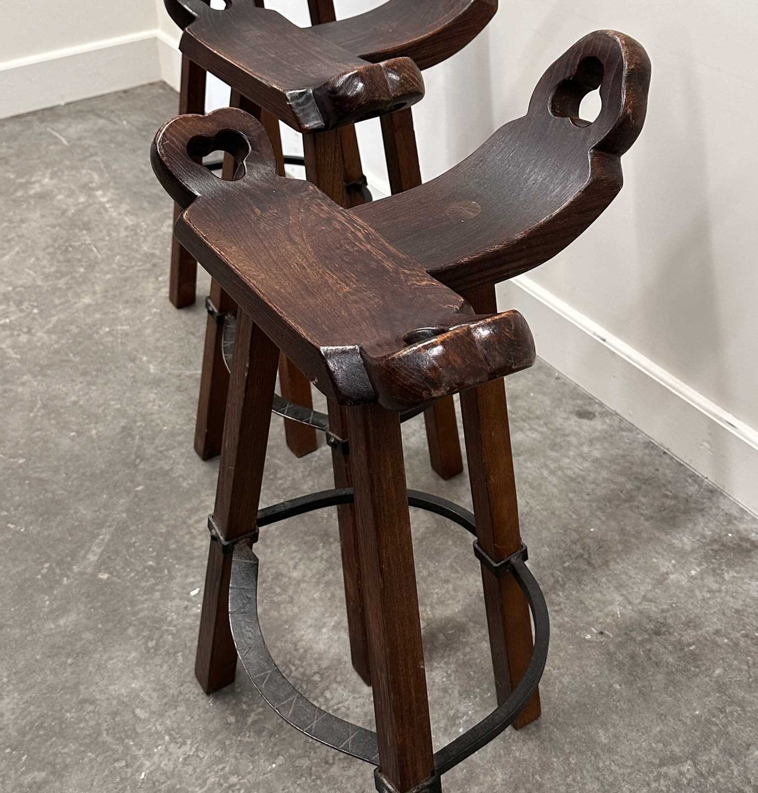 A charming set of 3 hand-carved bull bar stools in solid oak, dating from the 1970s. These stools exhibit a sculptural, alpine-inspired silhouette, with decorative heart-shaped cutouts on the backrest and beautifully contoured seats. The rich dark stain enhances the grain of the oak, giving each piece warmth and character. The sturdy legs are reinforced with hand-forged wrought iron stretchers, adding both strength and a subtle industrial edge.