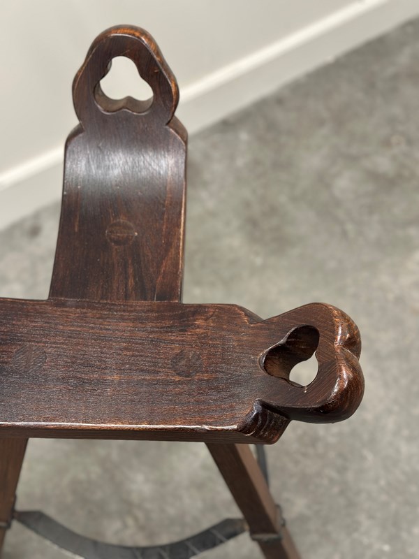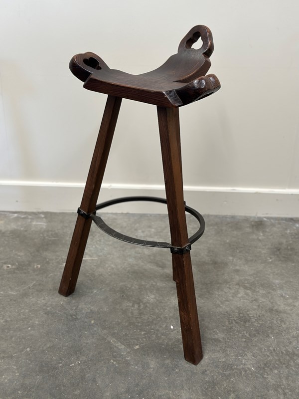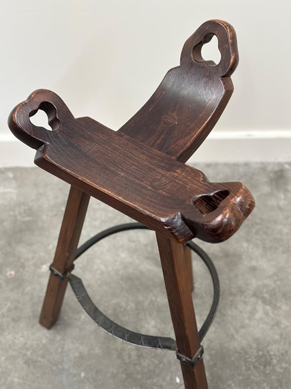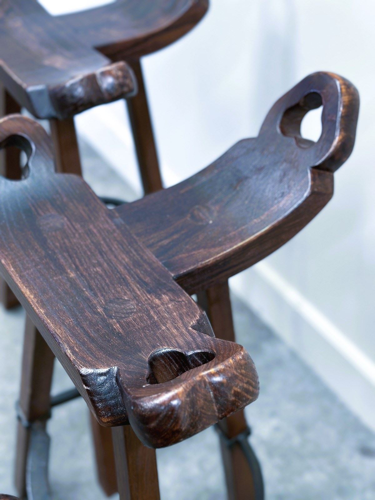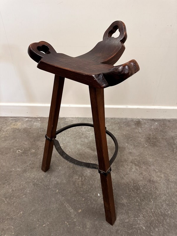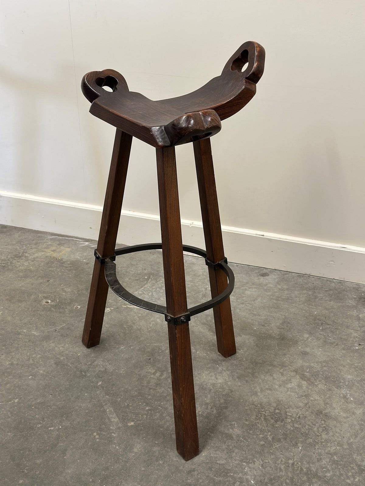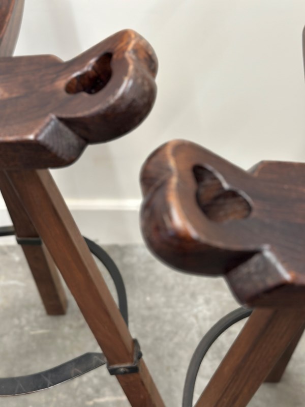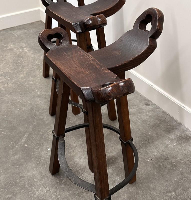 rustic bar stools, oak counter stools, alpine bar seating, heart cutout stools, 70s oak bar stools, vintage bar stools, solid oak stools, carved wood stools, cottagecore decor, midcentury stools, country style stool, wrought iron detail, wooden bar chairs