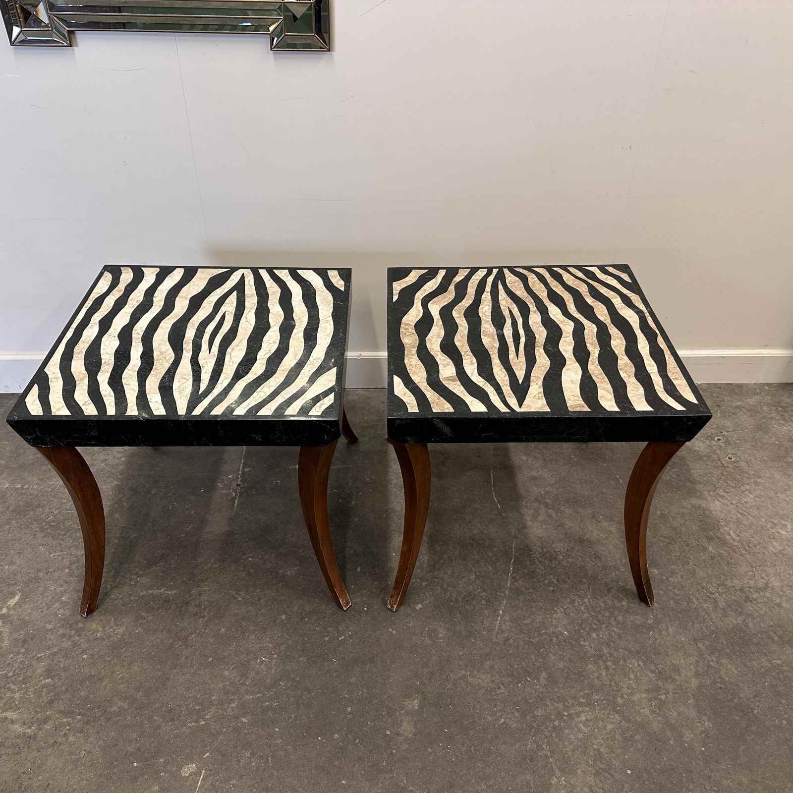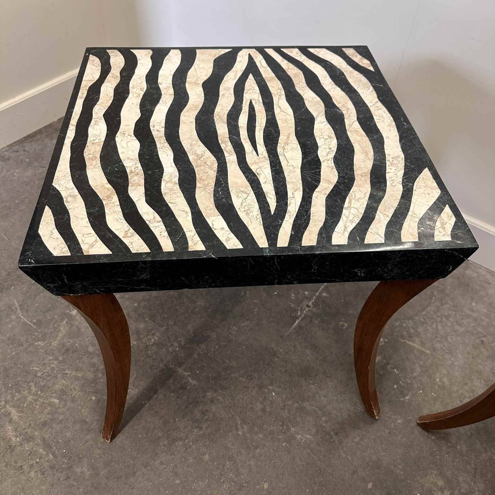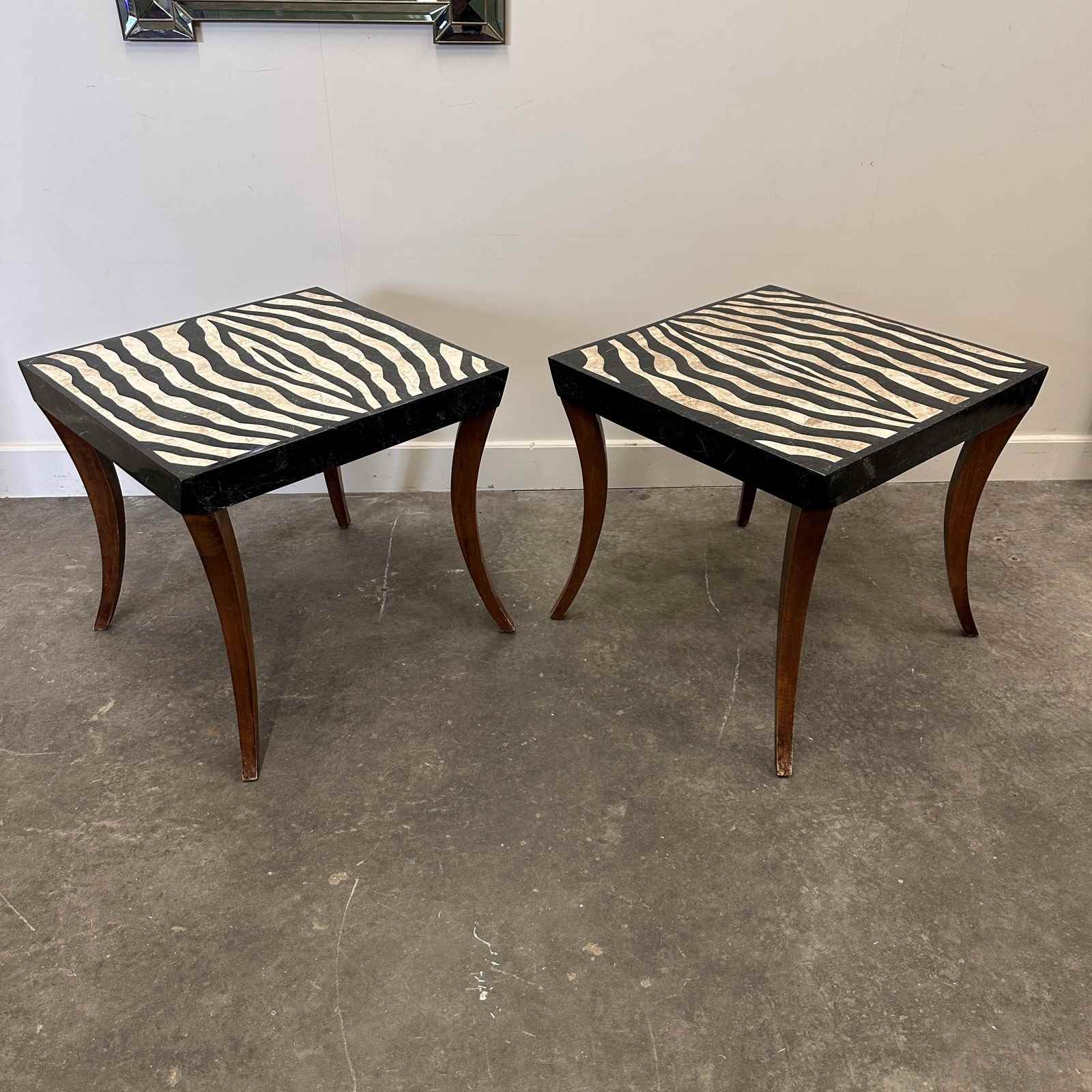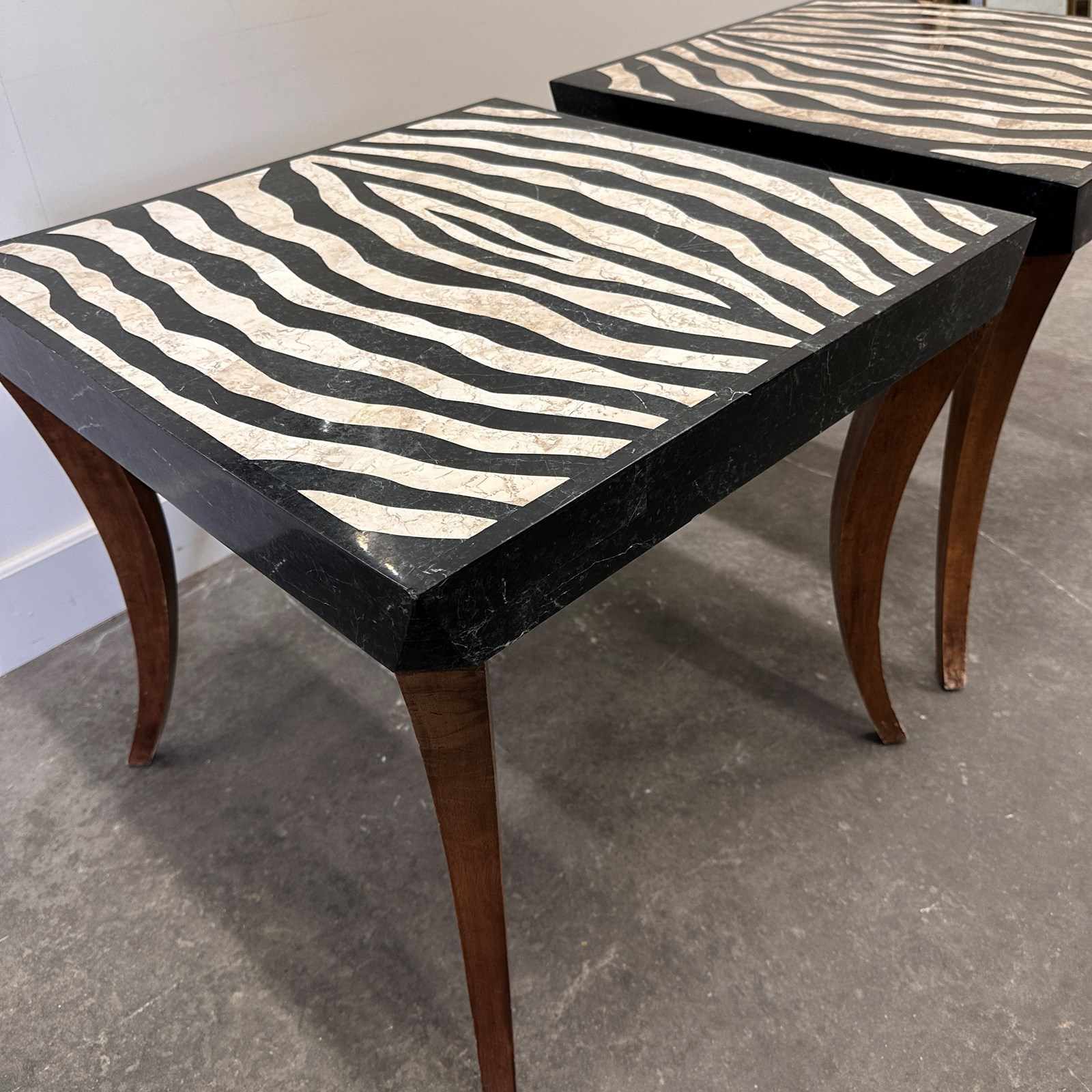 Each table features a meticulously inlaid zebra-patterned top made from contrasting tessellated stone, combining graphic impact with the subtle texture of natural materials. The rich tones of the stone are beautifully complemented by the refined curved wooden legs, which add an elegant sculptural balance to the striking top. Price is for the pair.