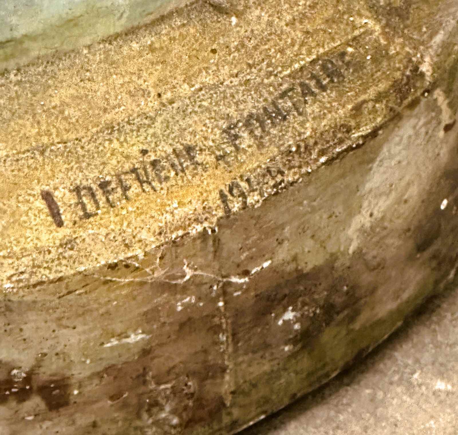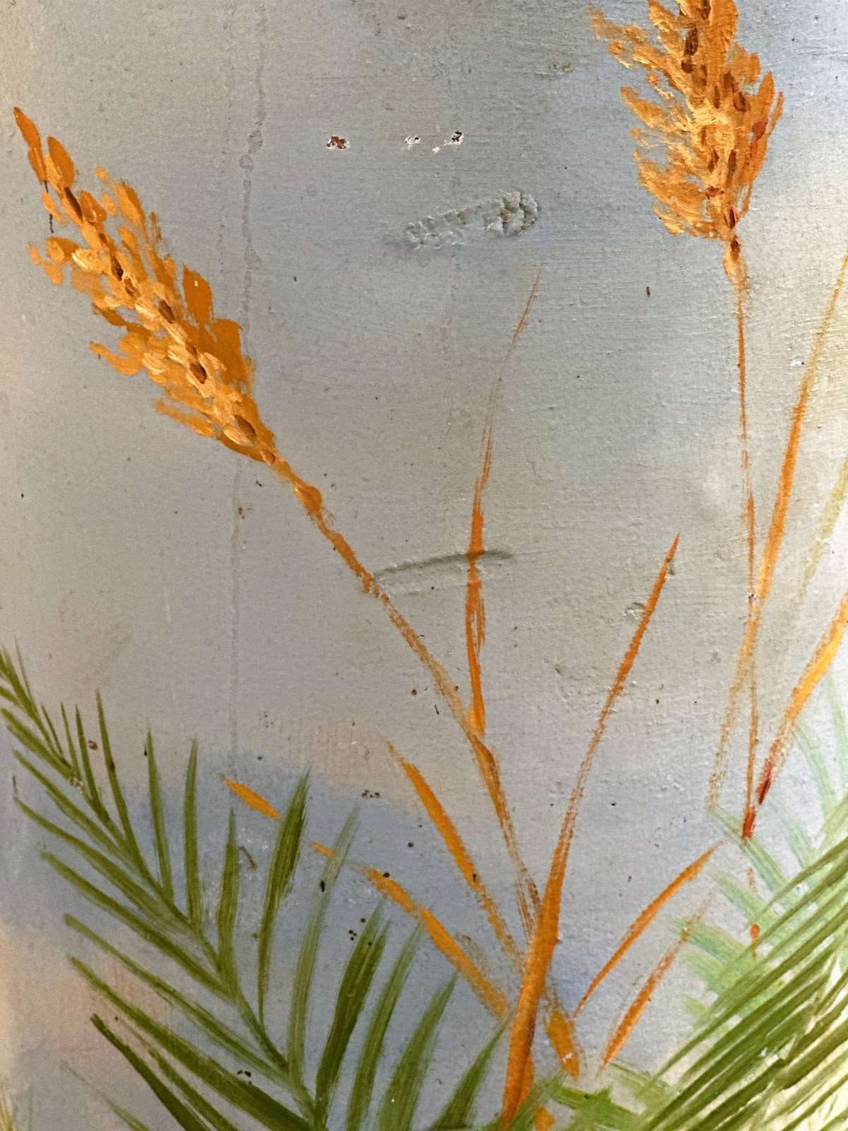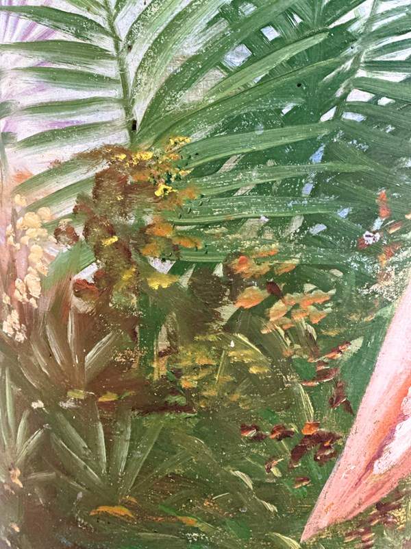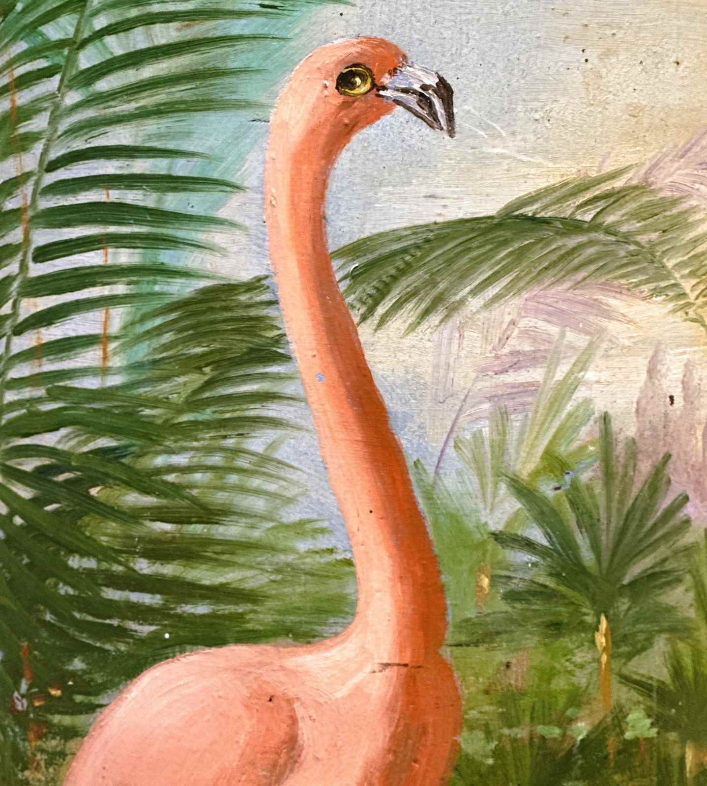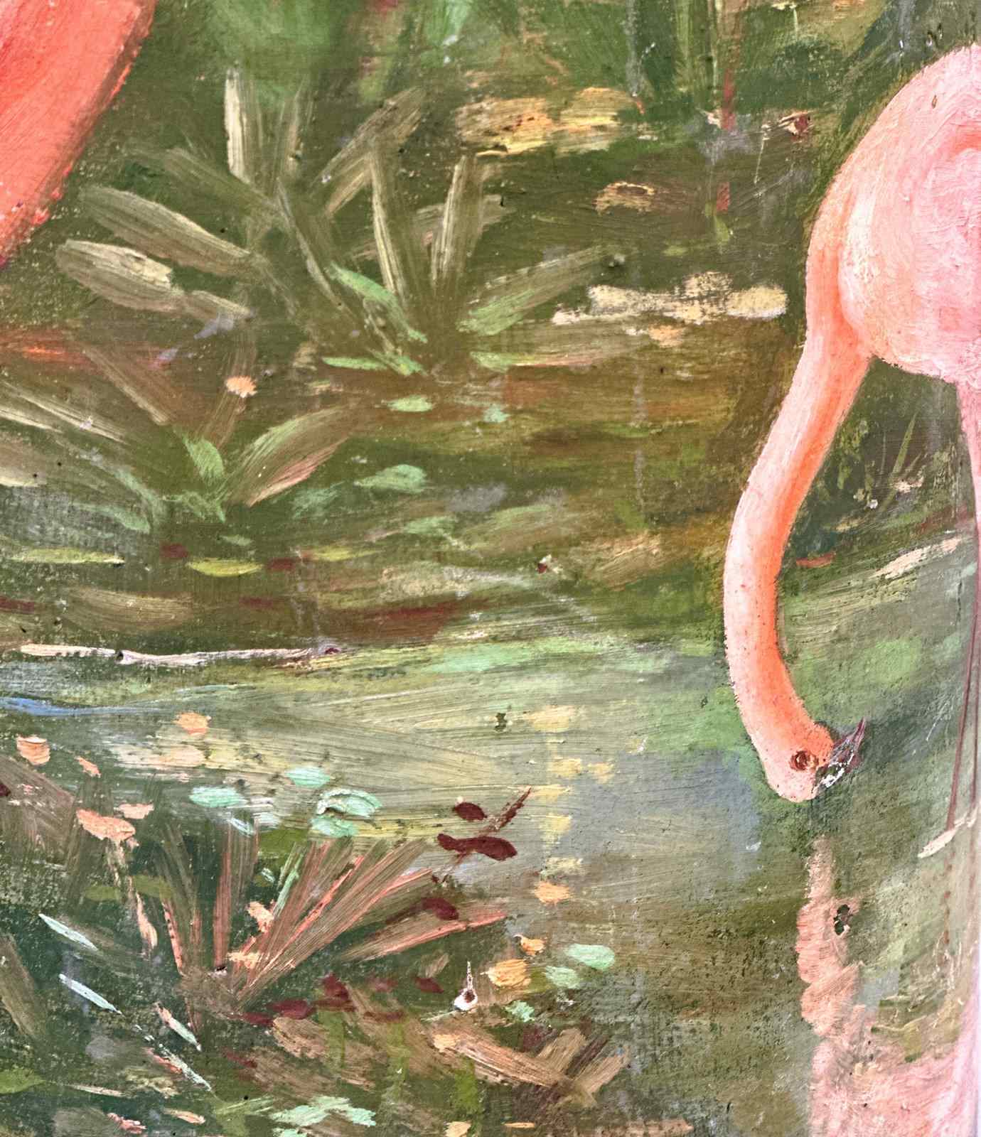 This unique pedestal is a true piece of folk art, hand-painted on a reclaimed terracotta pipe, signed and dated from the 1940s. Sourced in France, it features a vibrant tropical scene with two elegant flamingos surrounded by lush greenery and exotic foliage, painted in rich detail and subtle brushstrokes. The cylindrical form and hand-painted surface turn a simple utilitarian object into a captivating piece of art. Ideal as a plant stand, sculpture base, or statement piece in a curated interior. A charming example of repurposed artisan craftsmanship that celebrates both nature and nostalgia.