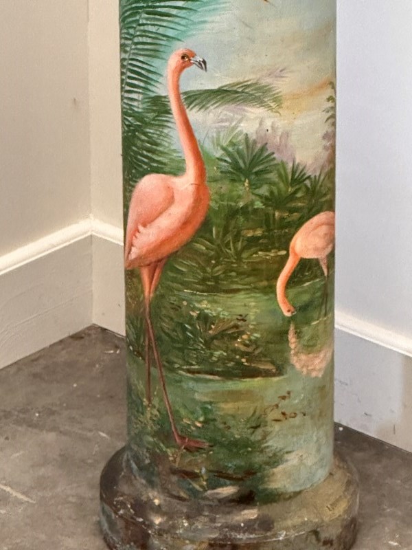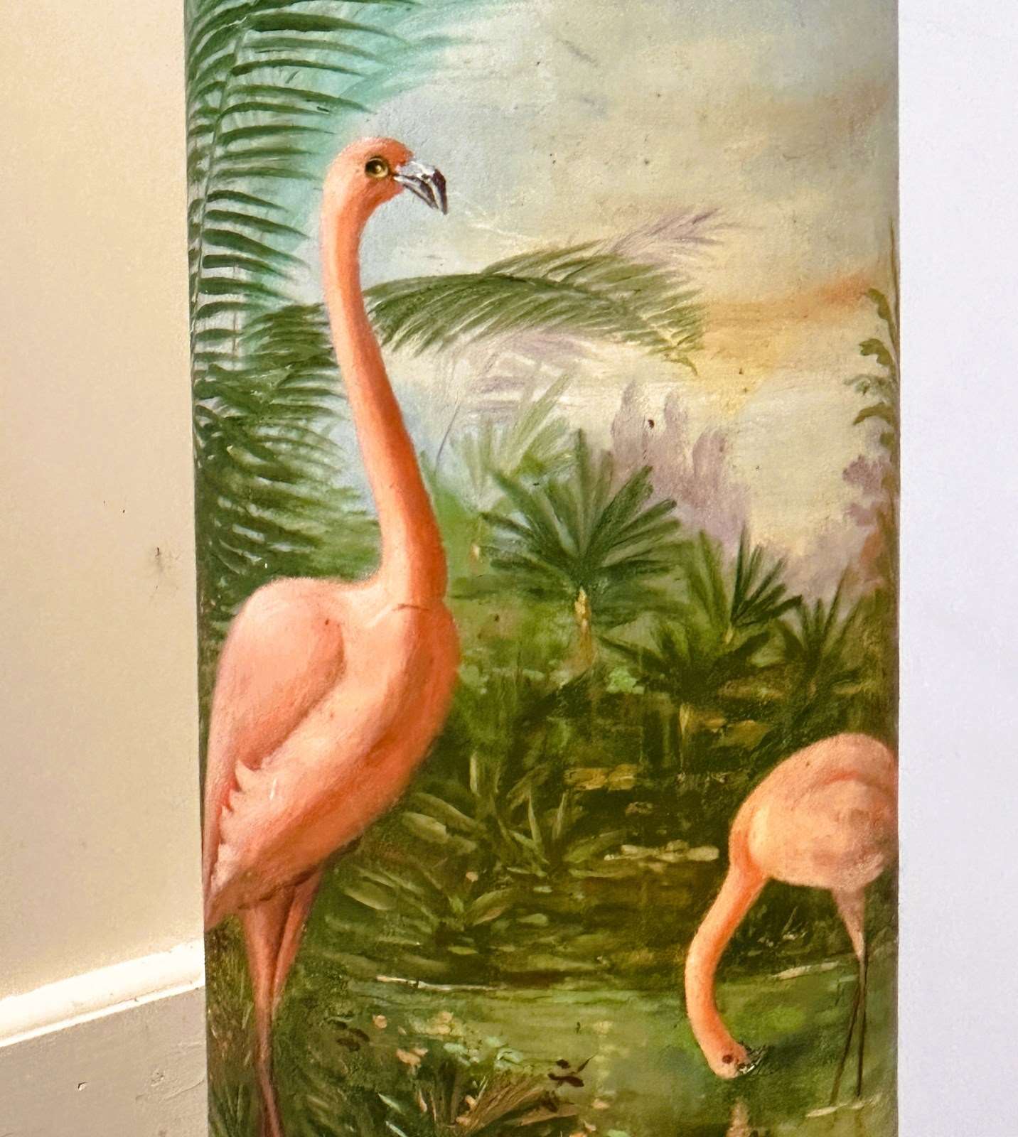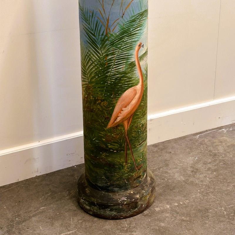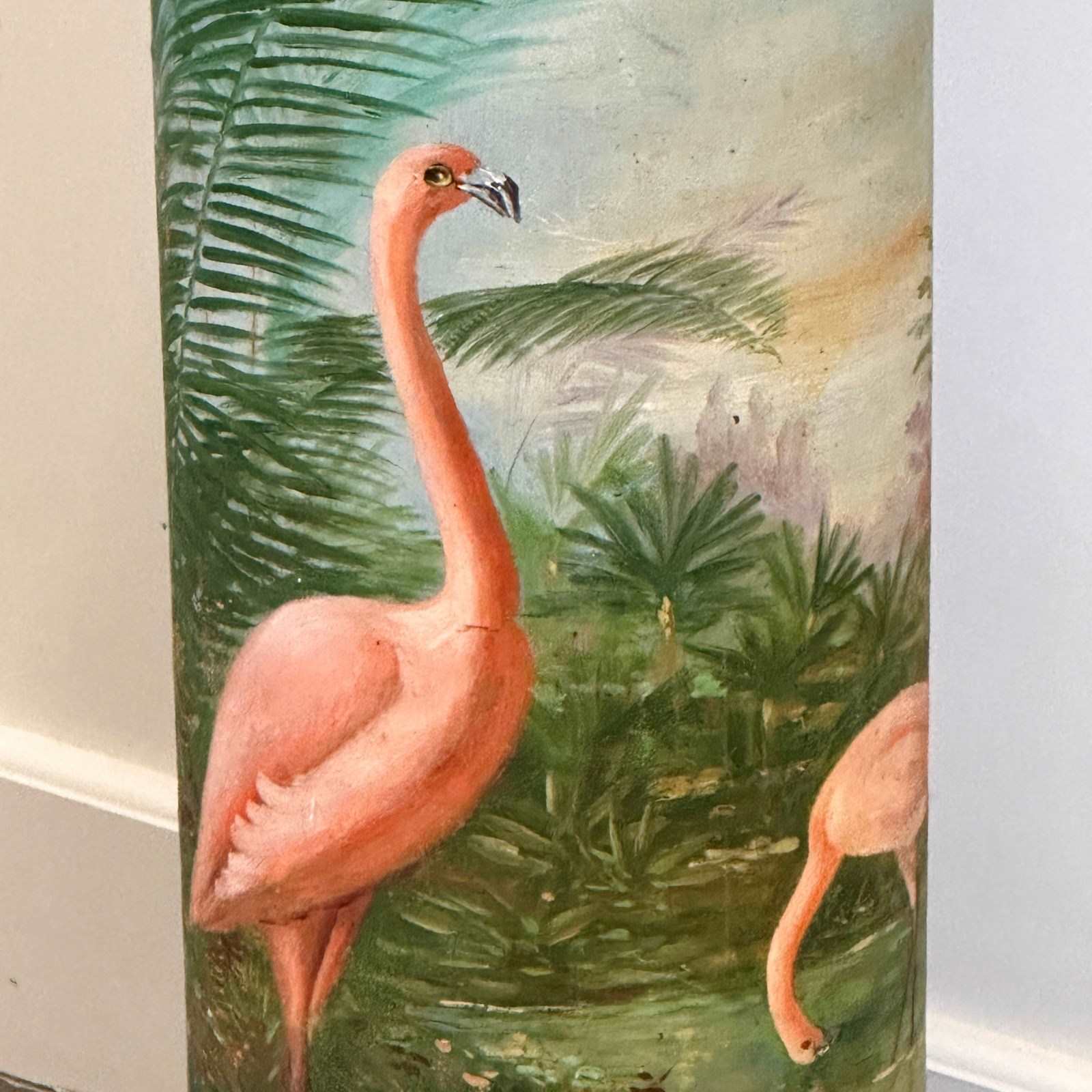 terracotta pedestal, hand painted pipe, flamingo artwork, exotic pedestal, vintage stand, plant stand art, painted column, 1940s decor, French folk art, flamingo column, unique pedestal, tropical decor, handpainted tube