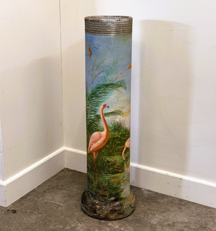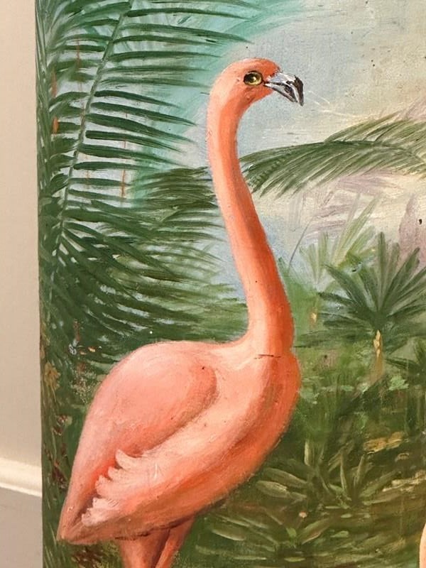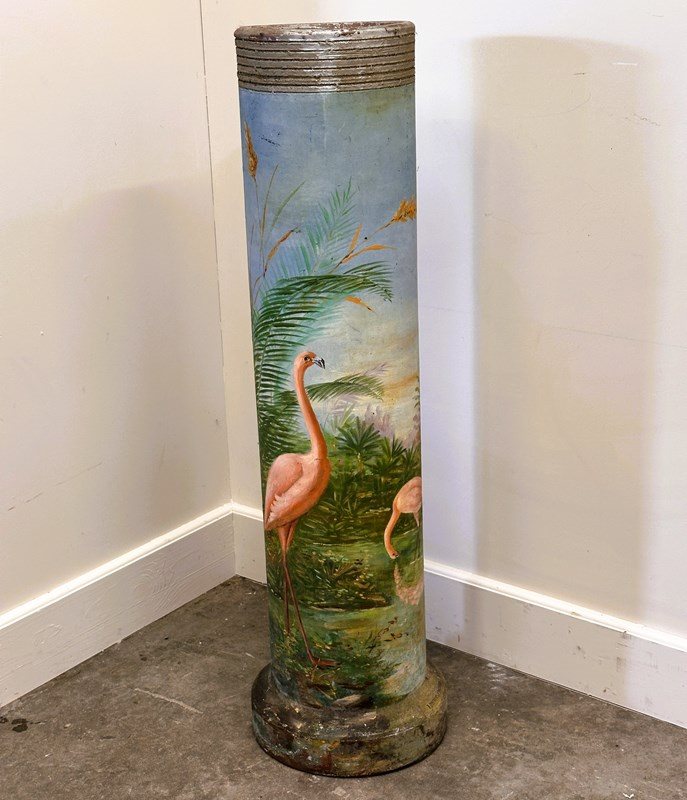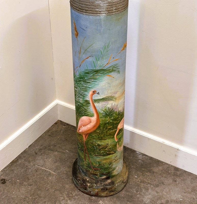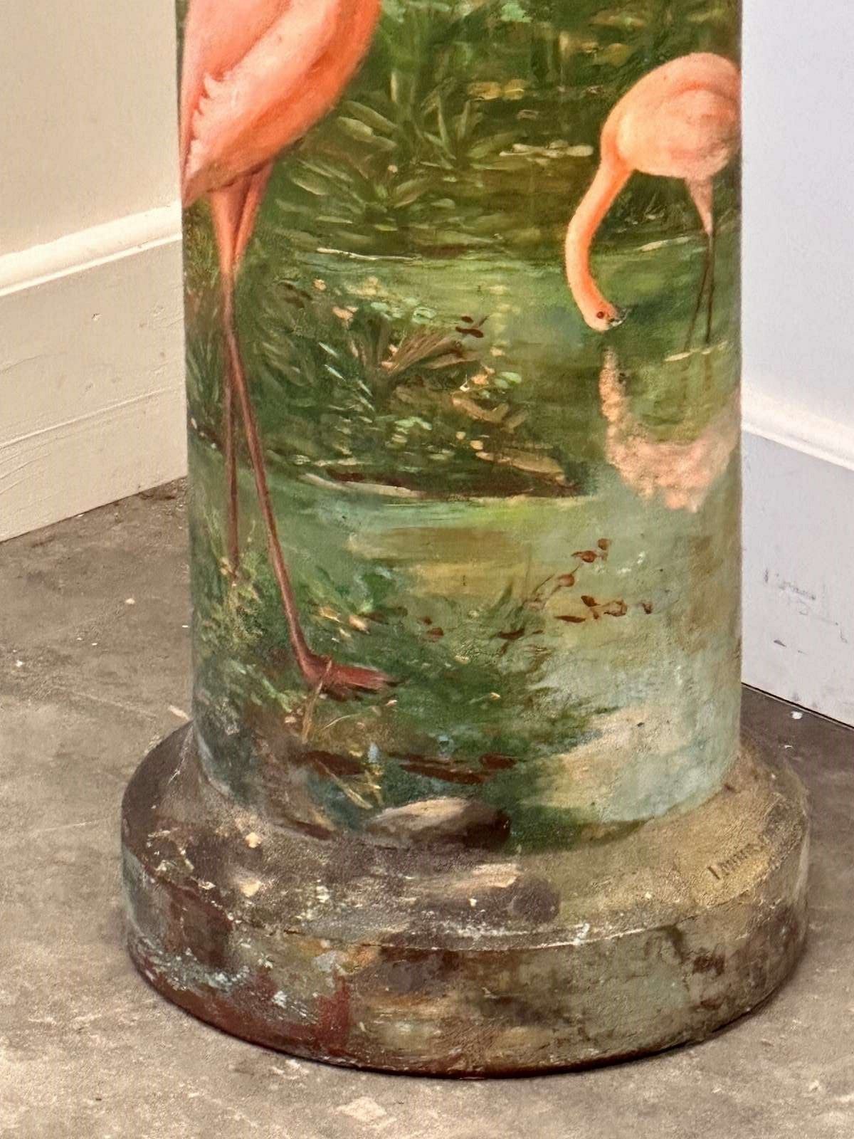 terracotta pedestal, hand painted pipe, flamingo artwork, exotic pedestal, vintage stand, plant stand art, painted column, 1940s decor, French folk art, flamingo column, unique pedestal, tropical decor, handpainted tube