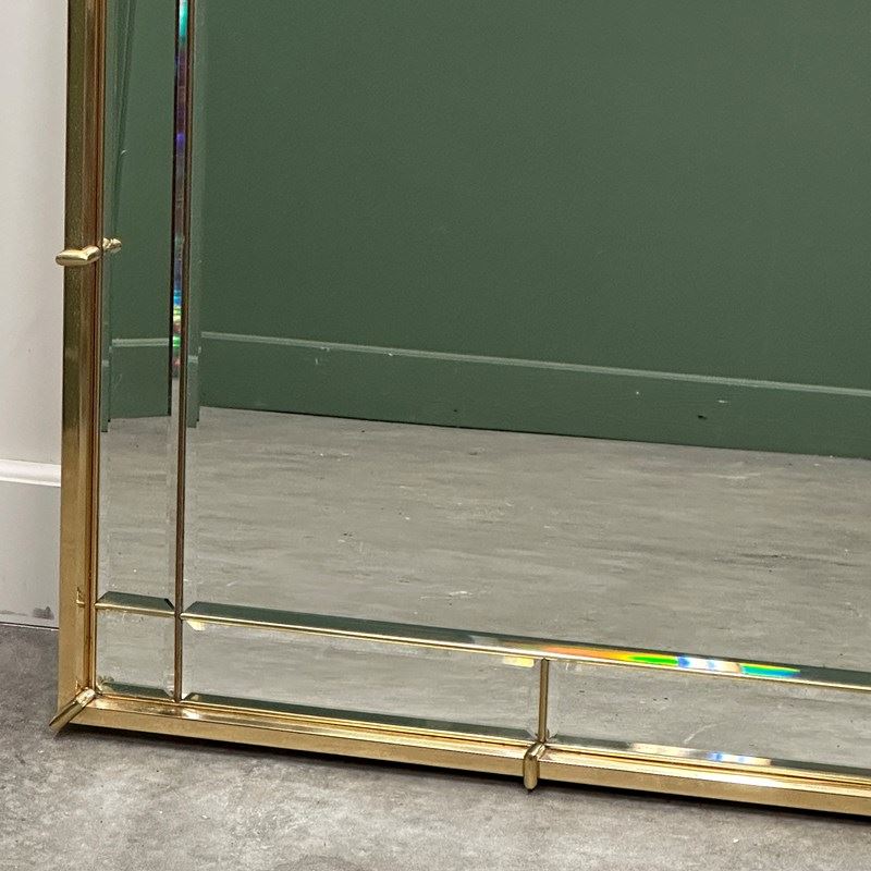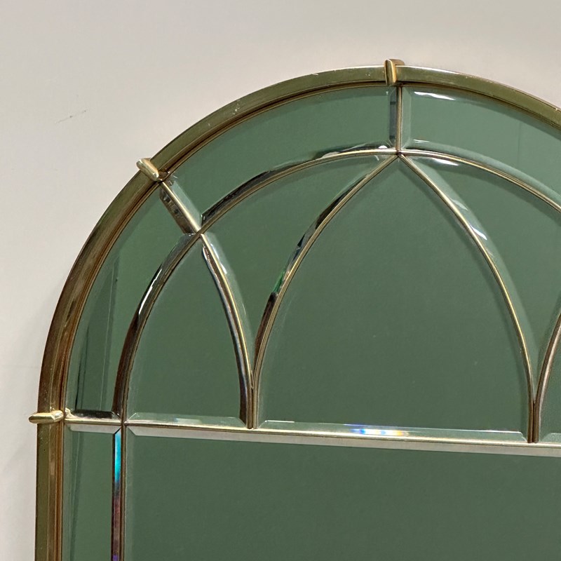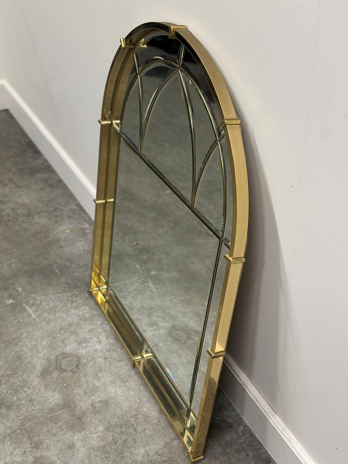 A striking 1970s arched cathedral-window mirror in brass and bevelled glass — a glamorous, architectural statement piece that instantly elevates any room. Its tall arched silhouette, decorative bevel cuts, and solid brass frame bring together Hollywood Regency elegance with timeless European craftsmanship.