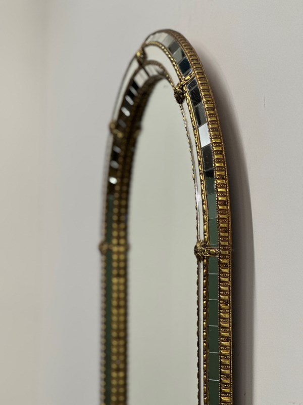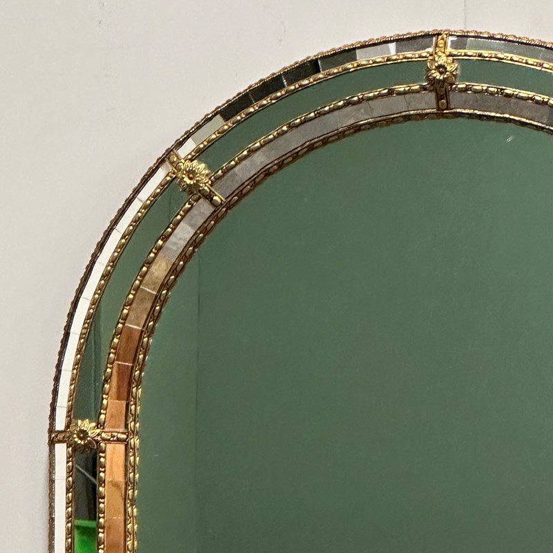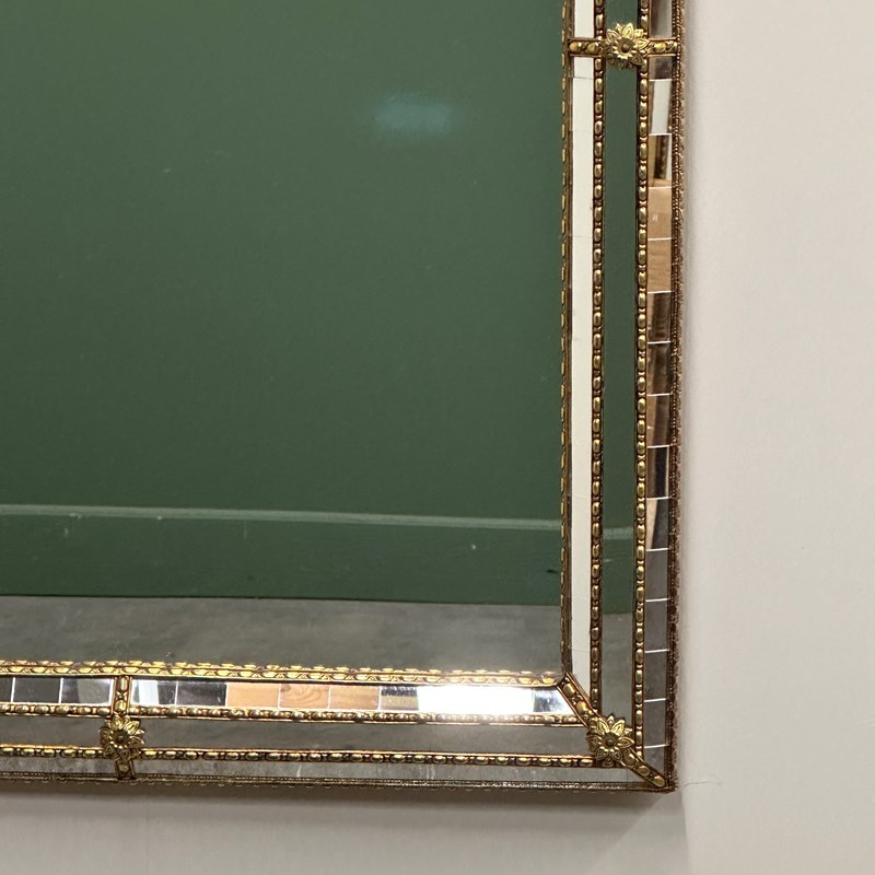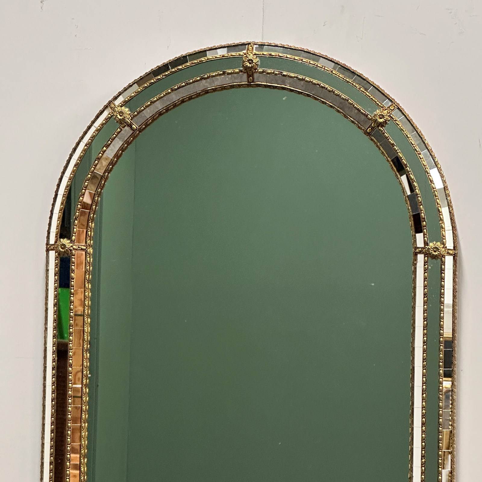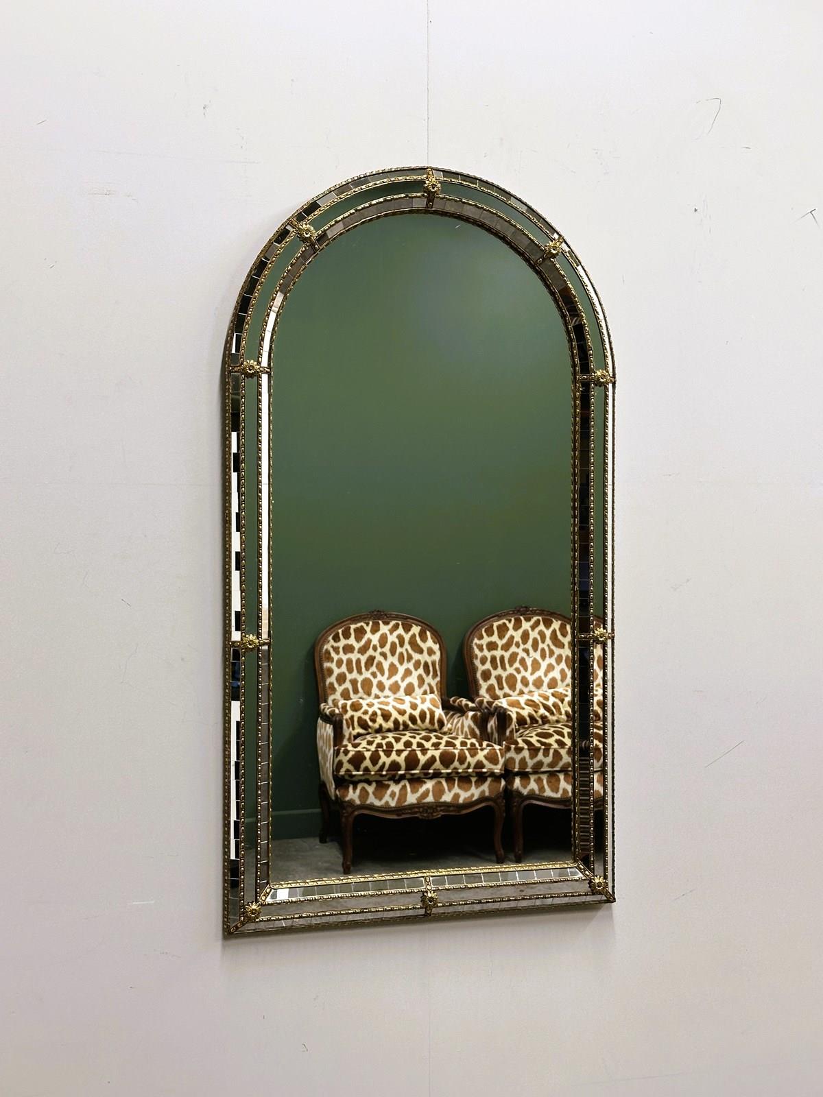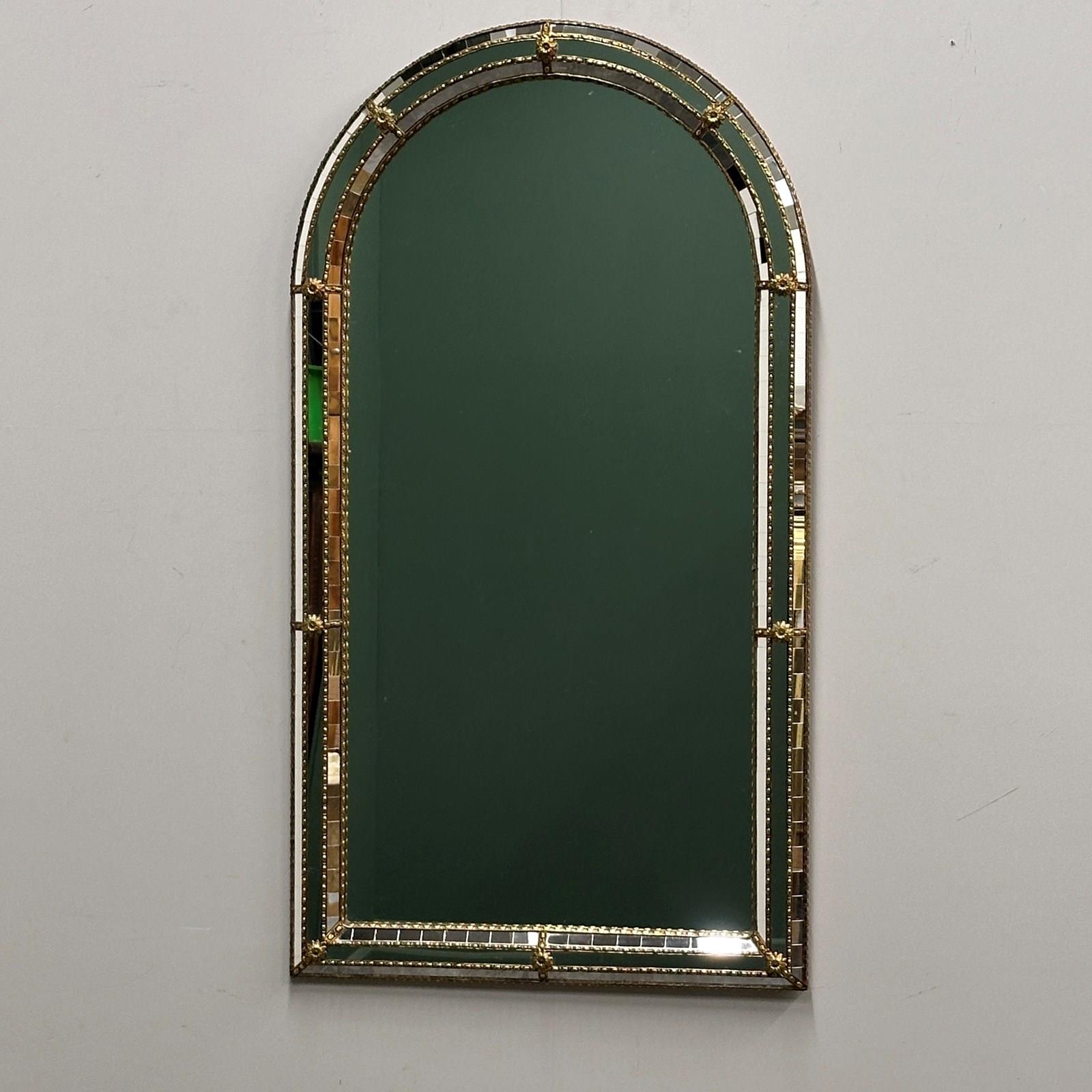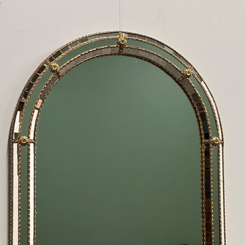 This beautiful 1980s Spanish mosaic mirror adds an instant touch of glamour and craftsmanship to any interior. The arched silhouette is framed with meticulously hand-laid mirrored mosaic tiles in warm gold, bronze, and smoked tones, accented with delicate gilt floral details that create a refined, jewel-like border. Its sculptural presence and shimmering surface make it an eye-catching statement piece—perfect for hallways, dressing rooms, living rooms, or boutique spaces looking for elegant visual interest.