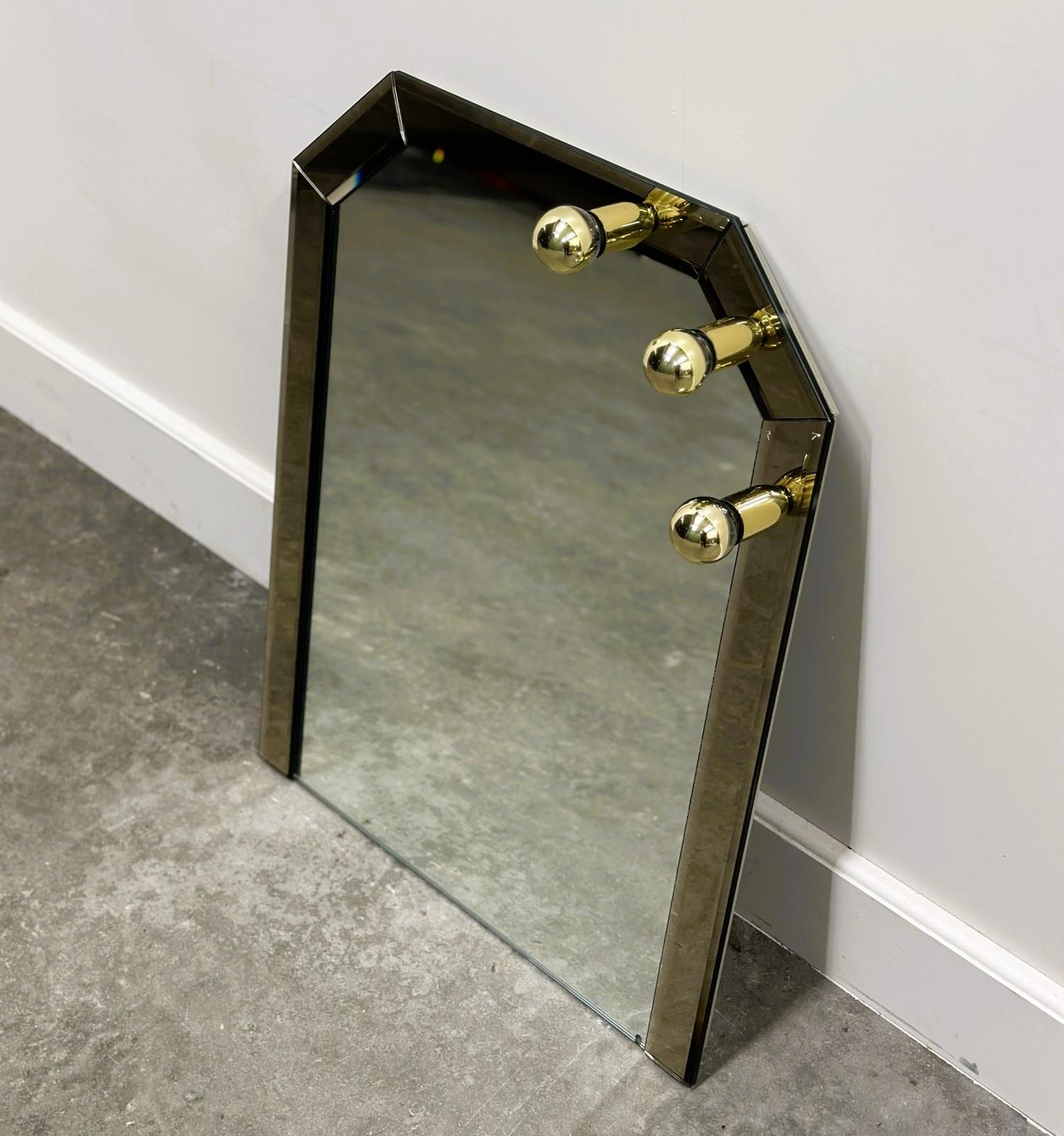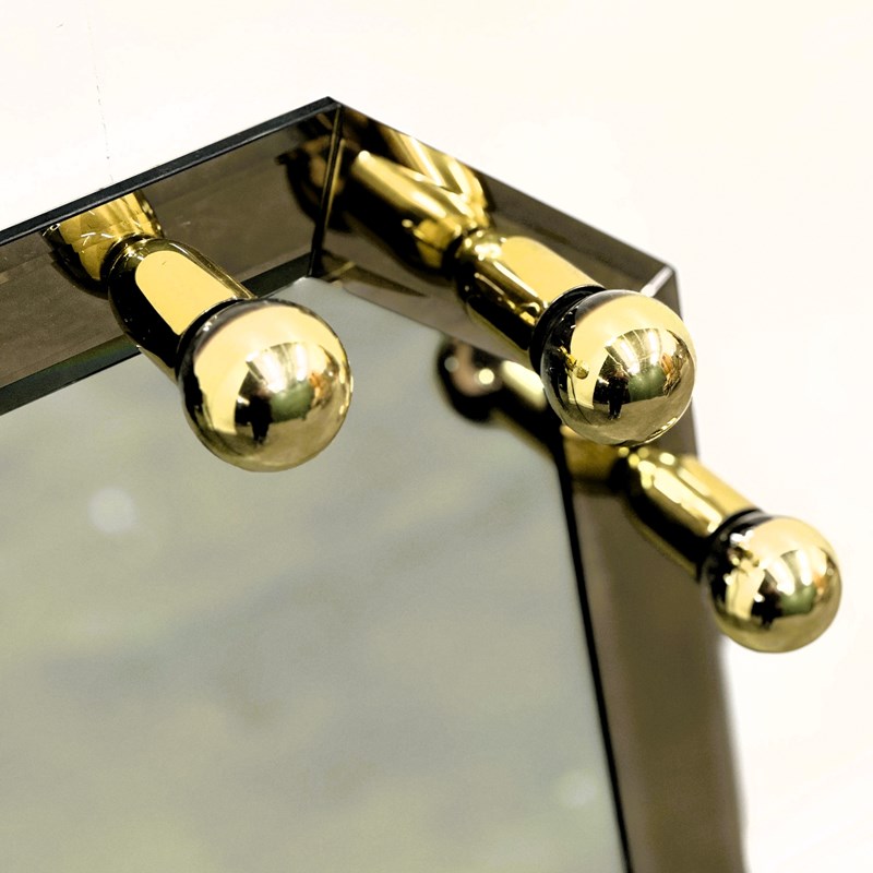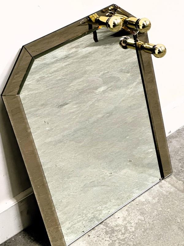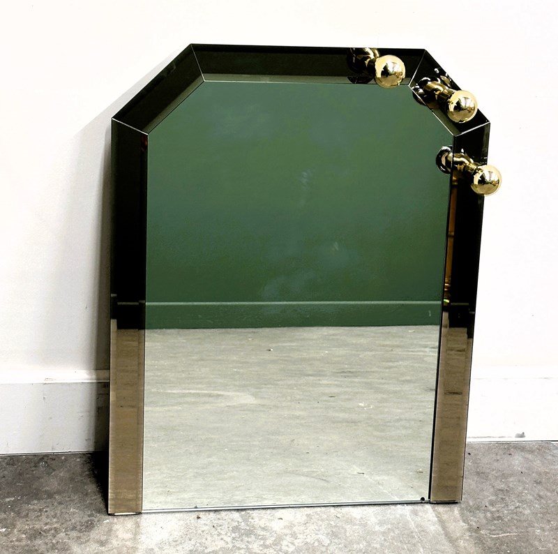Elegant vintage German wall mirror from the 1980s, featuring a distinctive architectural silhouette with a faceted top and thick smoked mirror glass. The frame is accented with refined brass detailing and finished with three sculptural brass knobs that add a bold decorative and functional touch. The smoked mirror surface gives a warm, atmospheric reflection, perfectly in line with late-modernist and Hollywood Regency influences of the era. A striking yet refined piece that blends geometry, glamour, and craftsmanship.