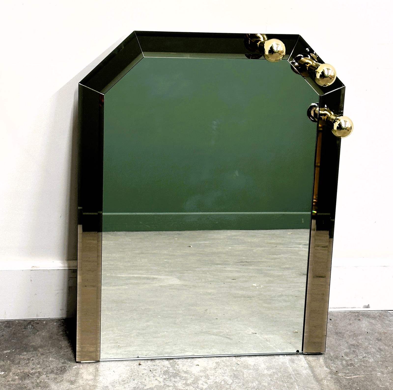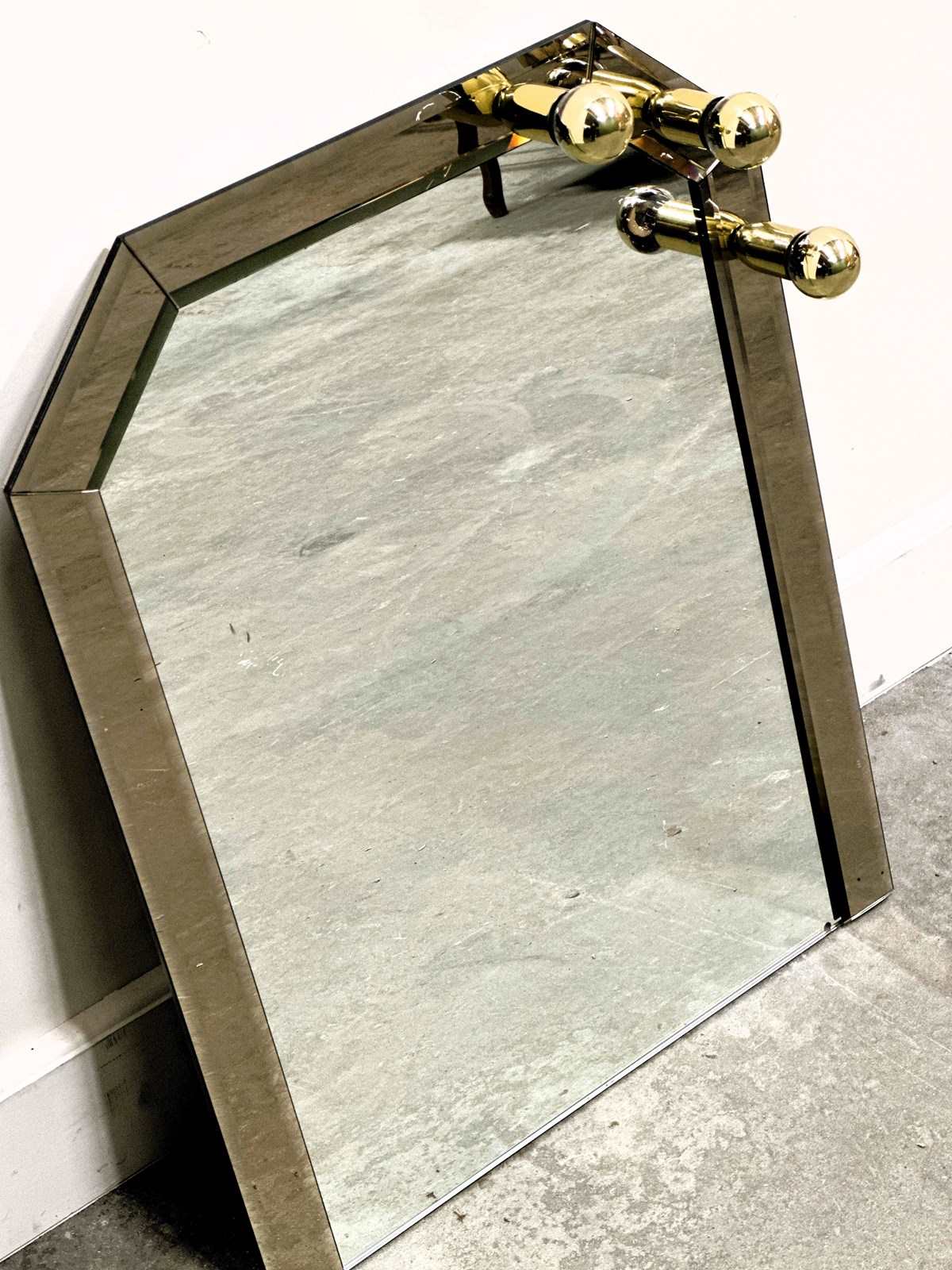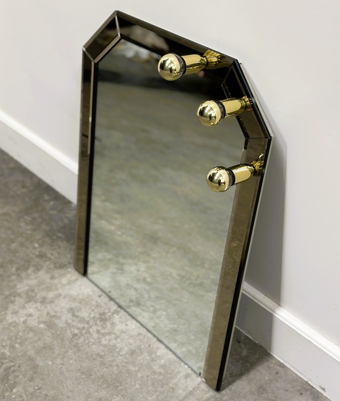 Vintage German Brass & Smoked Mirror With Architectural Faceted Top, 1980S.