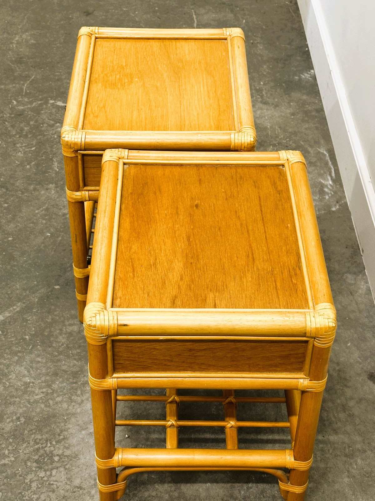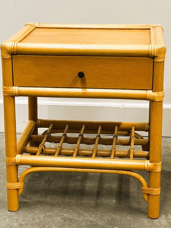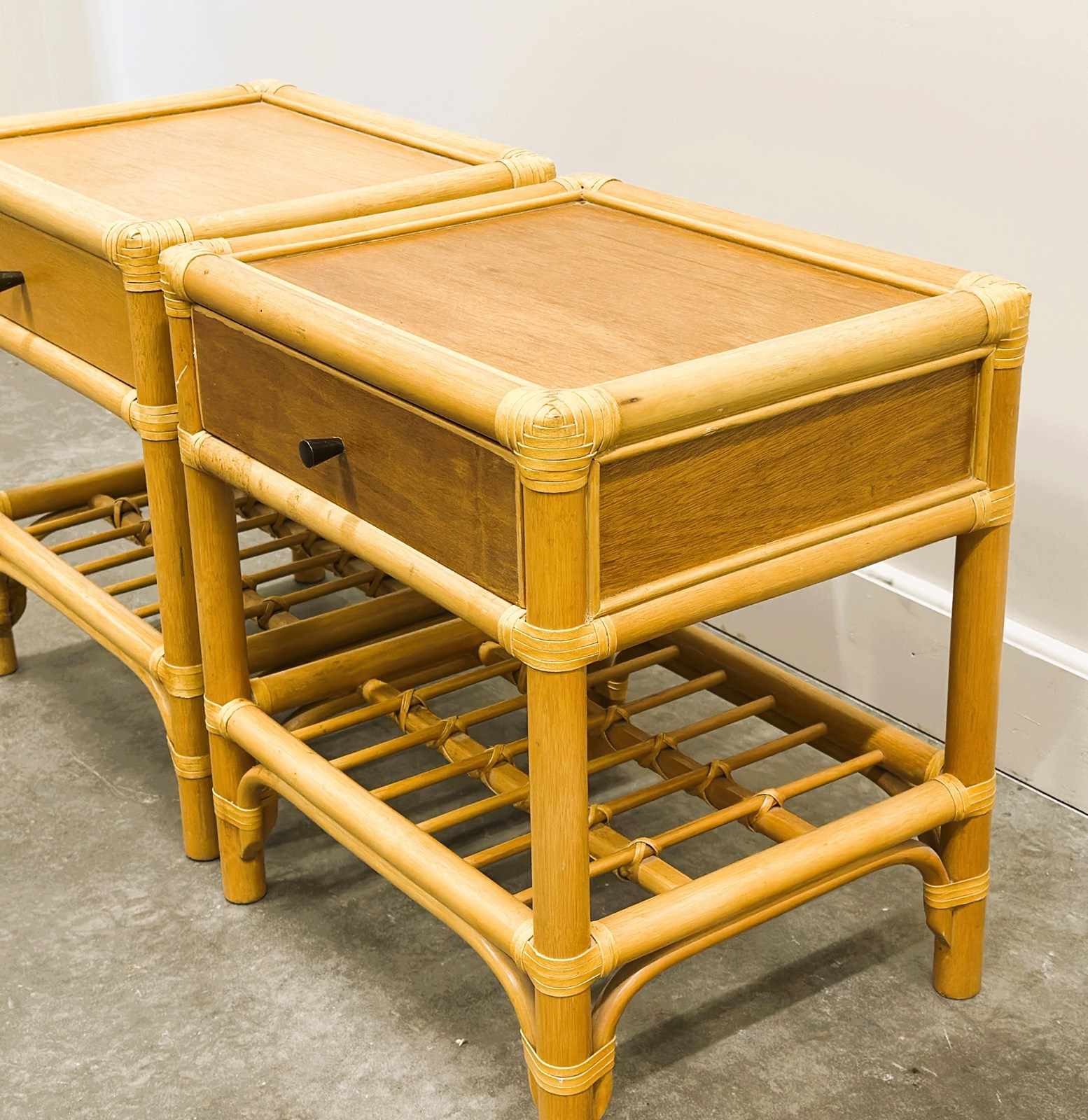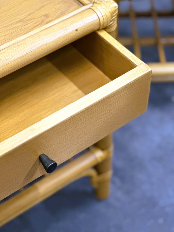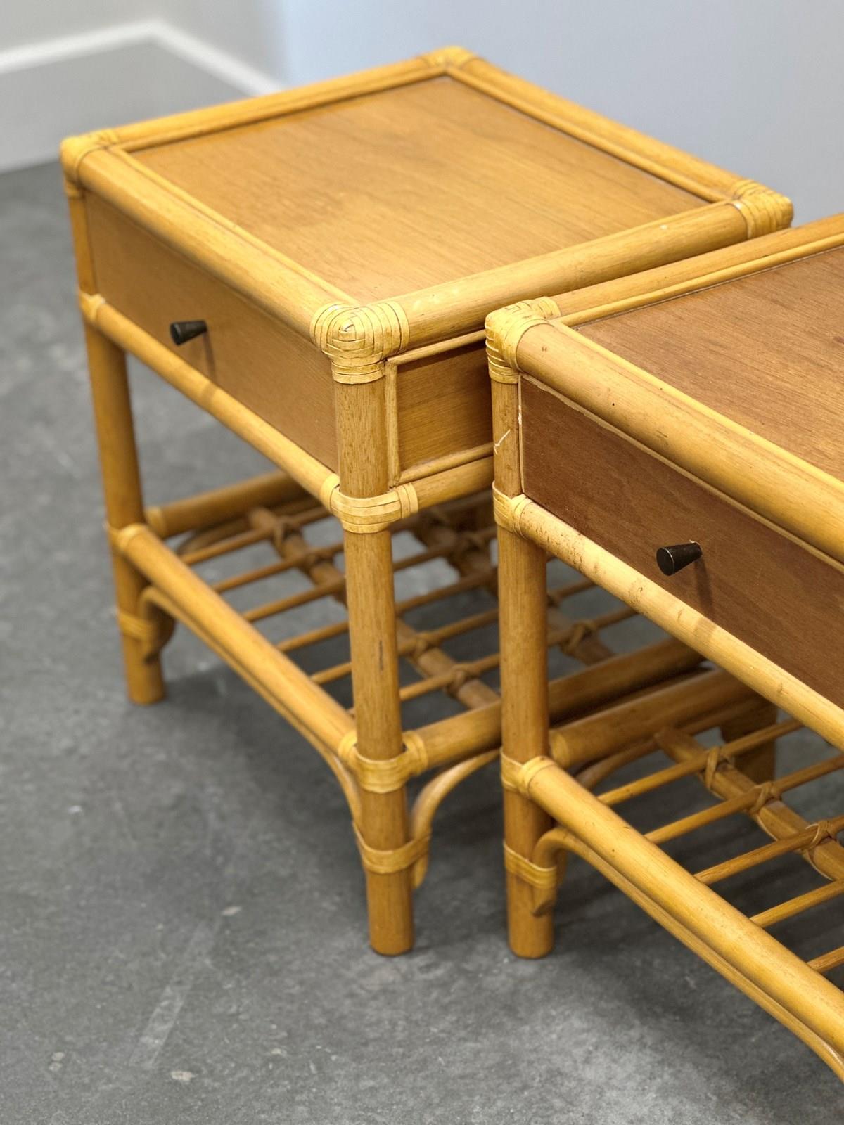 bamboo table, bedside table, French vintage, 1970s style, boho decor, rattan style, brass knob, coastal interior, natural materials, nightstand pair, vintage bamboo, midcentury vibe, drawer table