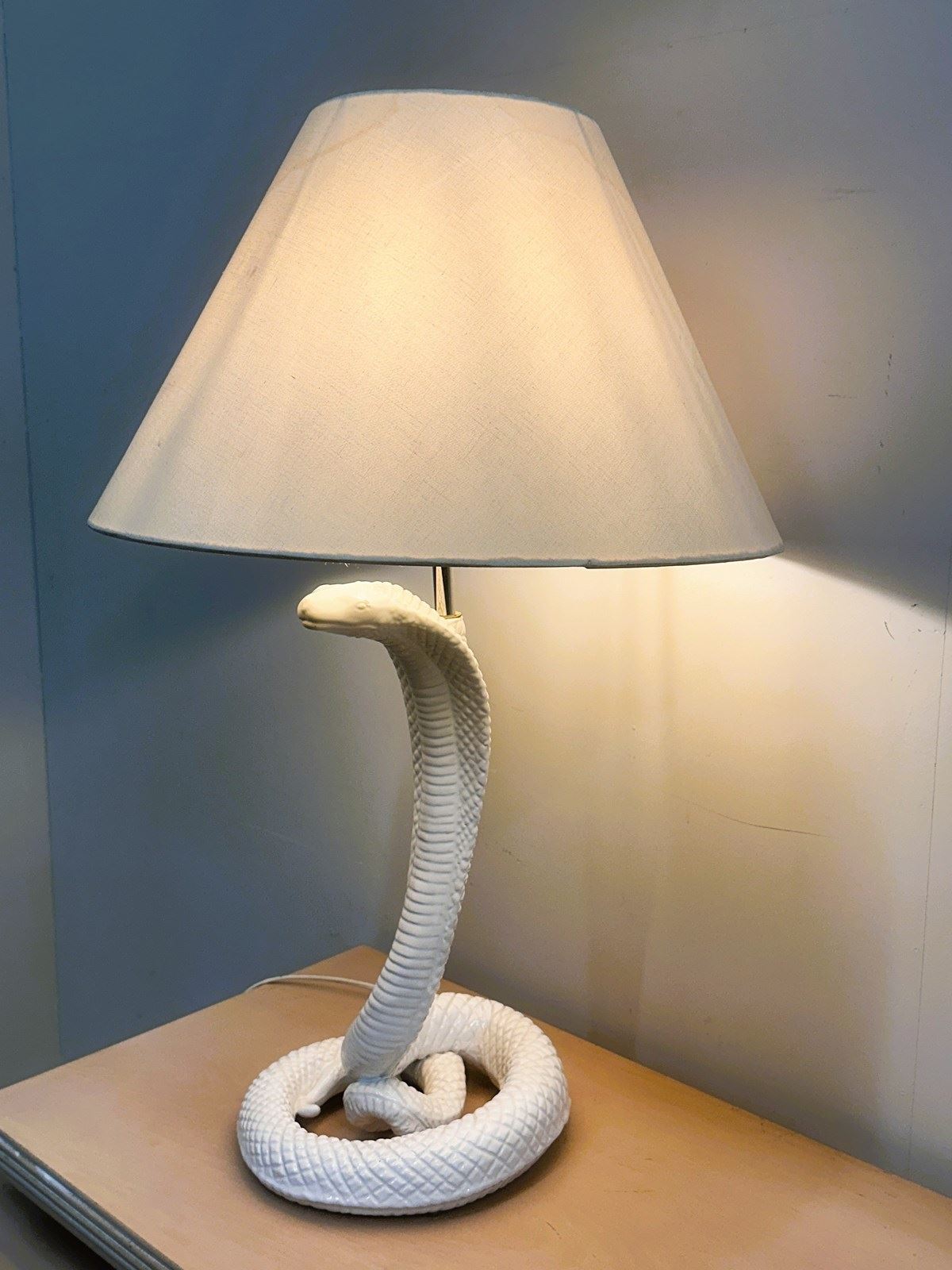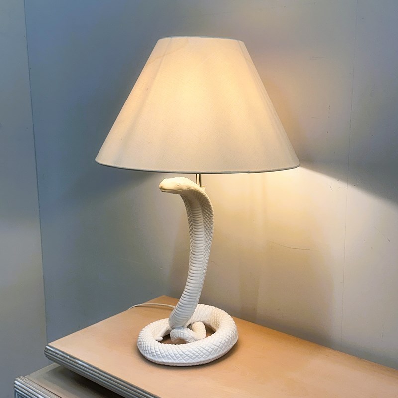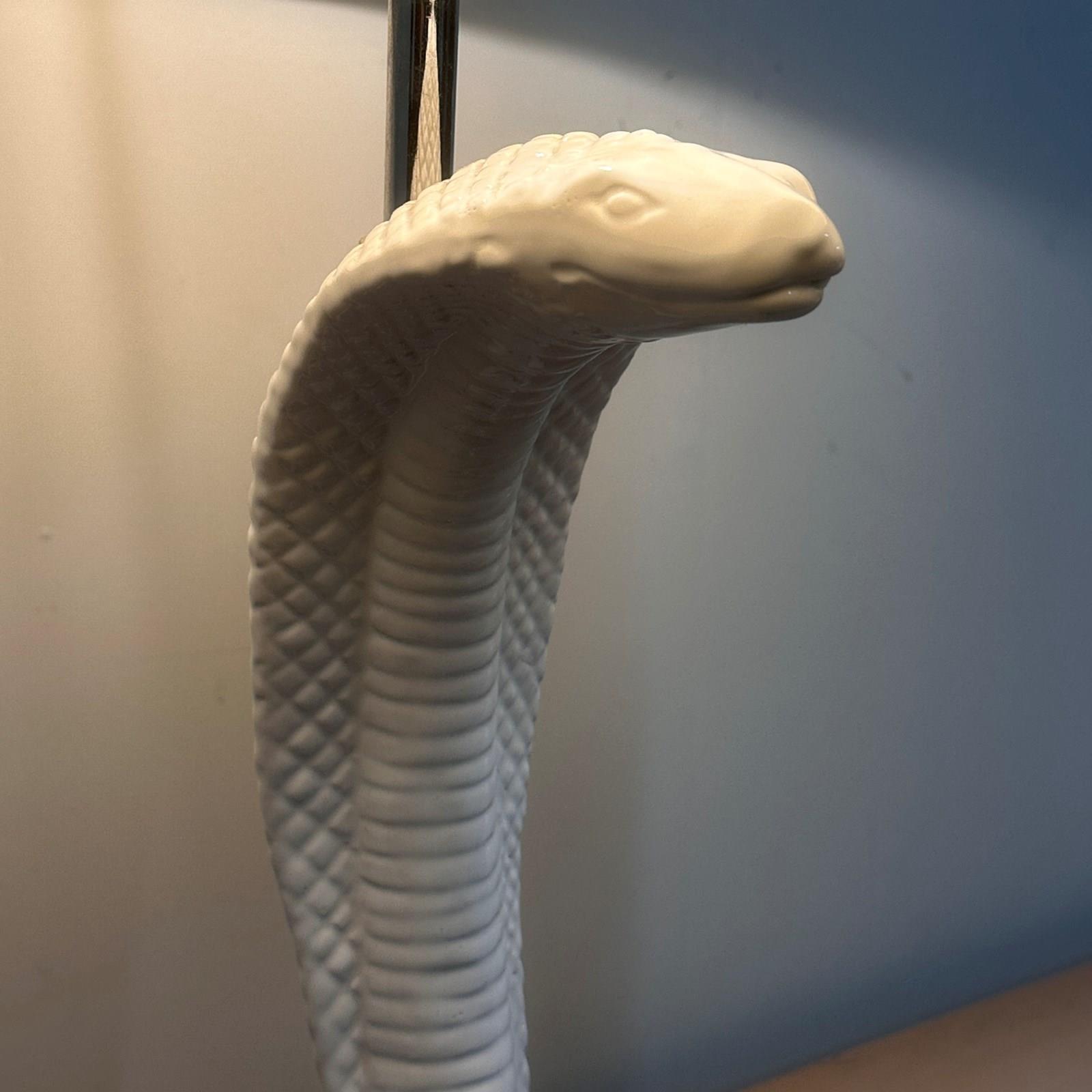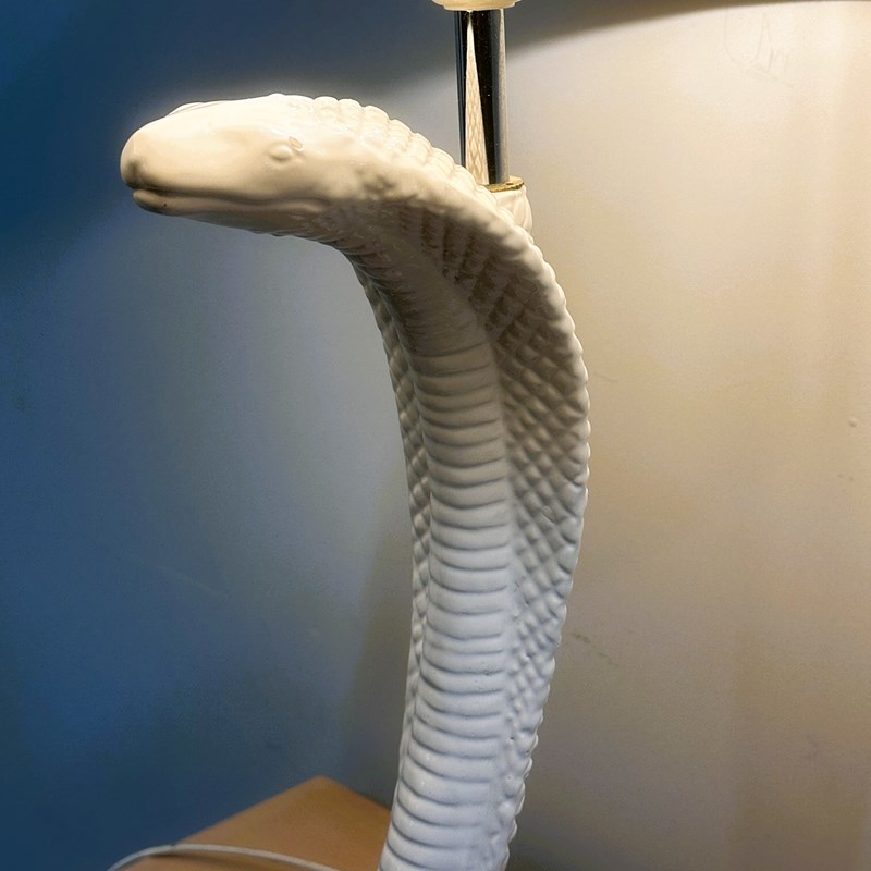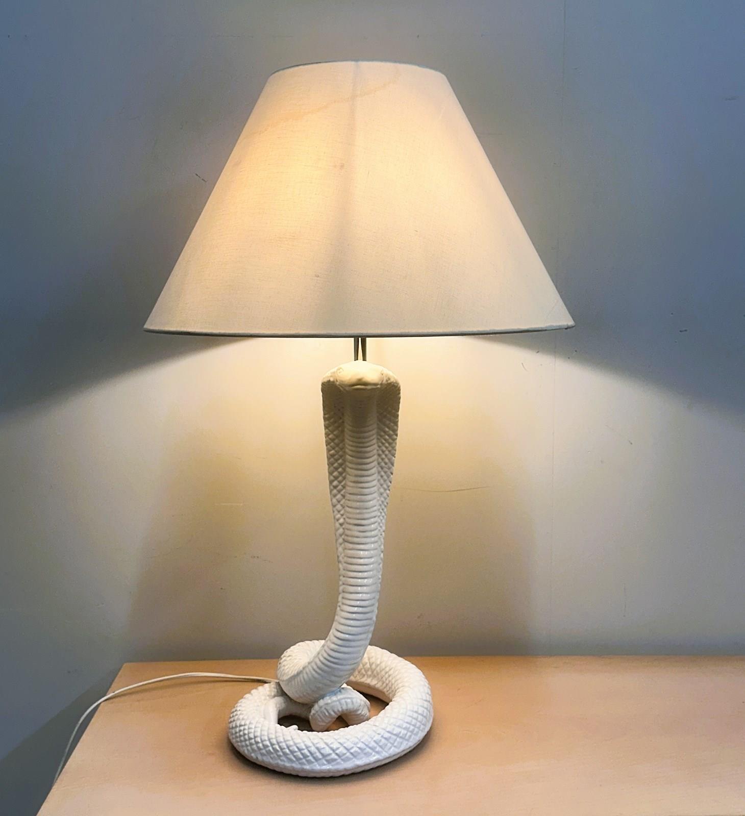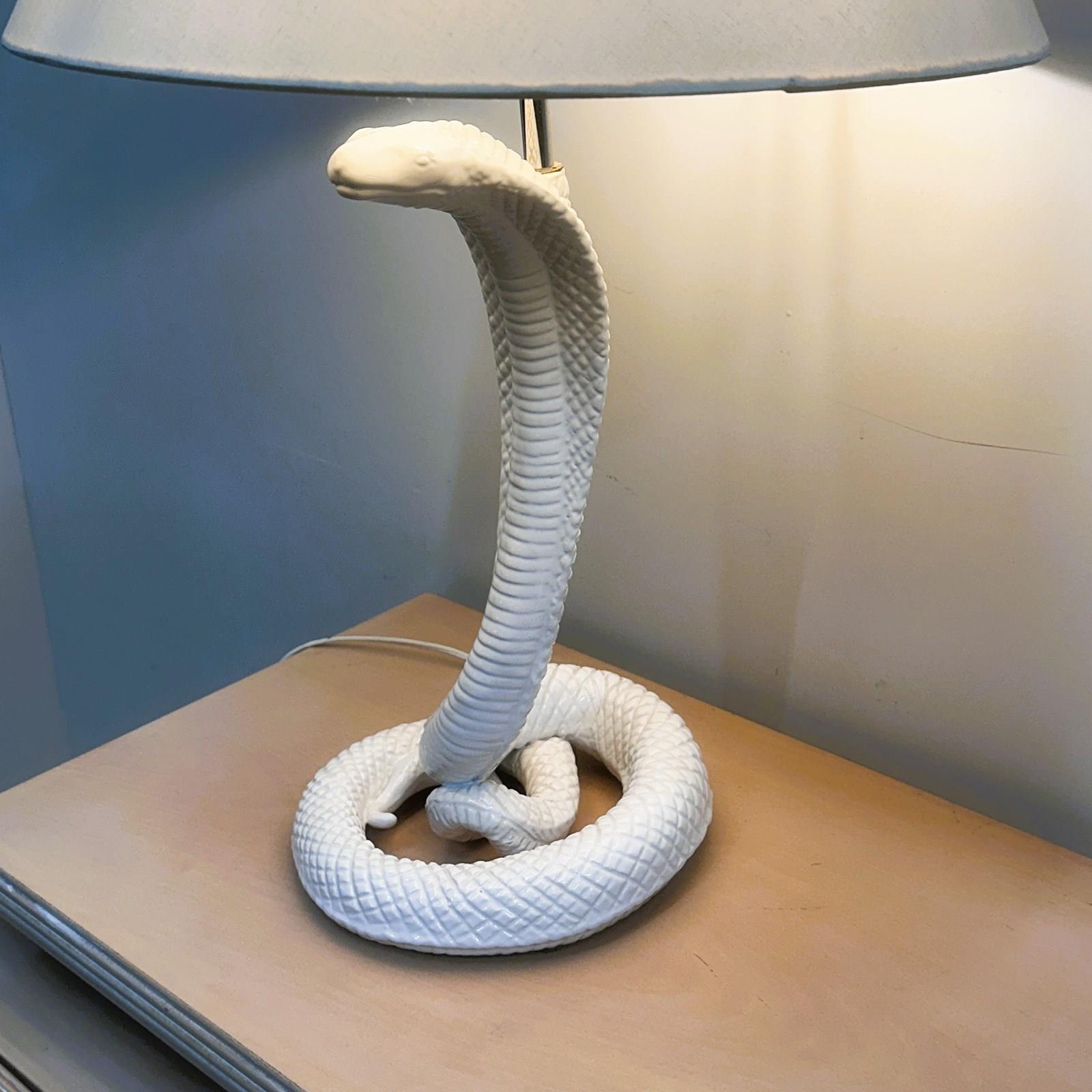 A spectacular 1970s ceramic cobra lamp attributed to Tommaso Barbi, known for his glamorous sculptural designs and bold organic forms. This striking serpent lamp is crafted with exquisite scale detailing and a glossy white glaze, rising dramatically from a coiled base in true Barbi style. A rare sculptural statement piece that instantly adds Hollywood Regency elegance and high-impact character to any room. Shade is not included, as the original was too damaged and should be replaced.
