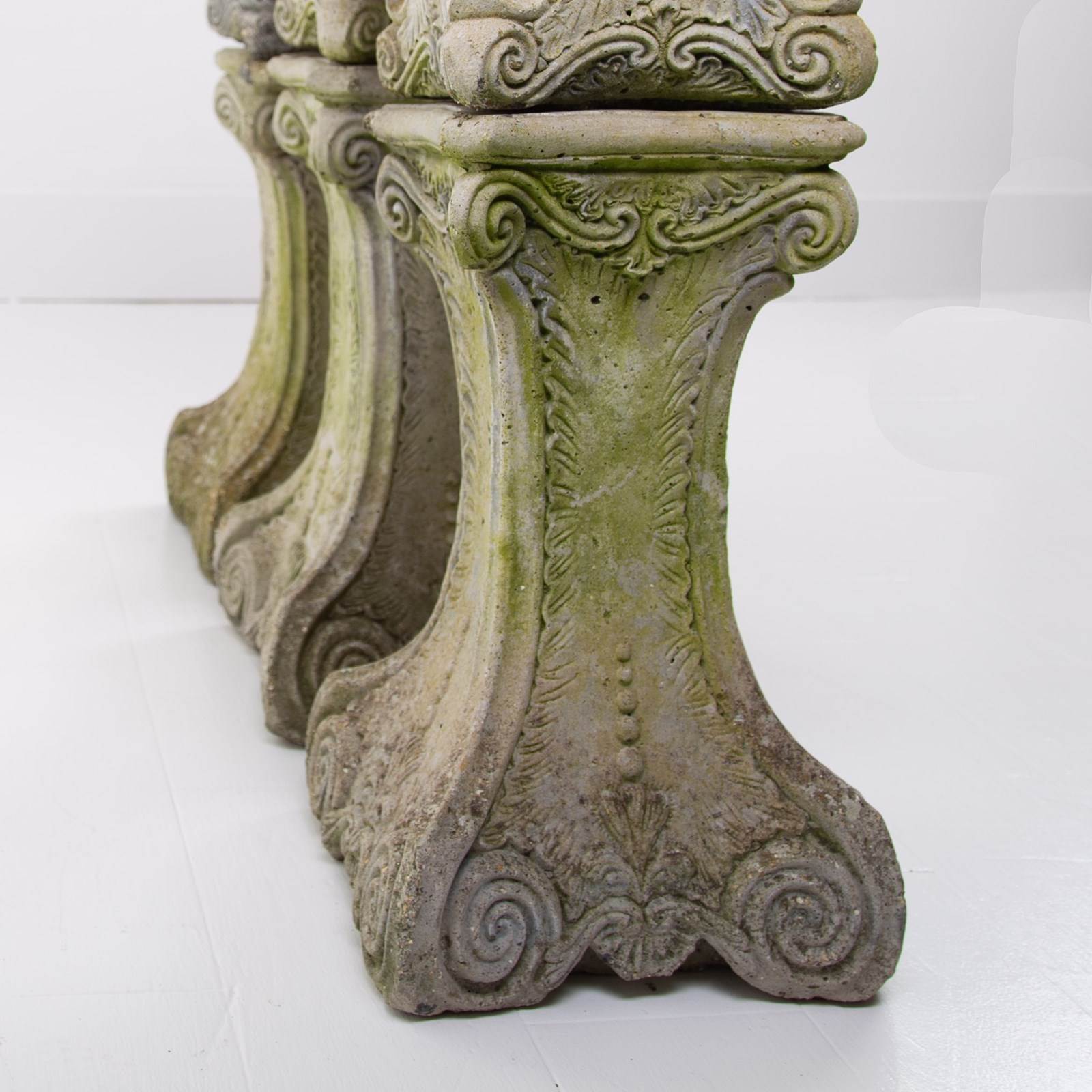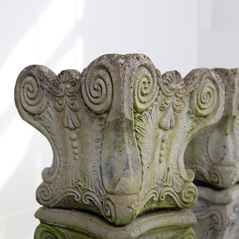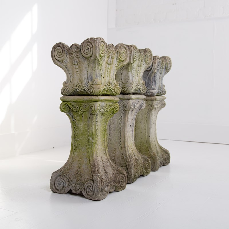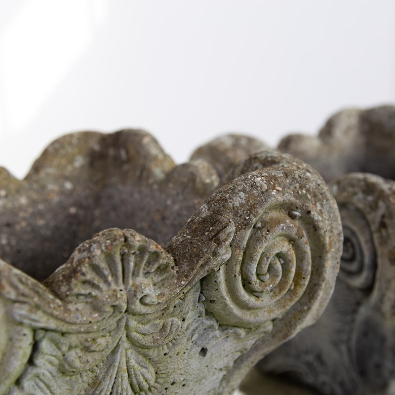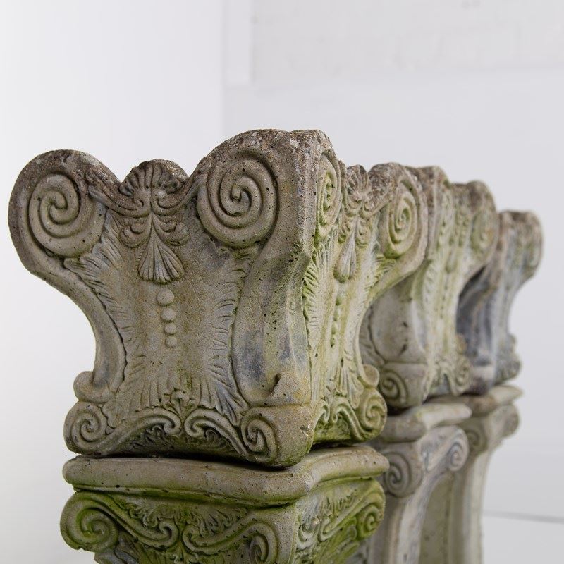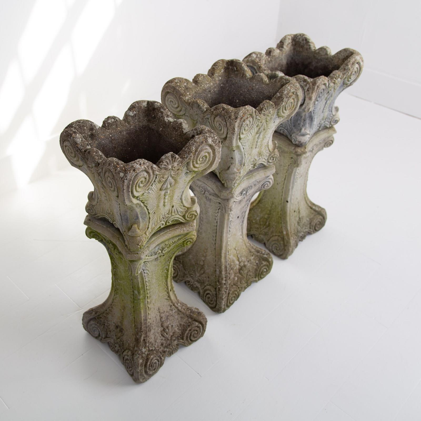A highly ornamental and rather fancy set of 3 reconstituted stone planters with some good aging and patina. These are going to look super planted up for a patio, garden room or terrace.