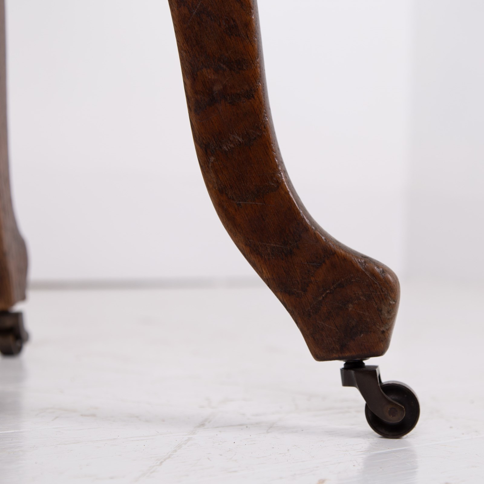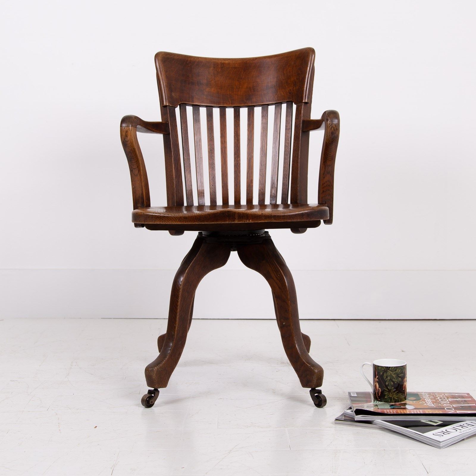 This one sits in lovely historic order with wear in the right places. The swivel mechanism is working well and the shaped seat makes it more comfortable than some. It also is a little smaller than some of its counterparts with a fixed seat height. We have lightly waxed the chair and ensured it is ready for use.