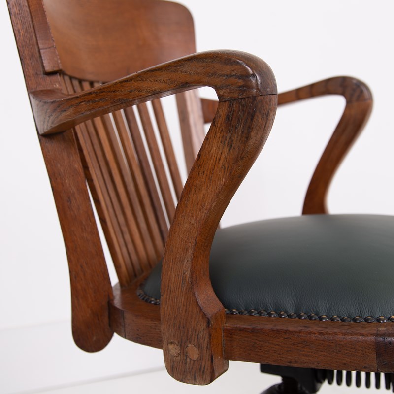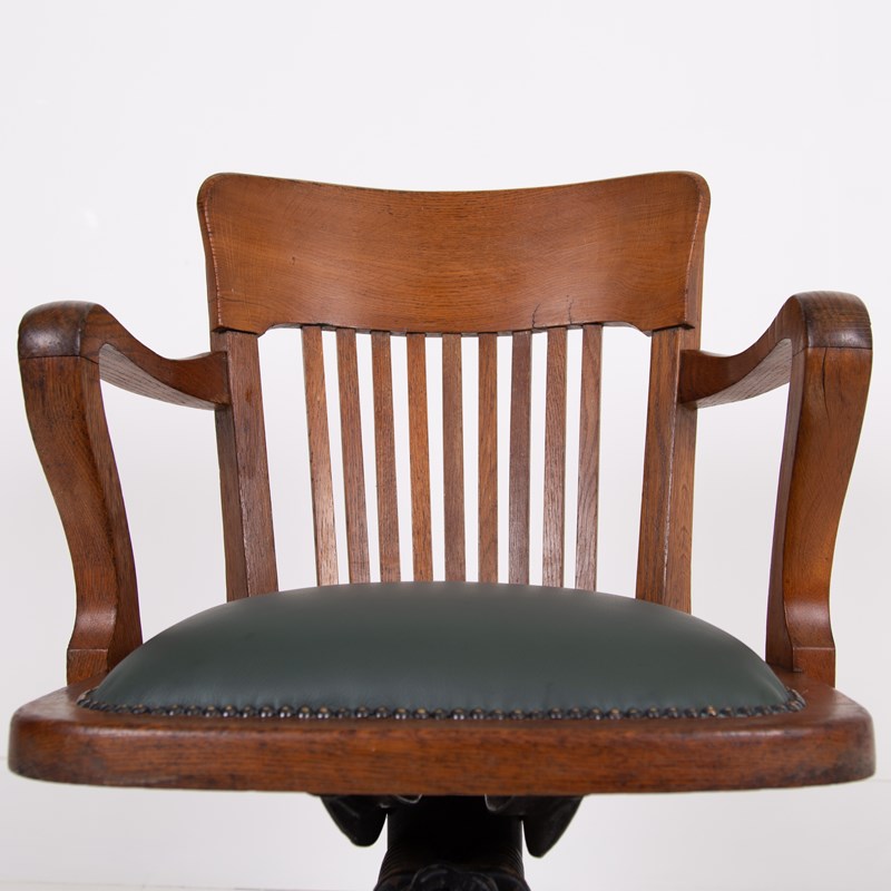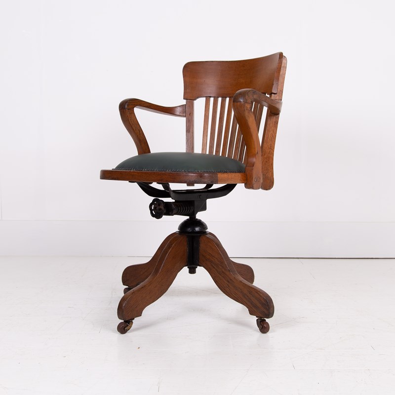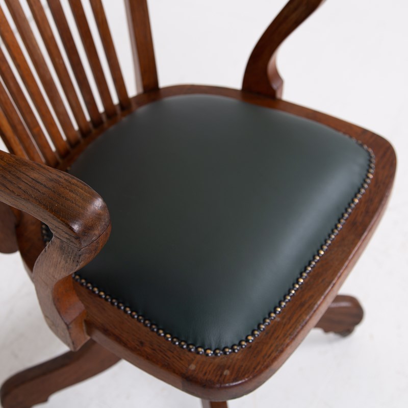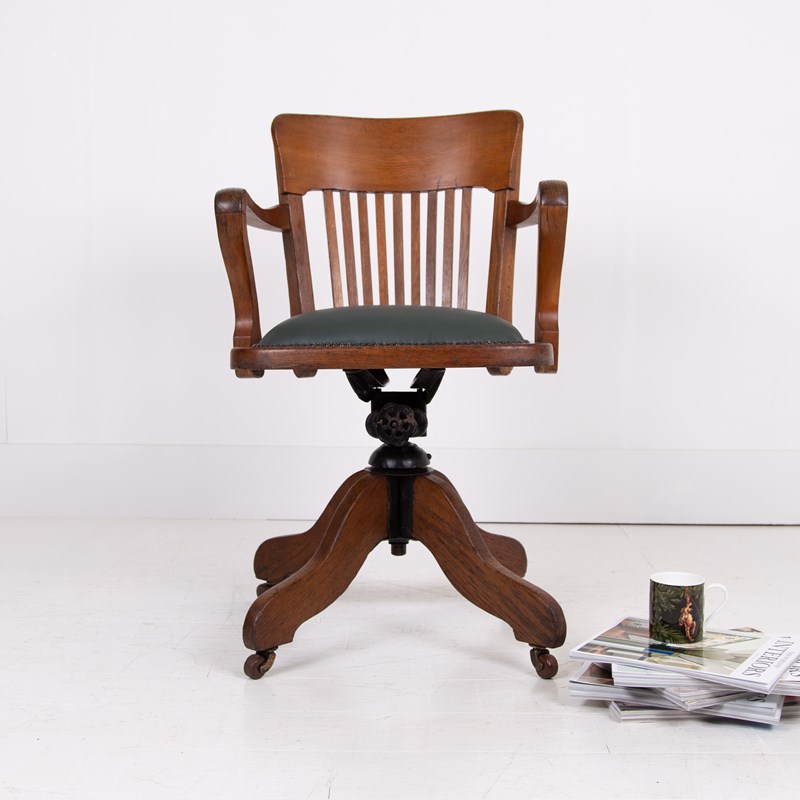 From the Edwardian period, it sits in good historic condition – the frame possesses sensible aging, the seat as mentioned is plump having been reupholstered including webbing etc in a fine green leather hide secured with aged brass studs which will wear a treat The swivel and height mechanisms are working fine with the seat rotating. Expect pleasing day to day wear on the frame. We have waxed the oak on the frame and base, so very much ready to place…