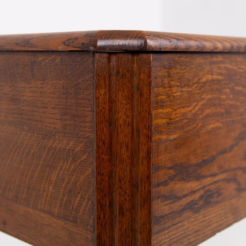 A charming little 1930s English oak side table with its deco inspired parquetry top using different tones of oak and walnut. We have not come across one before so here it is with its deco shaped legs and useful storage.