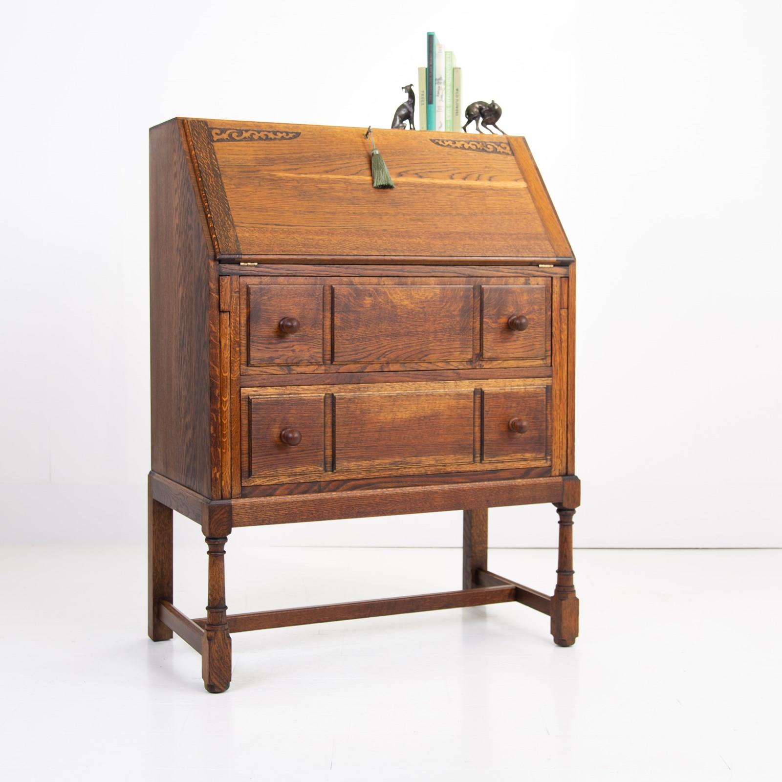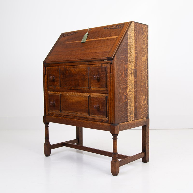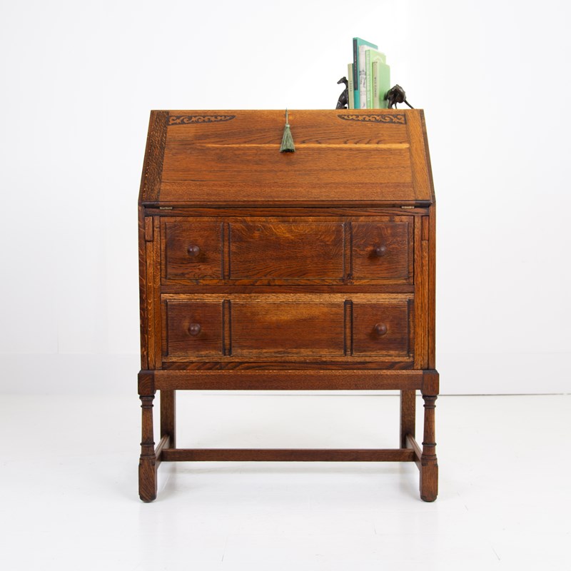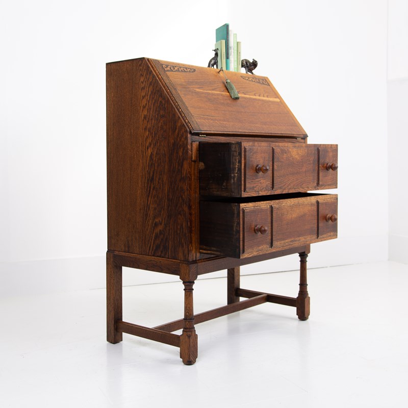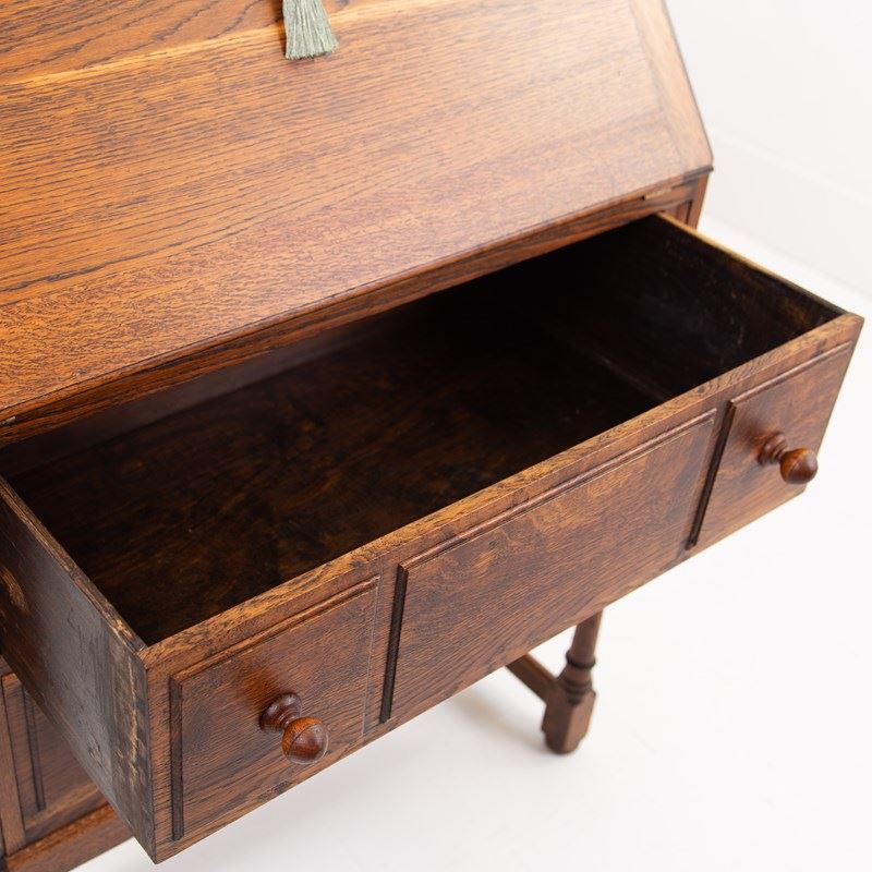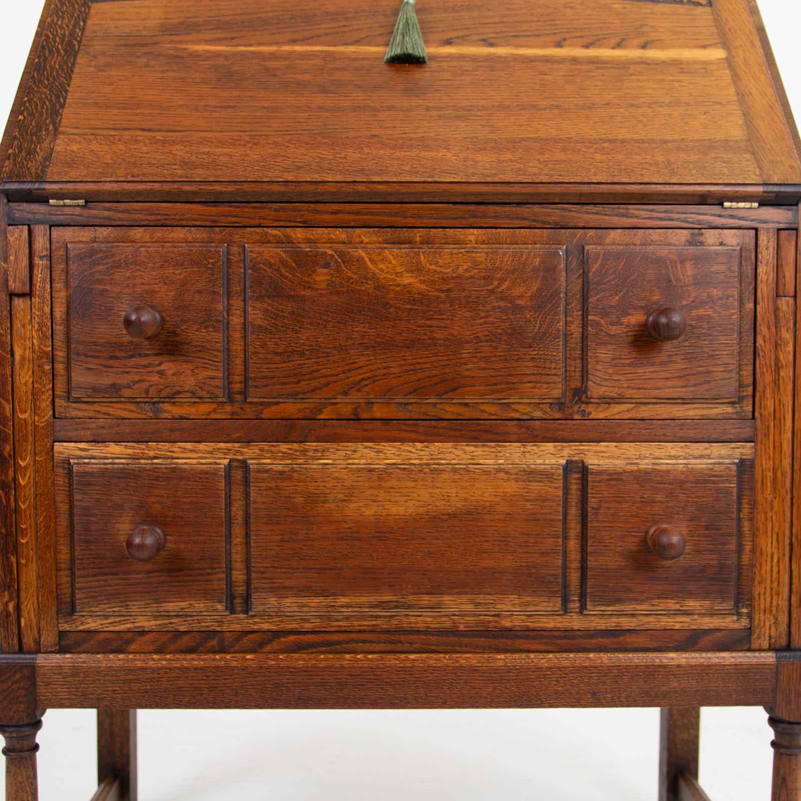 A highly attractive and fine quality early 1930s solid English oak 2 drawer bureau of smaller proportions than most of its era and sitting in a wonderful condition.