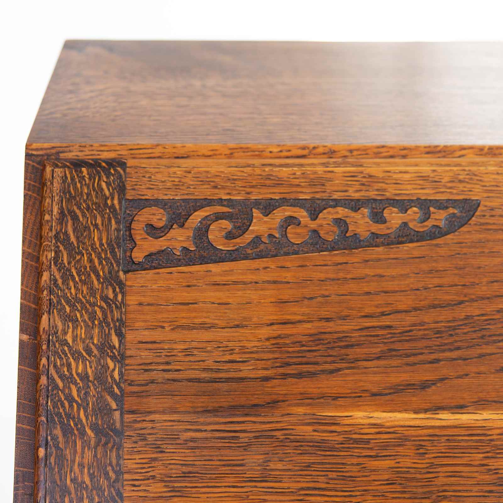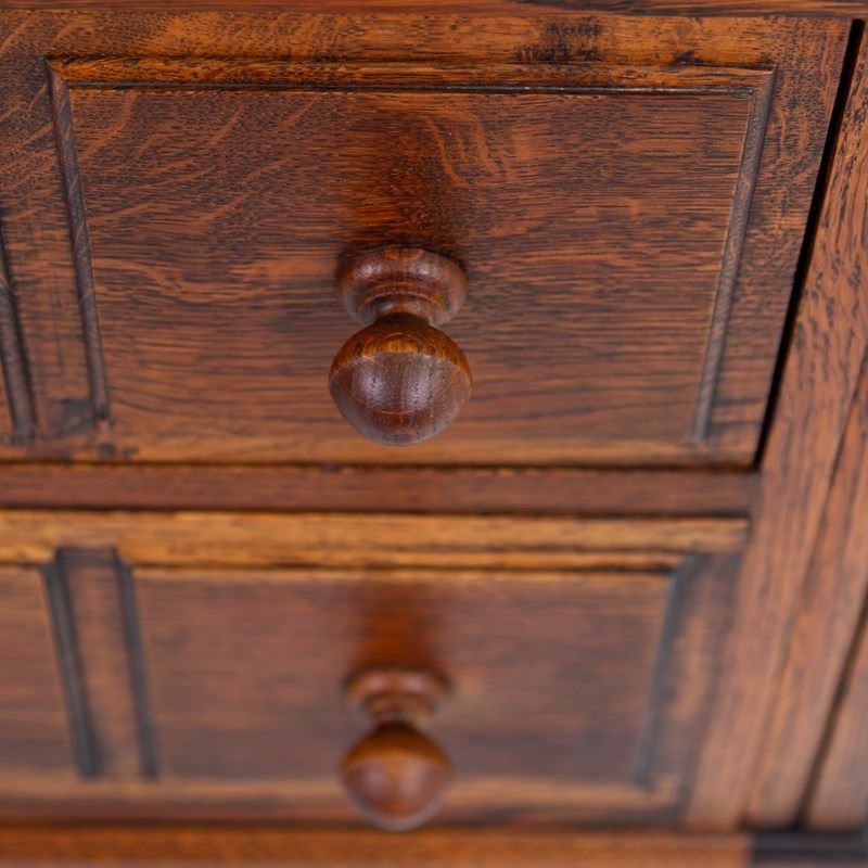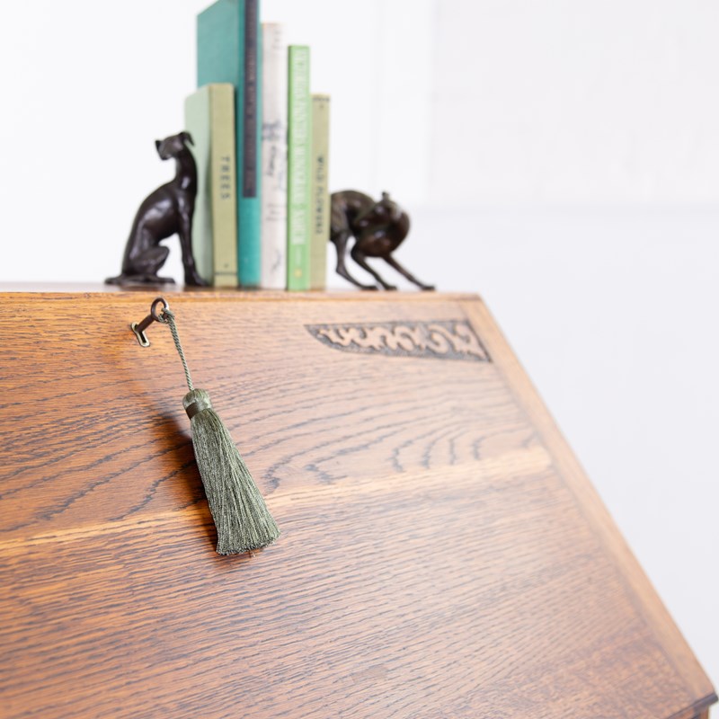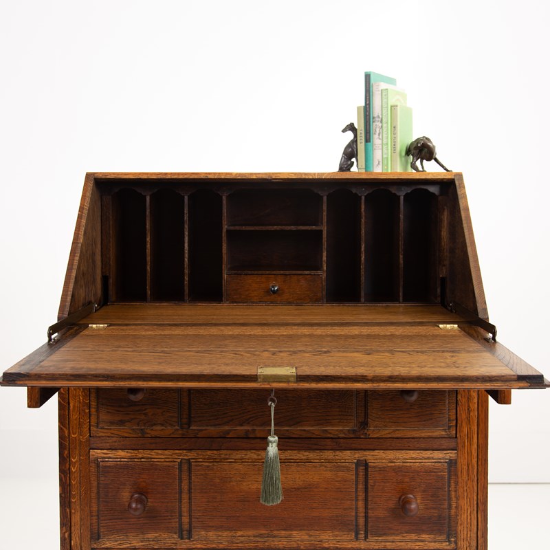 The pigeon holed interior is displayed once the decorative brass hinged oak front is opened which has a working lock and key. The useful 2 drawers with round oak knobs are supported by well turned column style legs. The piece has enjoyed a careful repolish in our workshop so expect light wear and a pleasing tone and rich grain to the oak. Makers label to the inside of the drawer. The piece is ready to place and enjoy.