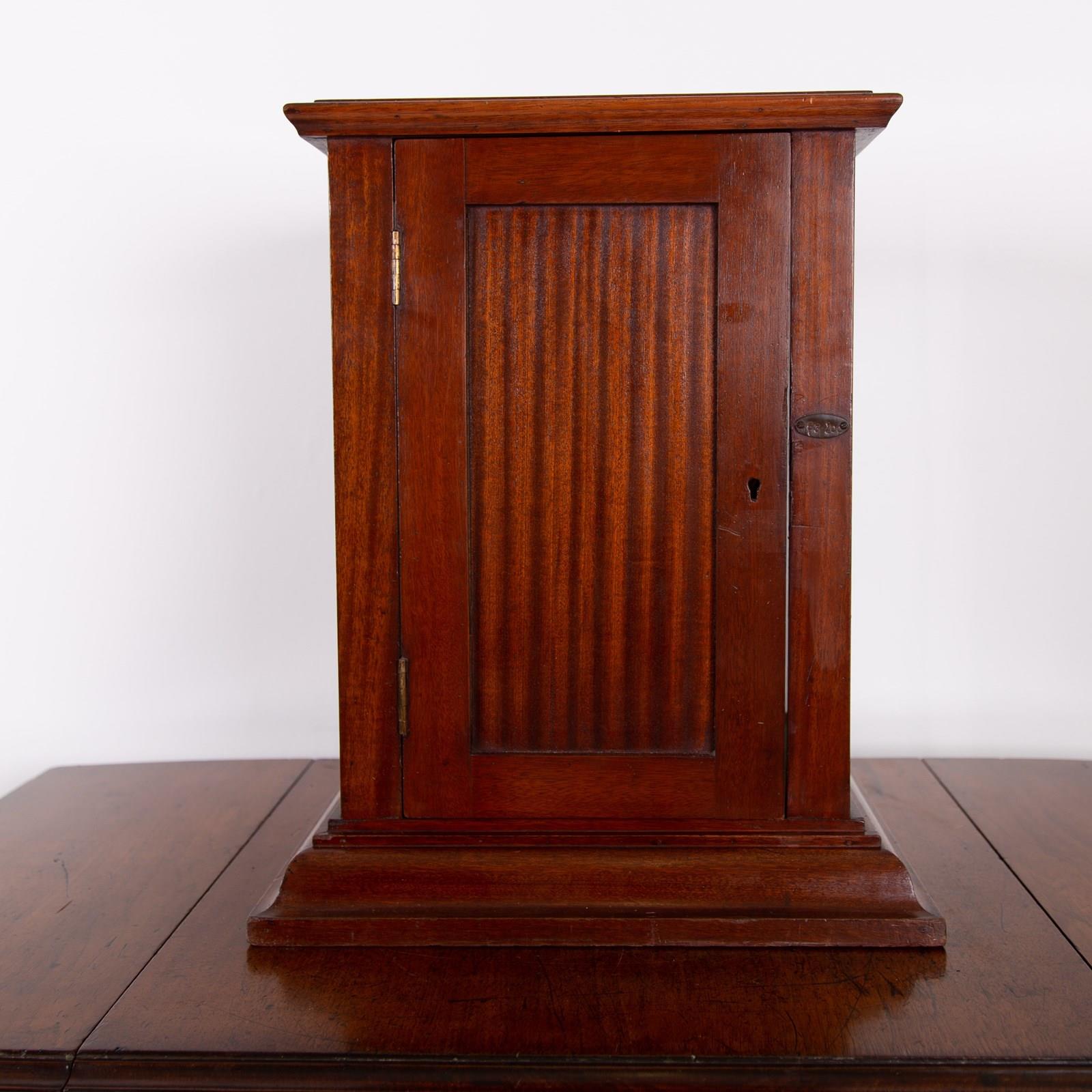 Very nice quality on this glazed display cabinet C1920 which was likely once part of a collection in a school or museum. We have the solid mahogany opening rear door with numbered brass label and a well shaped base and “top”.
