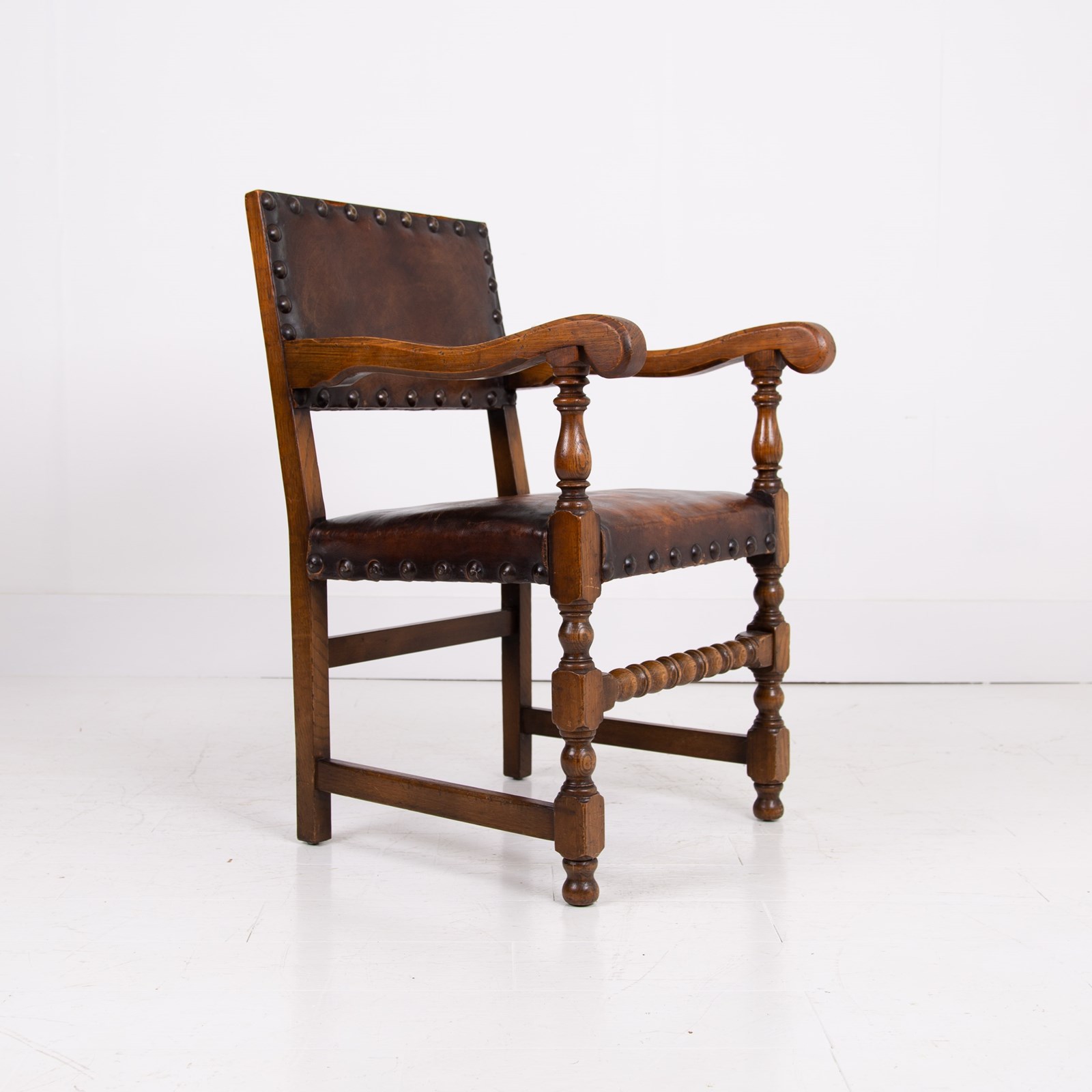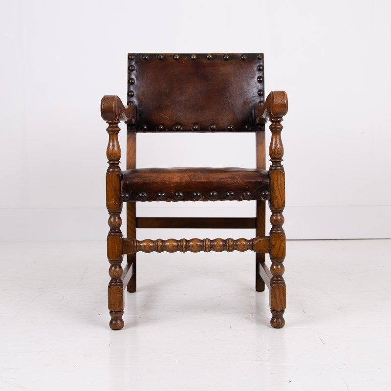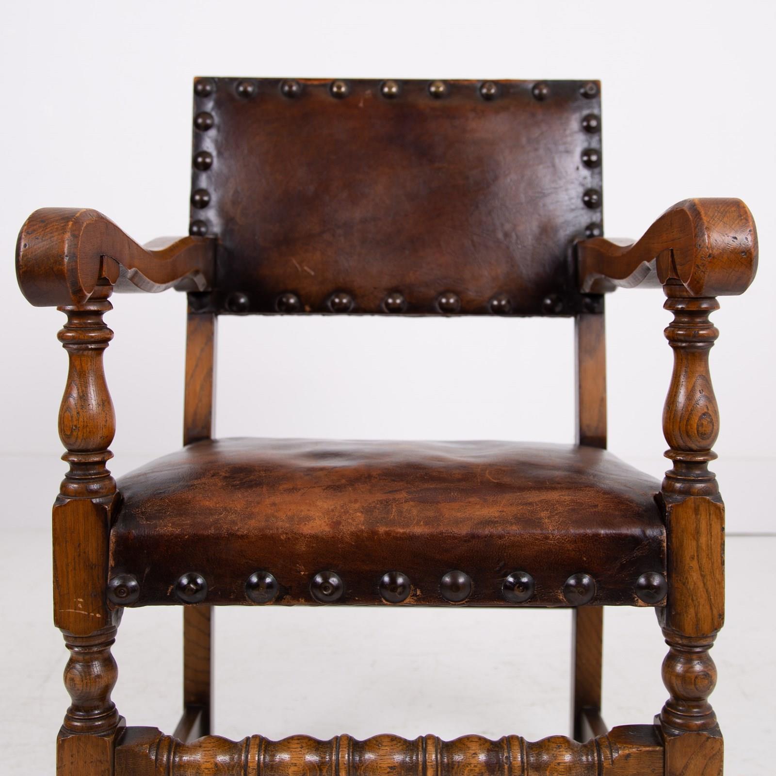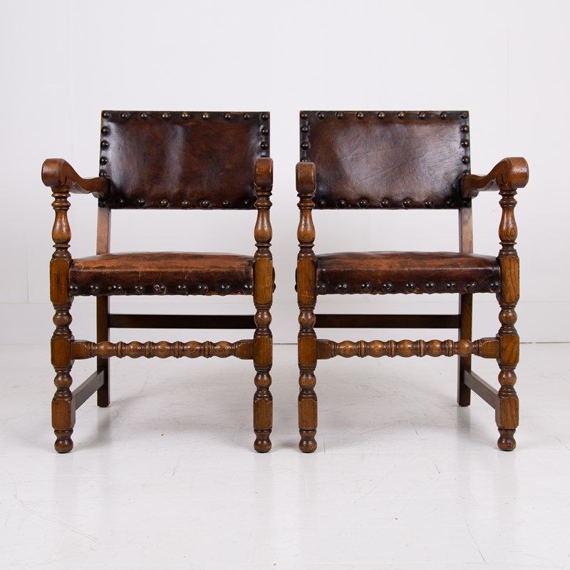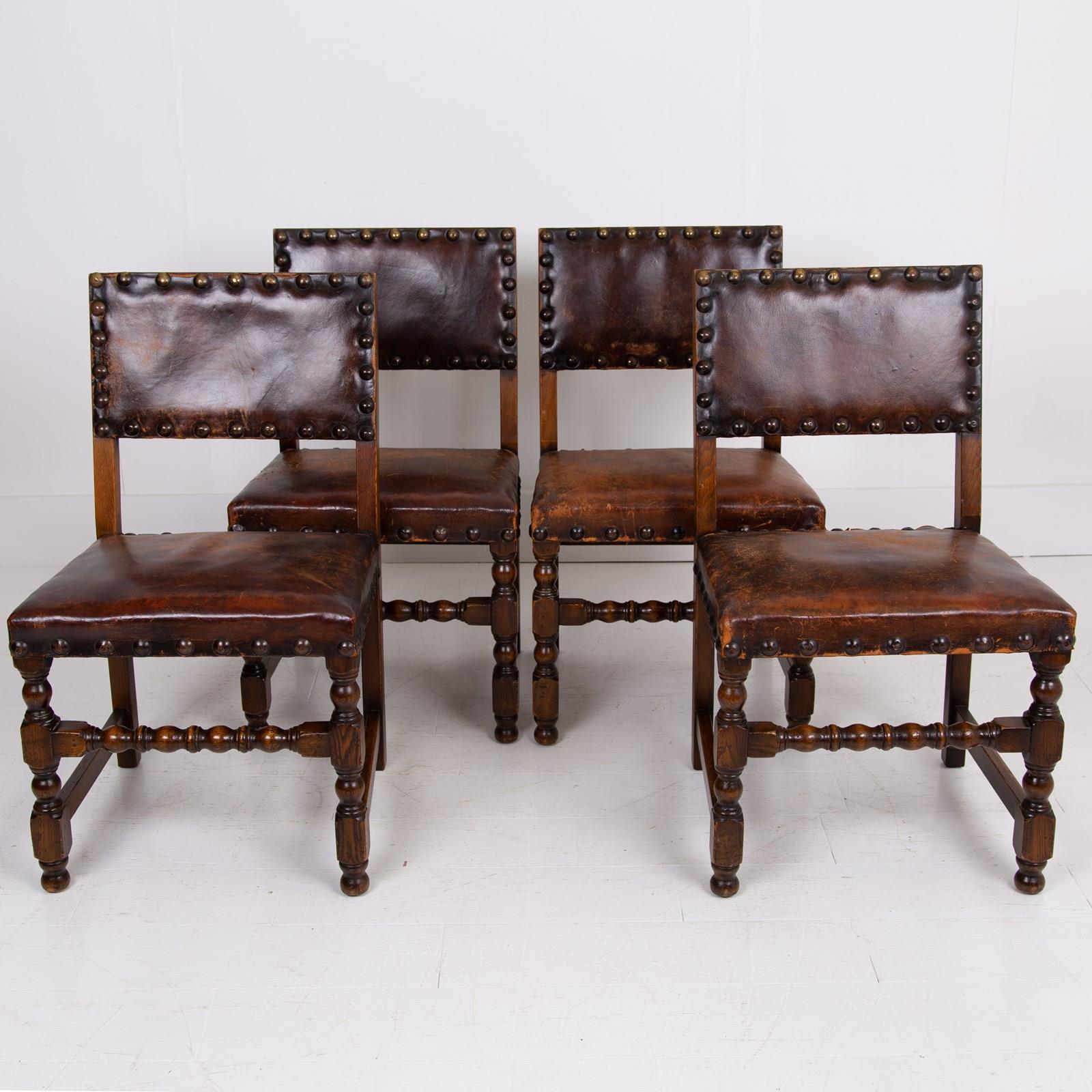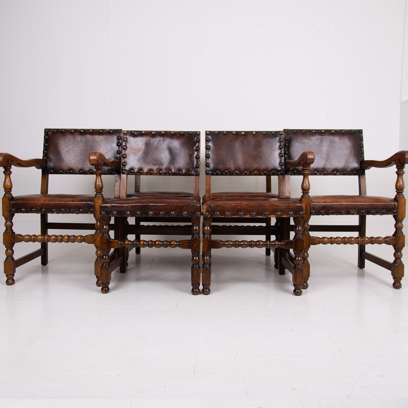 In lovely aged condition, we have a fine quality set of 6 dining chairs C.1930 in English oak with the seats and backs in aged thick brown leather - not only great looking but comfortable.