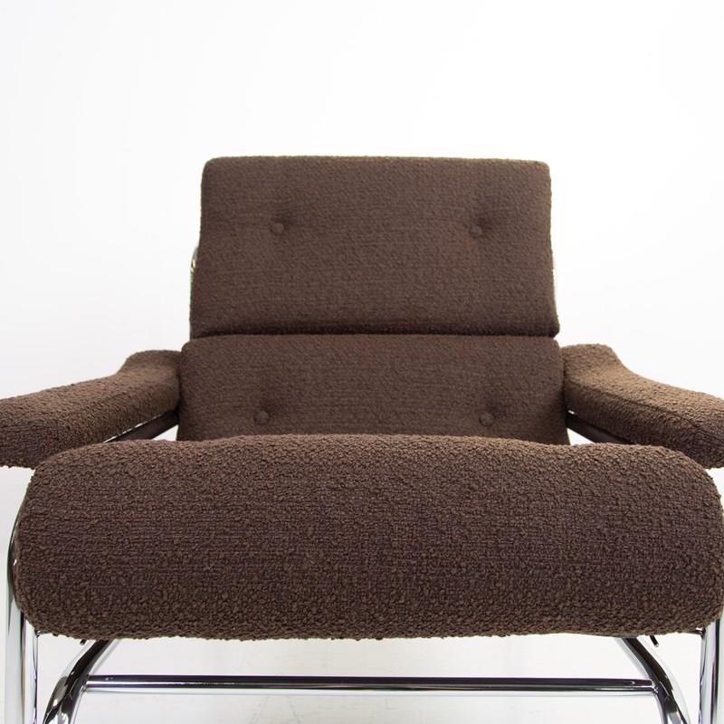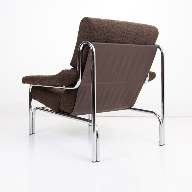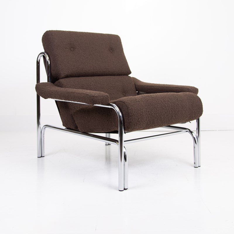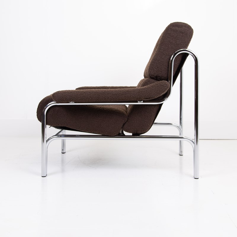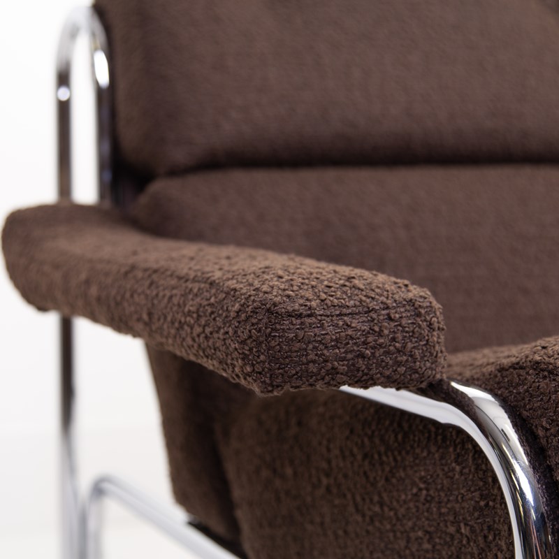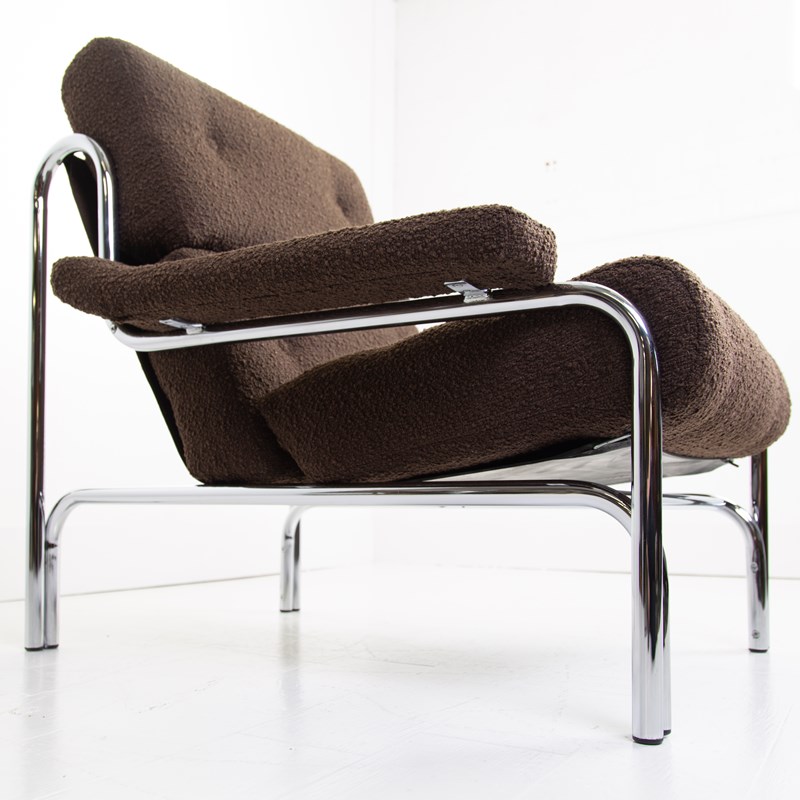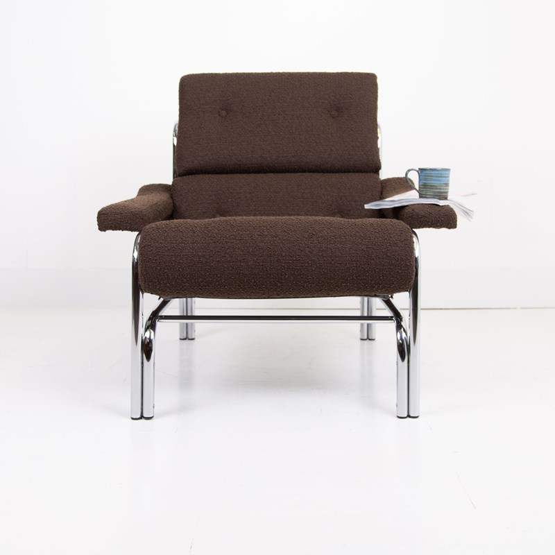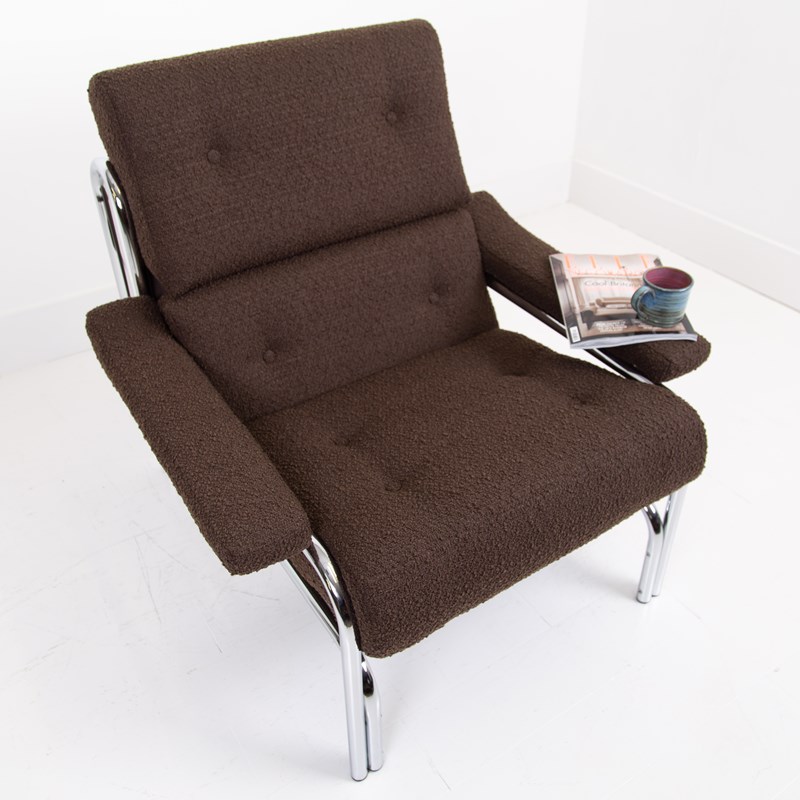 This armchair from the Alpha range by Pieff is presented with its thick set chrome plated tubular metal frame and with the benefit of our upholsterer having made new cushions and arms which are all covered using an espresso coloured Cristina Marrone boucle. It’s looking rather glorious and awaiting a new home.