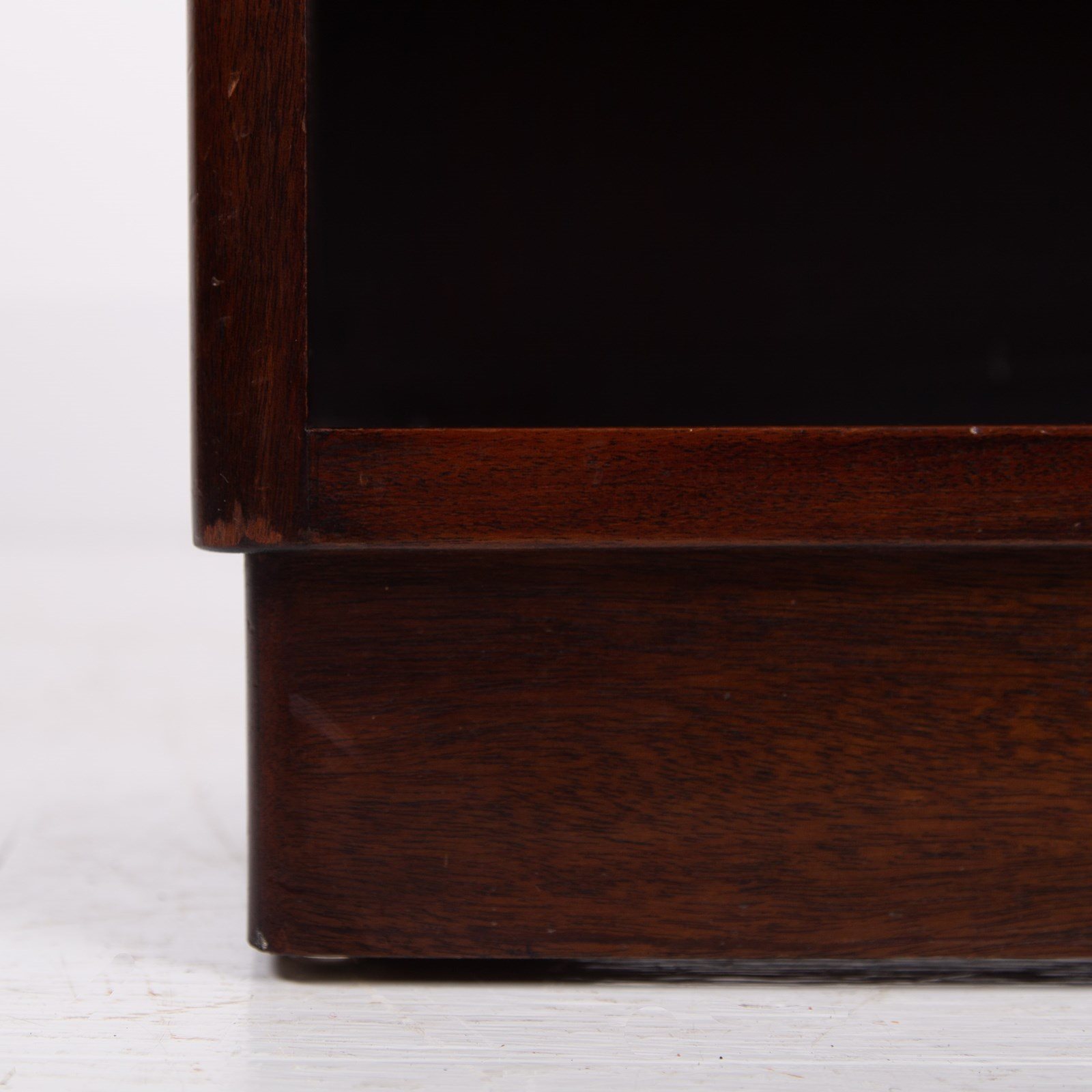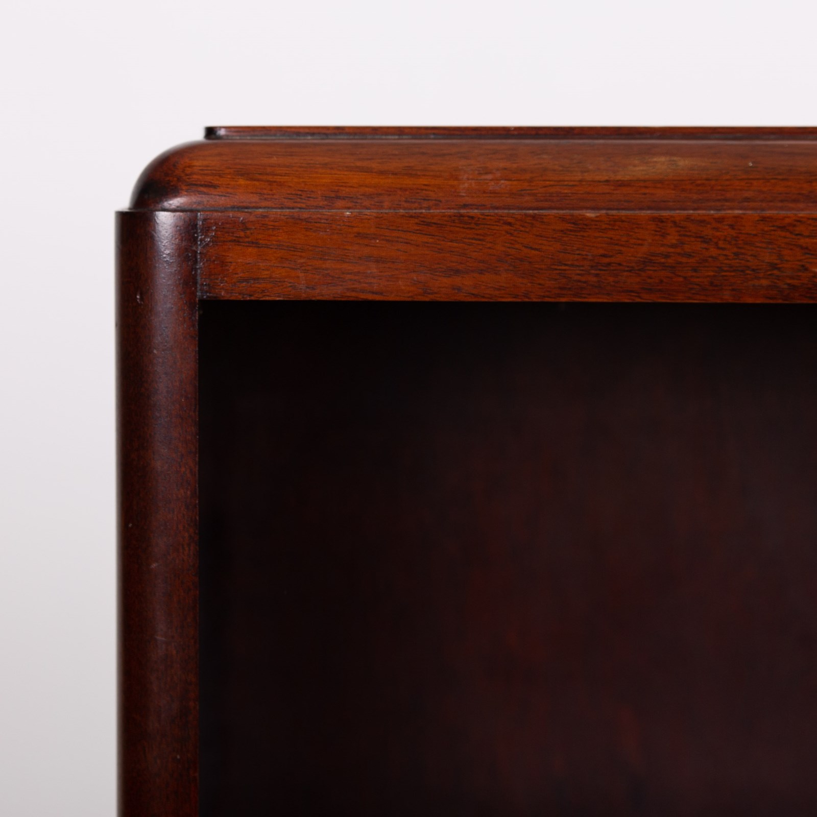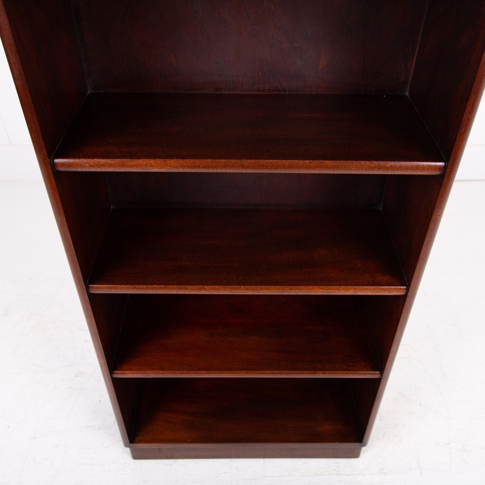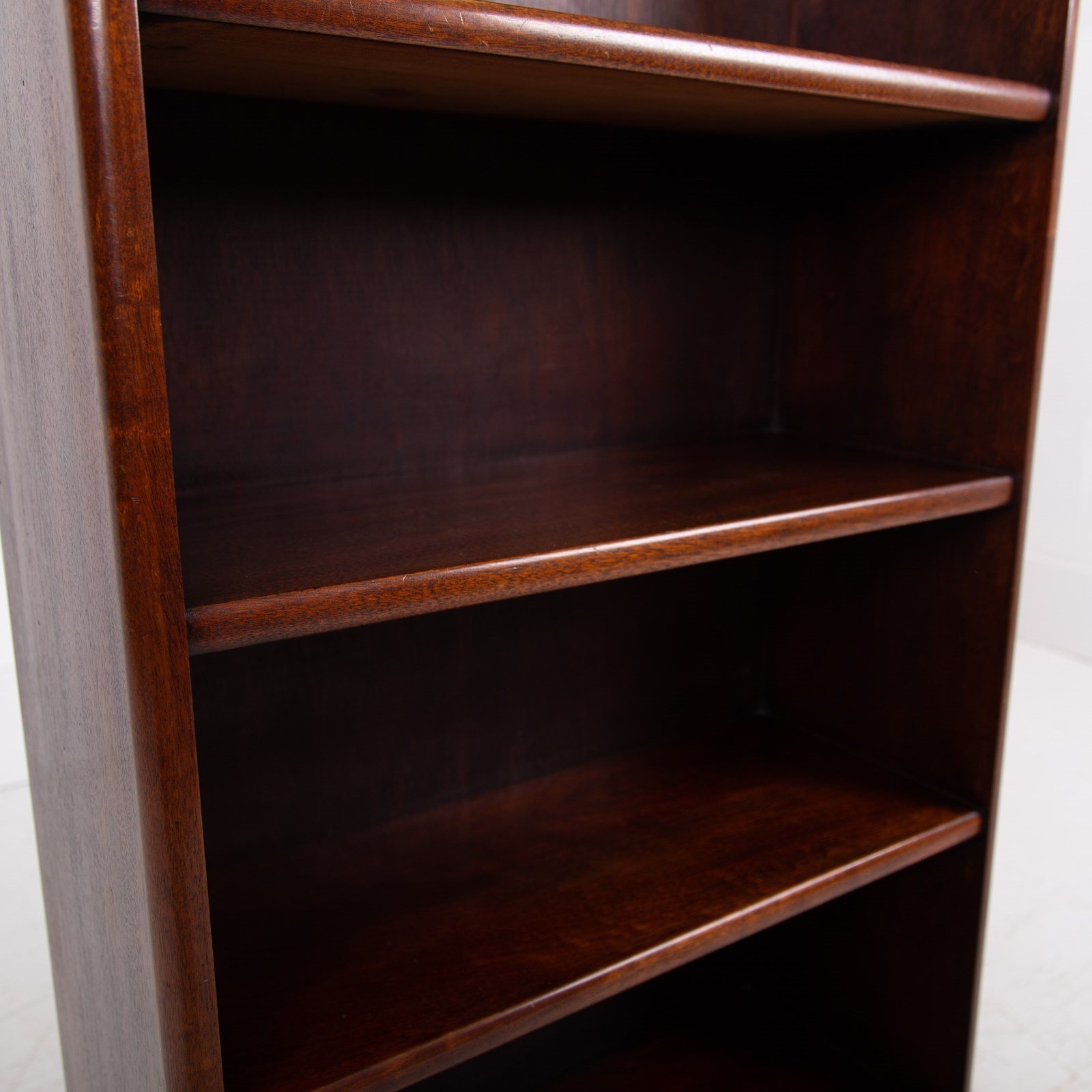 Well proportioned in size, this one sits very nicely with its 4 fixed shelves, inverted plinth, attractive thumbnail profile to the top and overall nicely aged condition. The bookcase is weighty for its size being solid timber and is ready for placing after a light wax in our workshop. Expect a well cared for piece with sensible ageing.