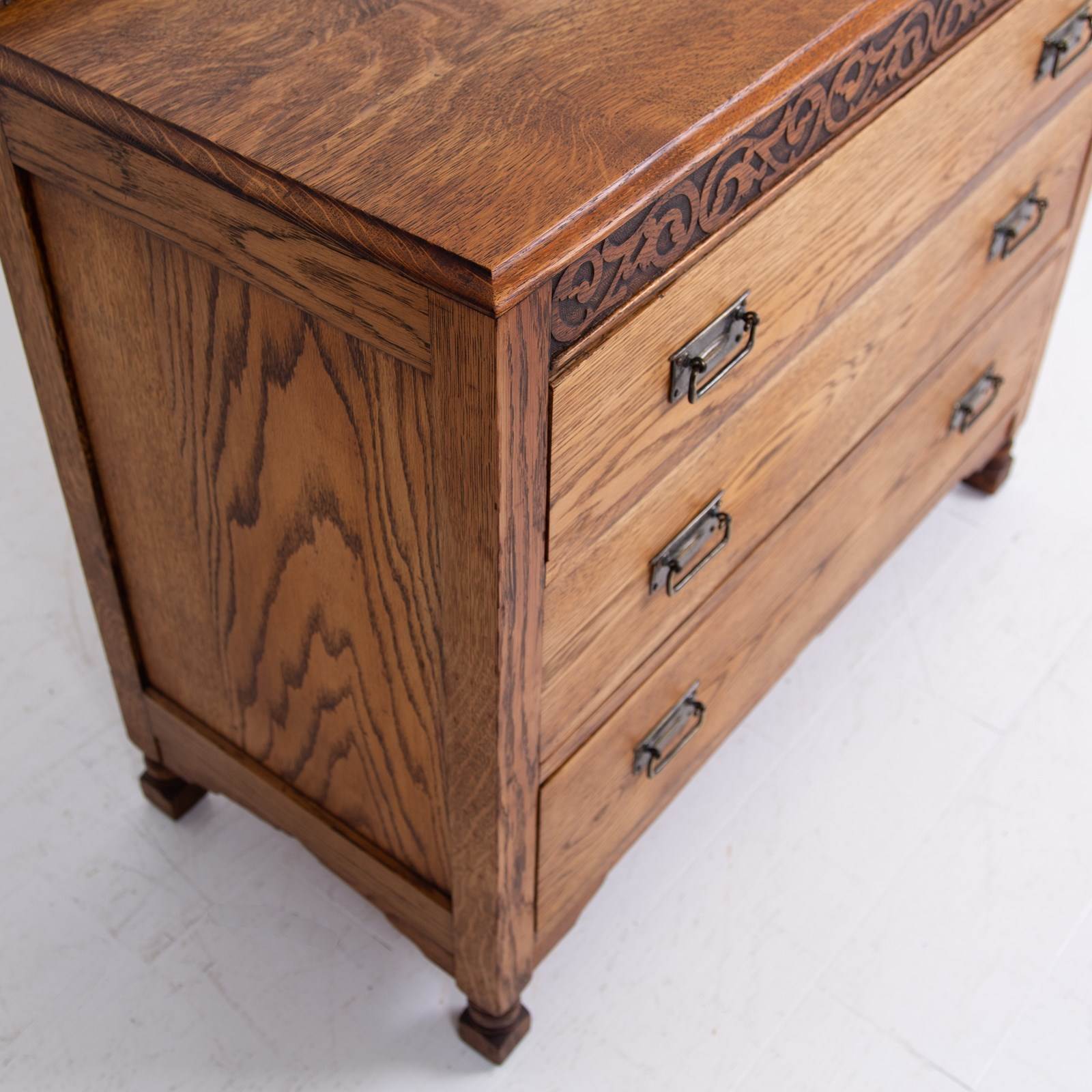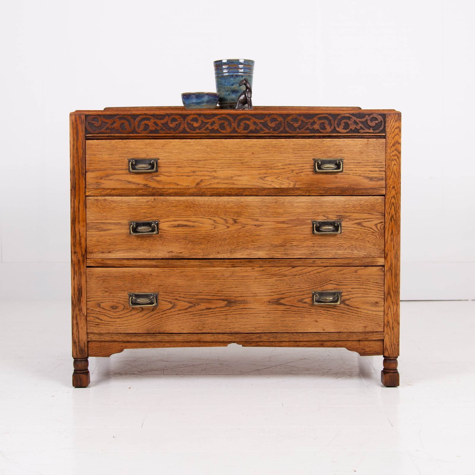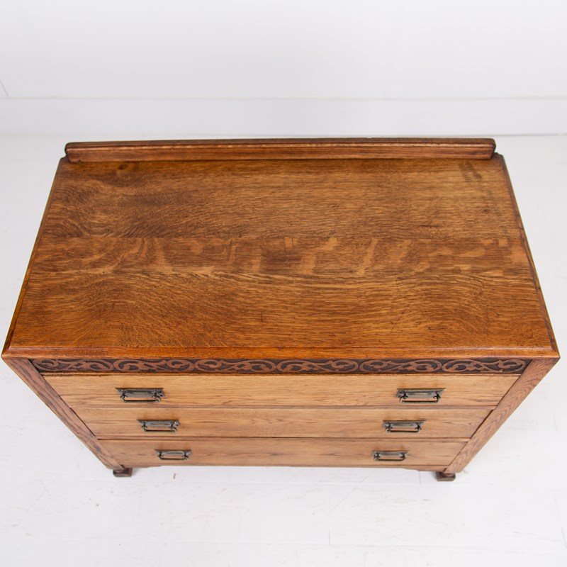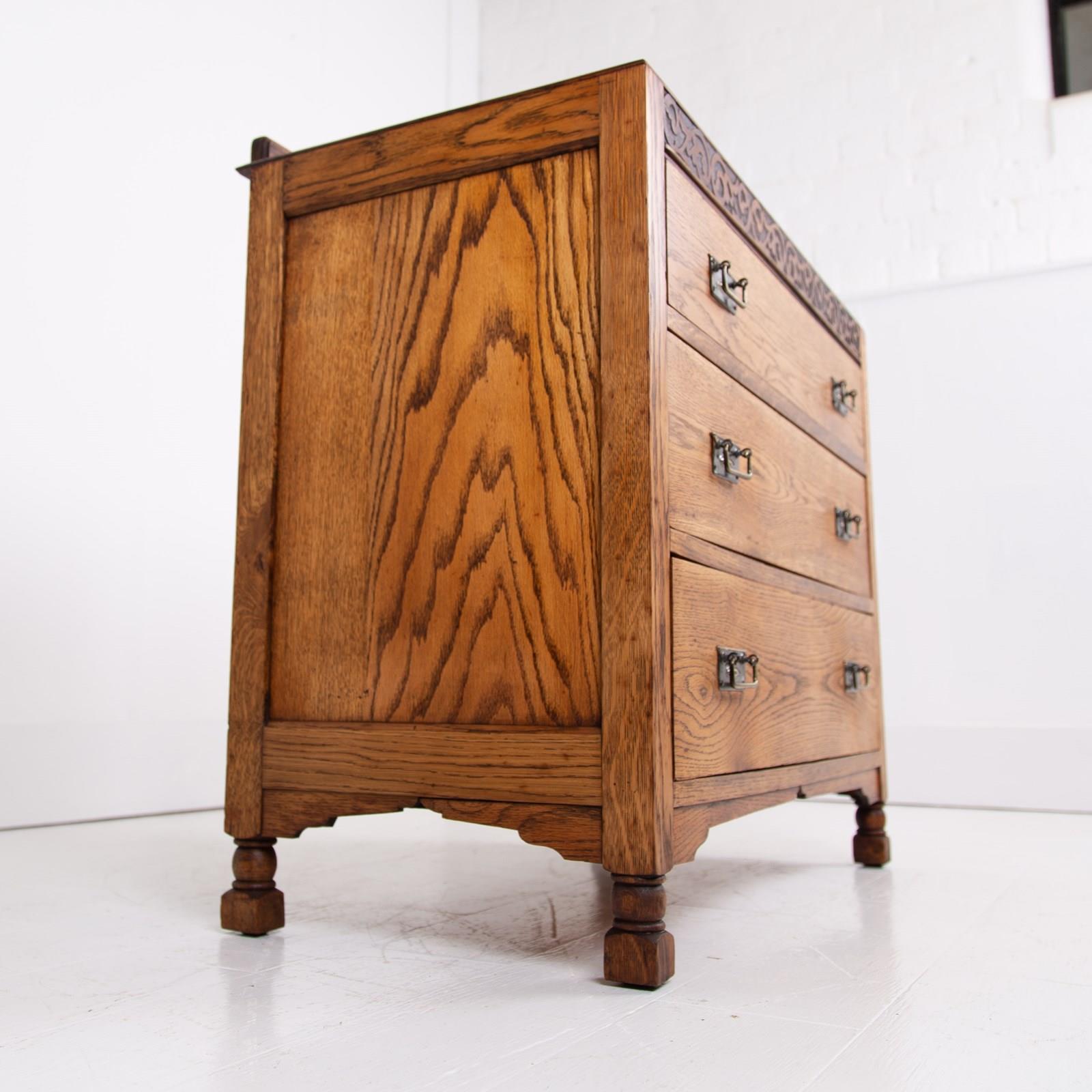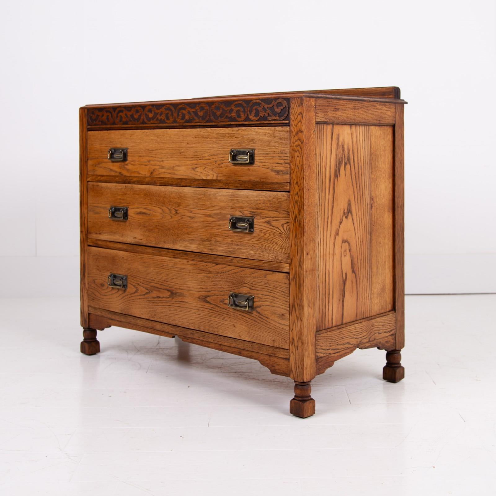 We have an attractive looking chest of 3 drawers in English oak C1920 which would not only slot perfectly into a bedroom but into a hallway or living space. With its caddy top, decorative shaped base, pleasing grain and 3 well sized drawers its going to fit into a modern or period home.