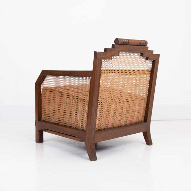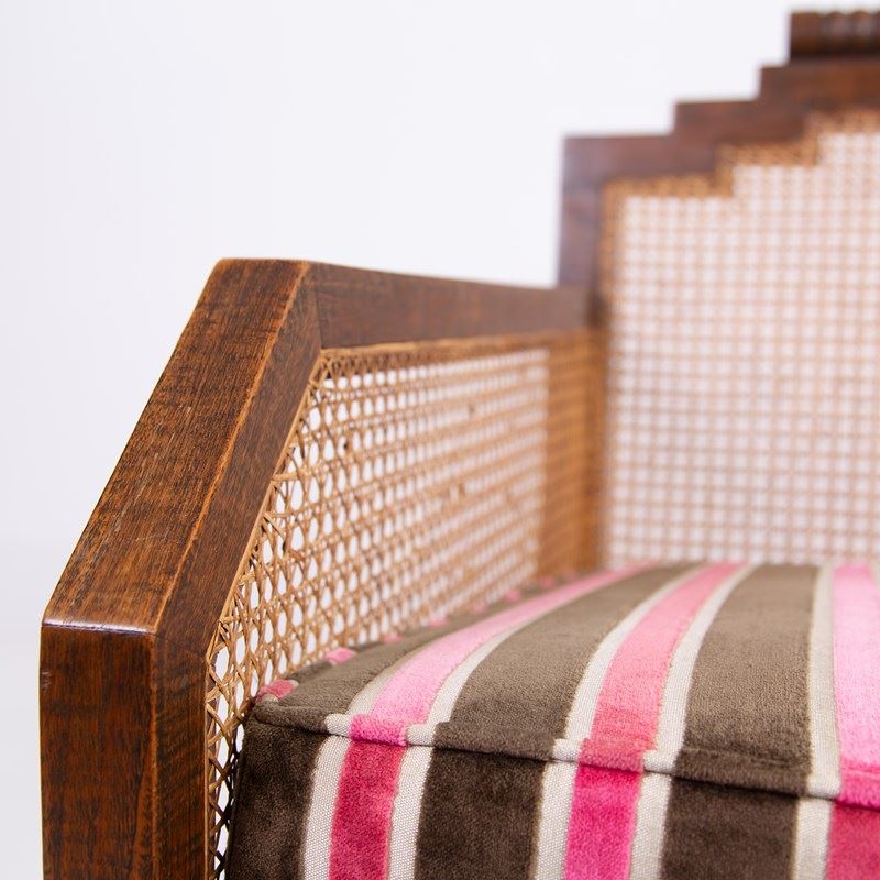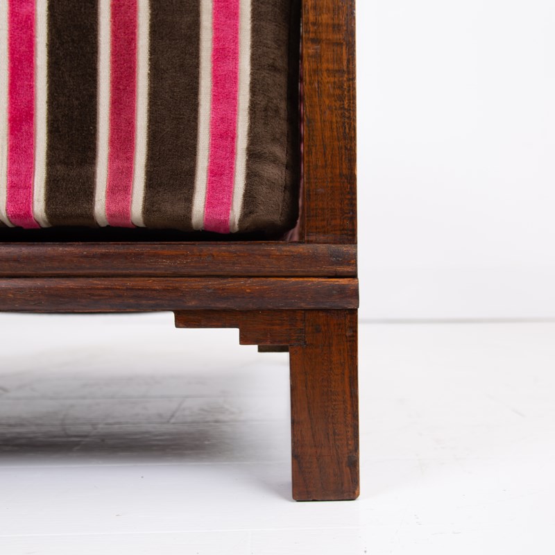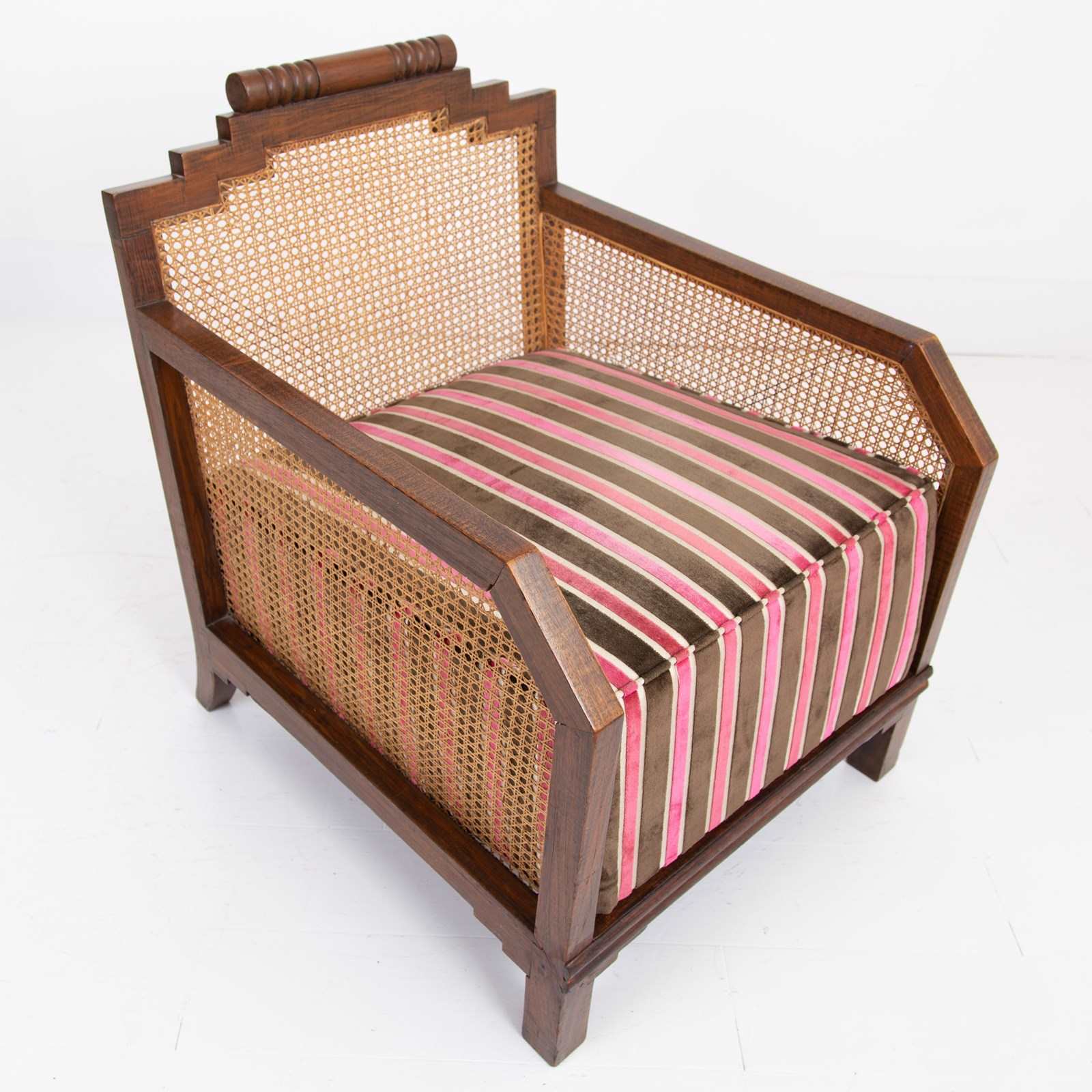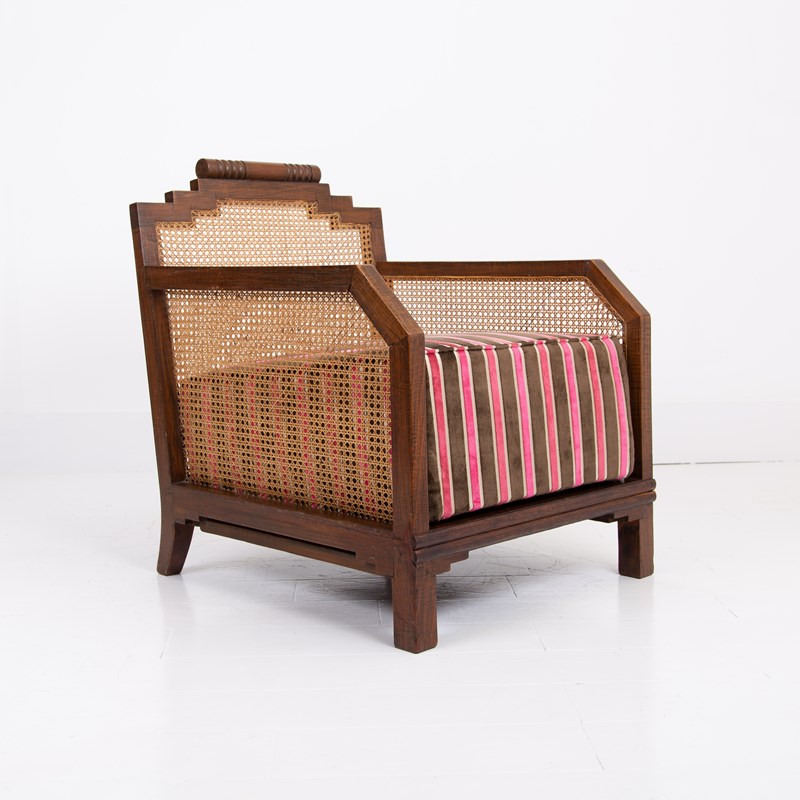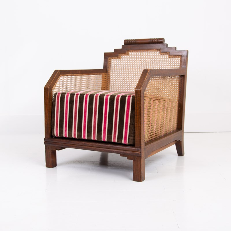 A rather good looking and distinctive Art Deco bergere armchair with its shapely back and stepped legs. The chair currently has a deep seat upholstered in a chocolate brown, fuchsia and latte striped fabric which is perfectly usable and with a sprung seat, however if you require new fabric and filling etc our upholsterer could oblige for £290 plus VAT, you would require around 2 metres of your own fabric or we are happy to offer samples and advise - please let us know once purchased. The two scatter cushions pictured are also included.