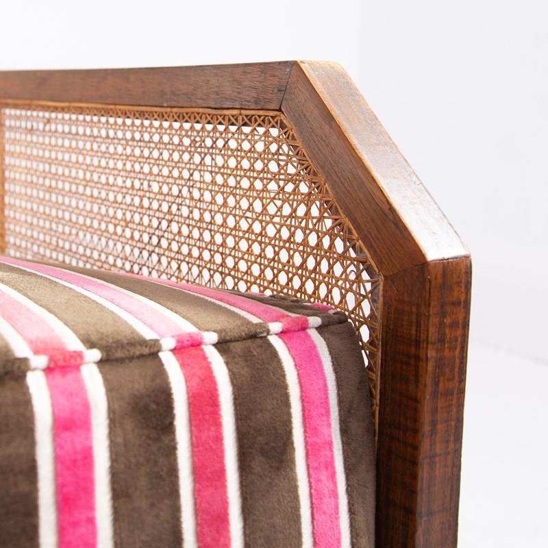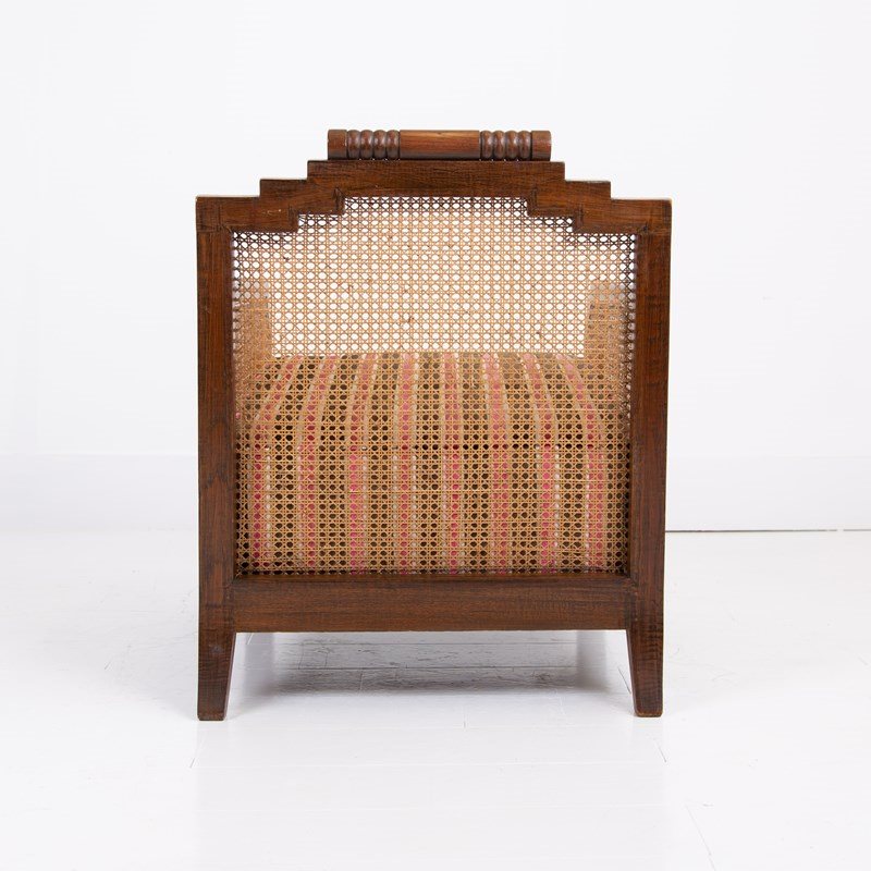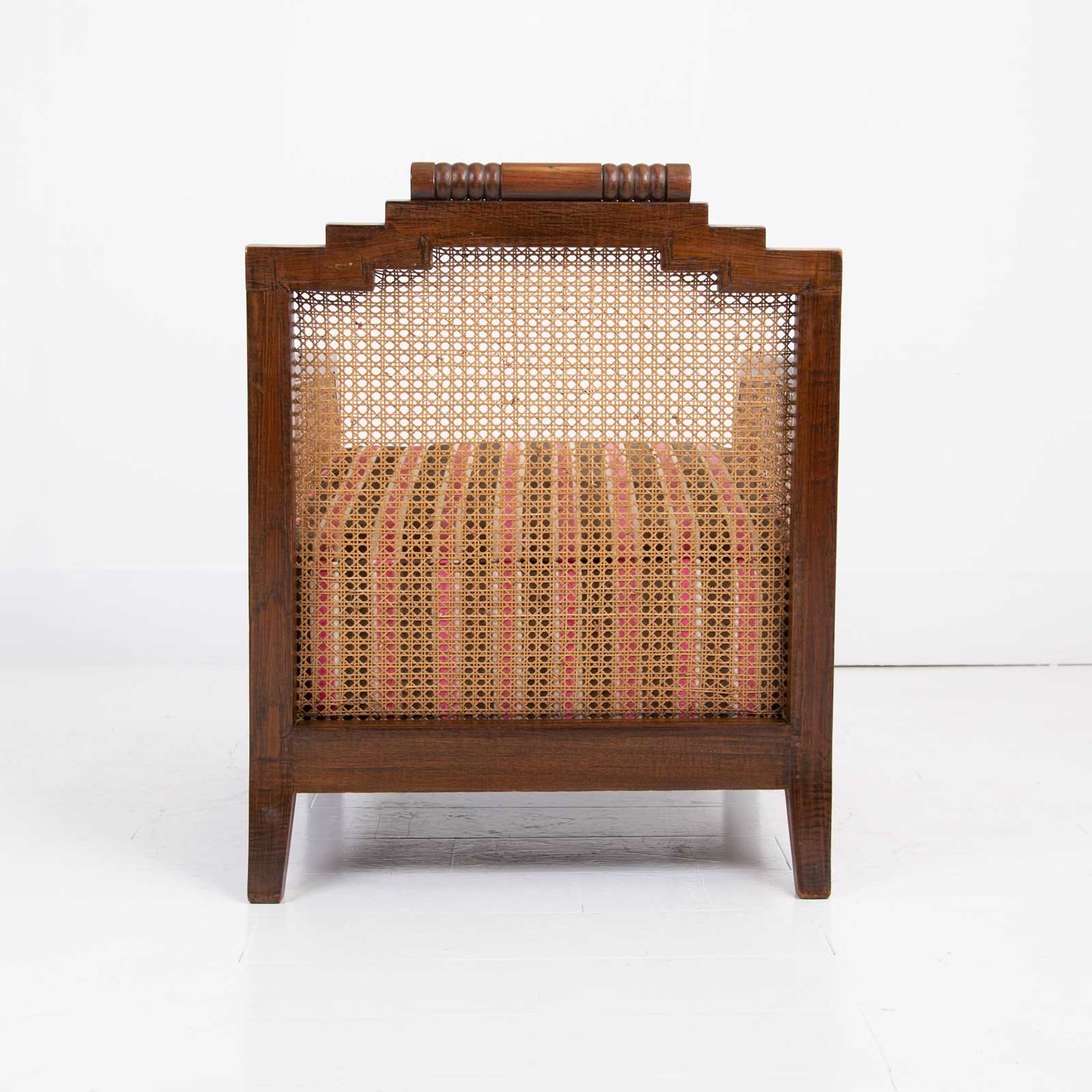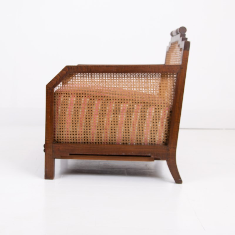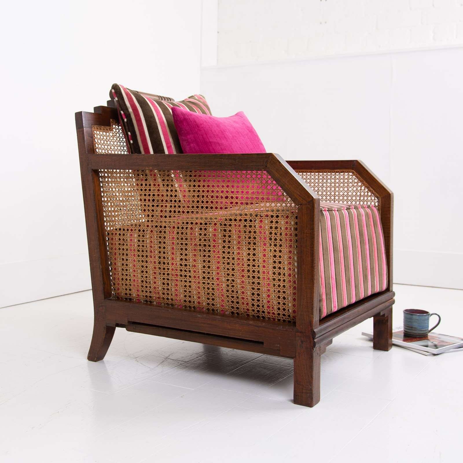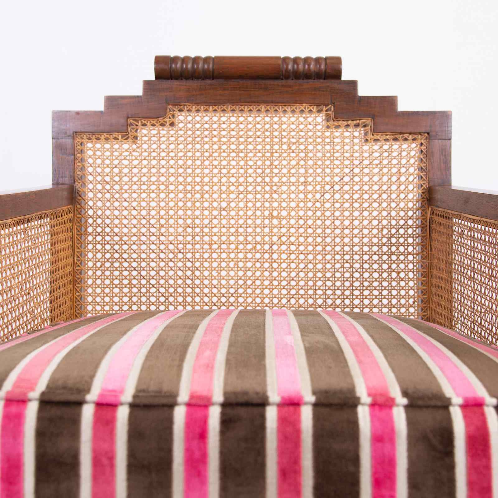 A rather good looking and distinctive Art Deco bergere armchair with its shapely back and stepped legs. The chair currently has a deep seat upholstered in a chocolate brown, fuchsia and latte striped fabric which is perfectly usable and with a sprung seat, however if you require new fabric and filling etc our upholsterer could oblige for £290 plus VAT, you would require around 2 metres of your own fabric or we are happy to offer samples and advise - please let us know once purchased. The two scatter cushions pictured are also included.