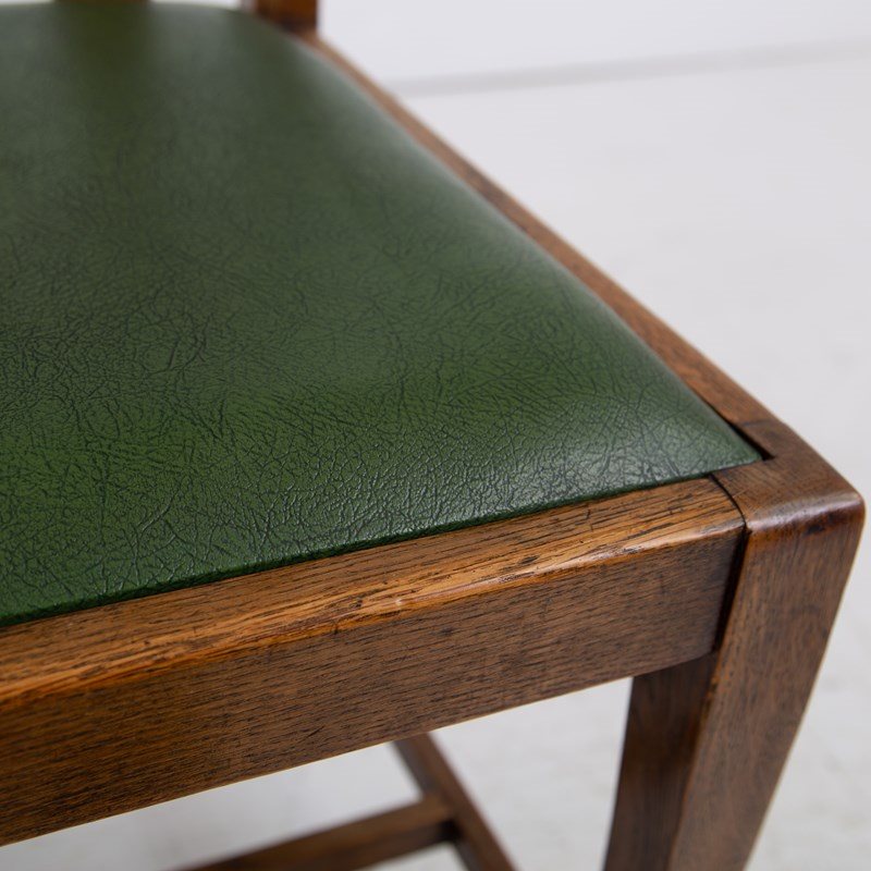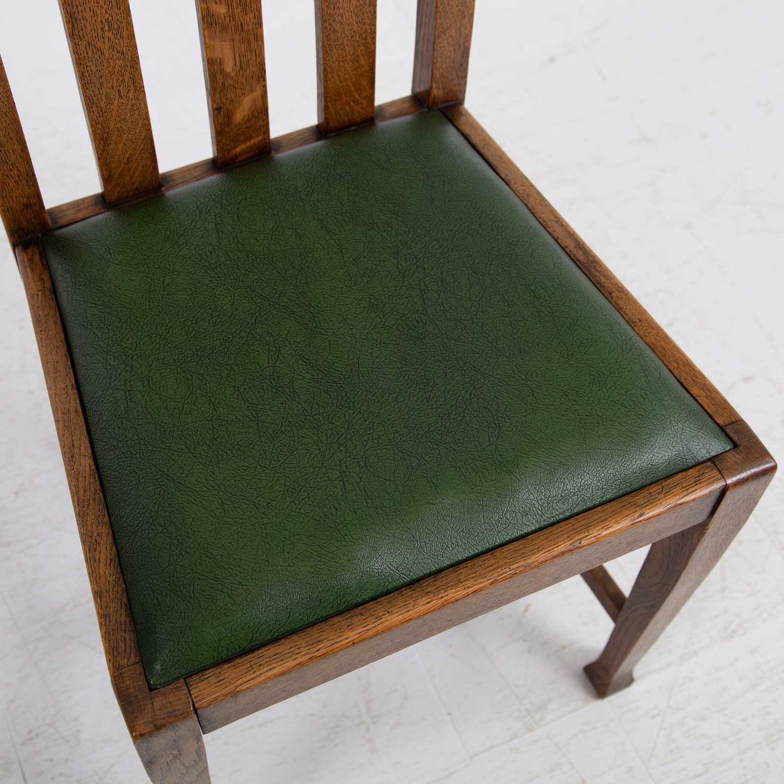 Incredibly handsome set of 6 English oak dining chairs C1915 in lovely time worn condition having tall backs and original green grained Rexine seats. This set sit well with a clean design with gentle hints of Arts & Crafts and are heavy, very well made and perfect for a period or contemporary home.
