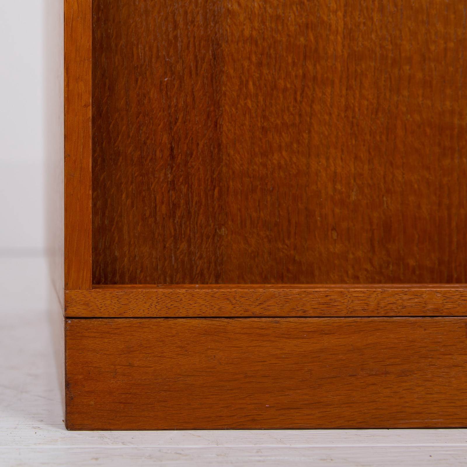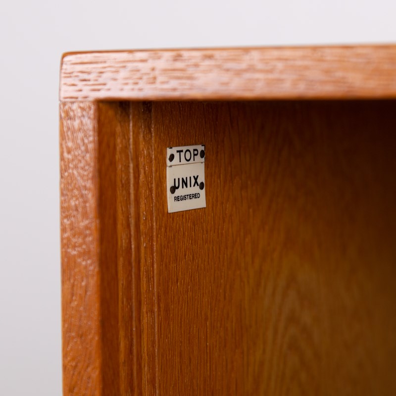 We have a Unix oak modular cabinet retailed by the Phoenix Gallery of St. Martins Lane, Charing Cross, London. Unix were fortunate to be chosen for The Festival of Britain South Bank Exhibition. The little ivorine Unix label is inside the top cabinet with the Phoenix Gallery paper delivery label attached to the rear base.