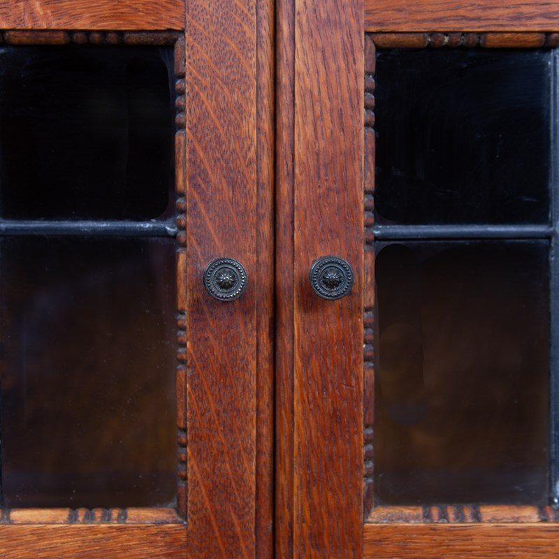 The English oak is of a pleasing tone and grain with some pleasing on the eye moulding and details on the pair. We have a maker's label to both bookcases to the inside of the top door and the bookcases sit well.