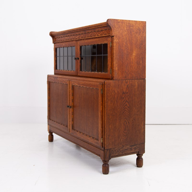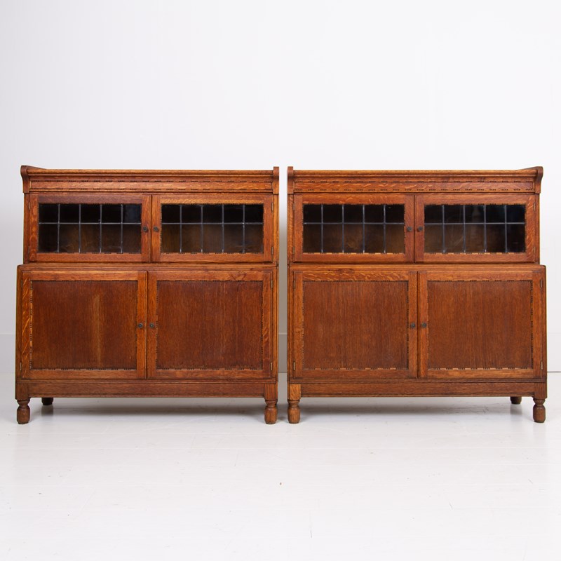 A rather handsome pair of English oak glazed library bookcases by Minty of Oxford C1920. From a large period property in the Home Counties, these are of lovely design and quality with the panelled lower section sitting on well turned legs and with the leaded glass oak framed top section both opening by way of a pair of doors both with original little brass knobs.