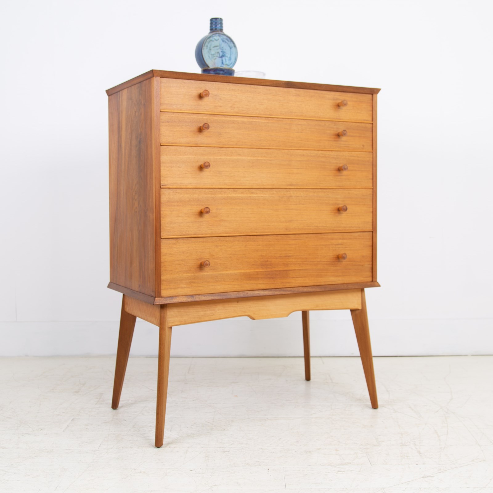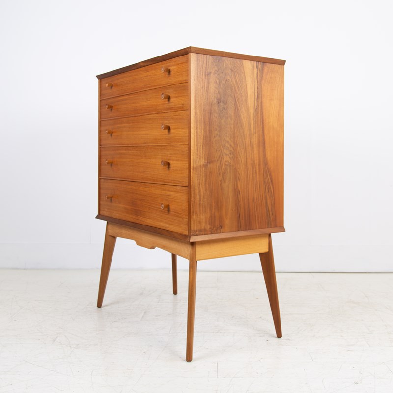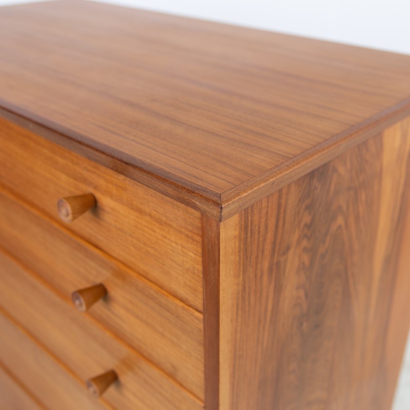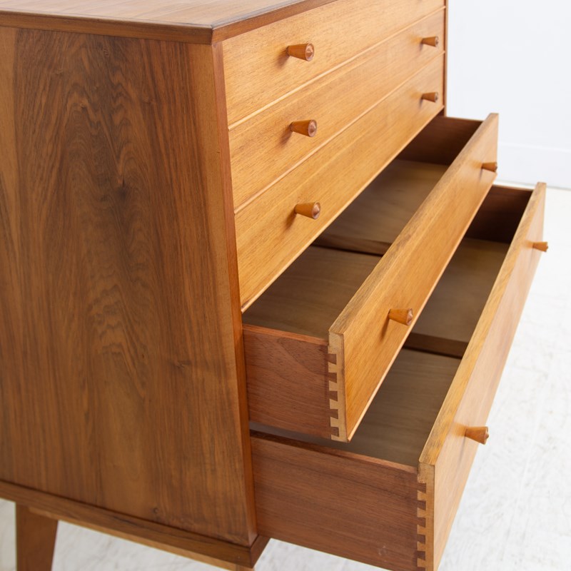 Alfred Cox retailed in the top department stores including Heal’s and the simple, sleek design and the use of the right timber makes this one shine. The attention to detail is wonderful. So often makers use substandard timber on the sides, however this chest possesses a stunning grain to the walnut on both sides. The graduated drawers are a perfect fit in a lighter shade of walnut and sit neatly perched on well angled legs.
