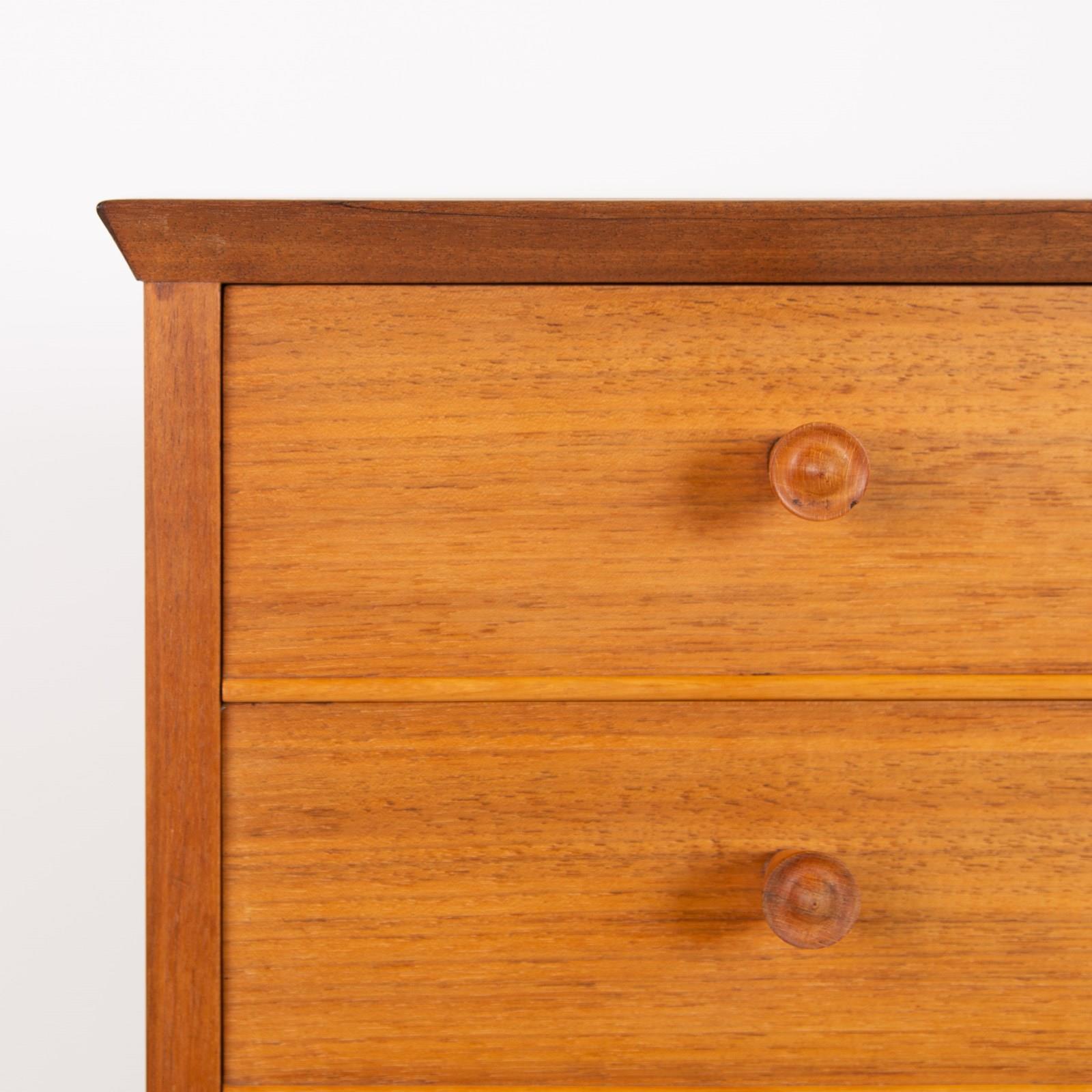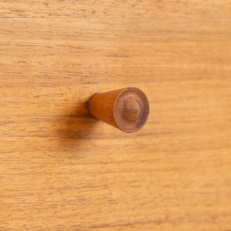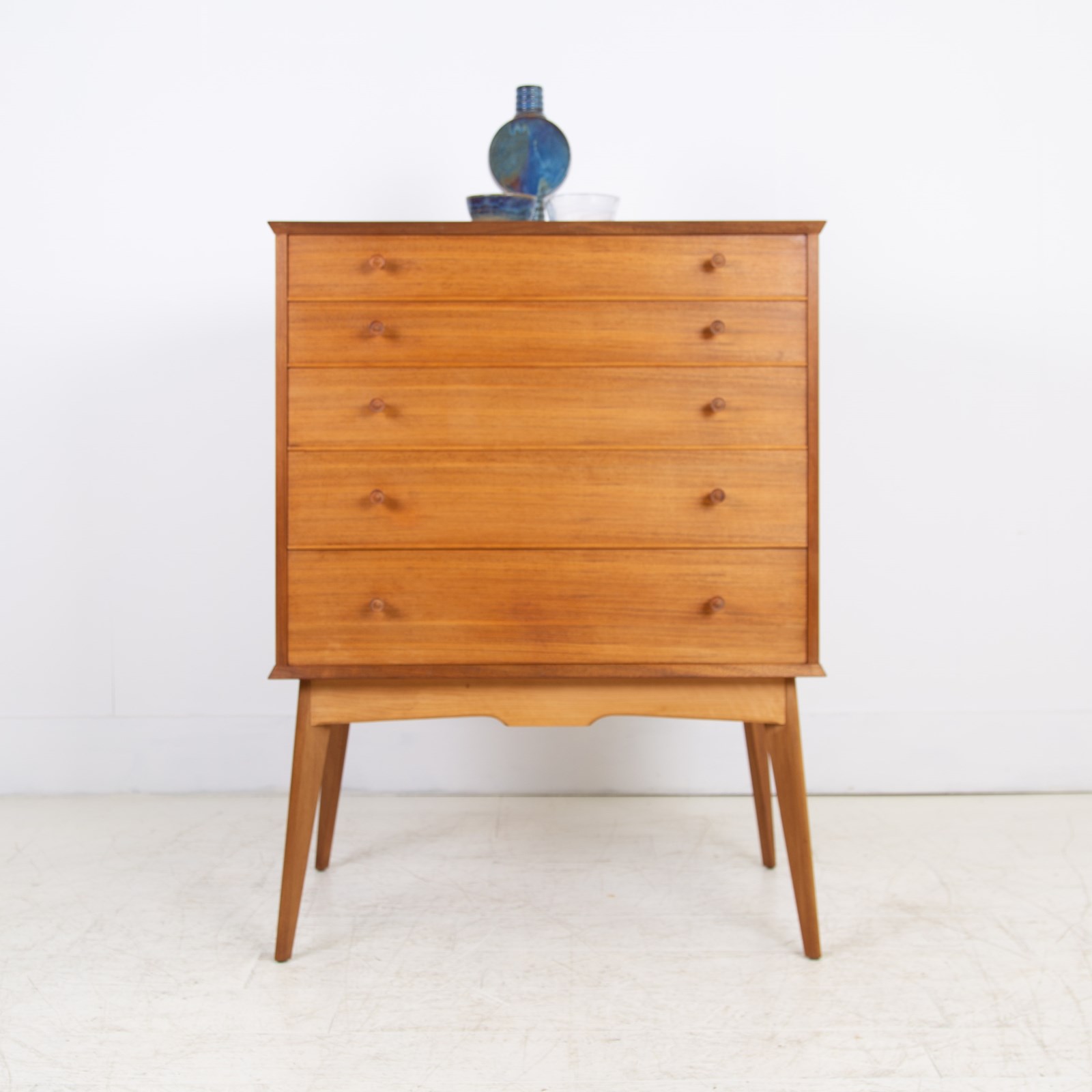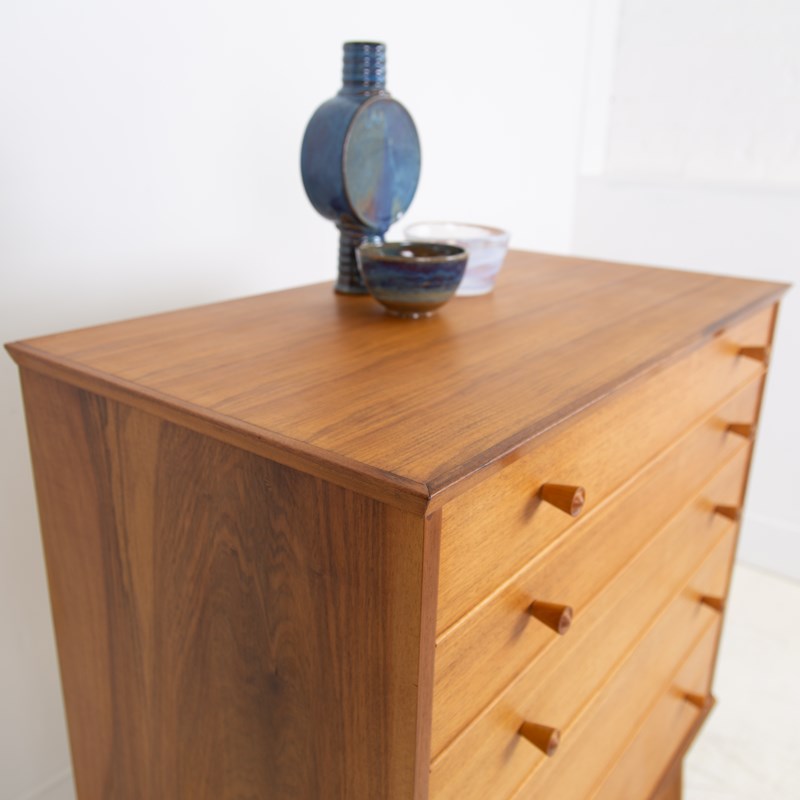 Alfred Cox retailed in the top department stores including Heal’s and the simple, sleek design and the use of the right timber makes this one shine. The attention to detail is wonderful. So often makers use substandard timber on the sides, however this chest possesses a stunning grain to the walnut on both sides. The graduated drawers are a perfect fit in a lighter shade of walnut and sit neatly perched on well angled legs.
