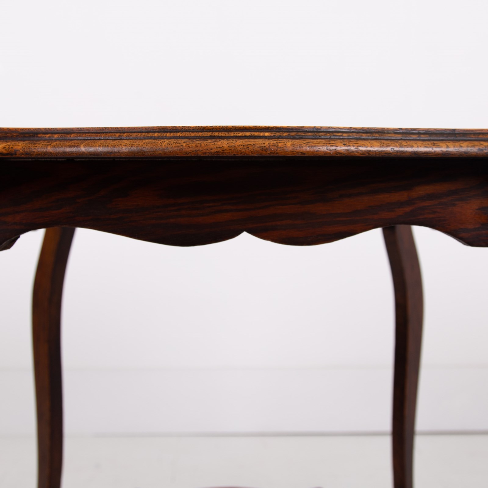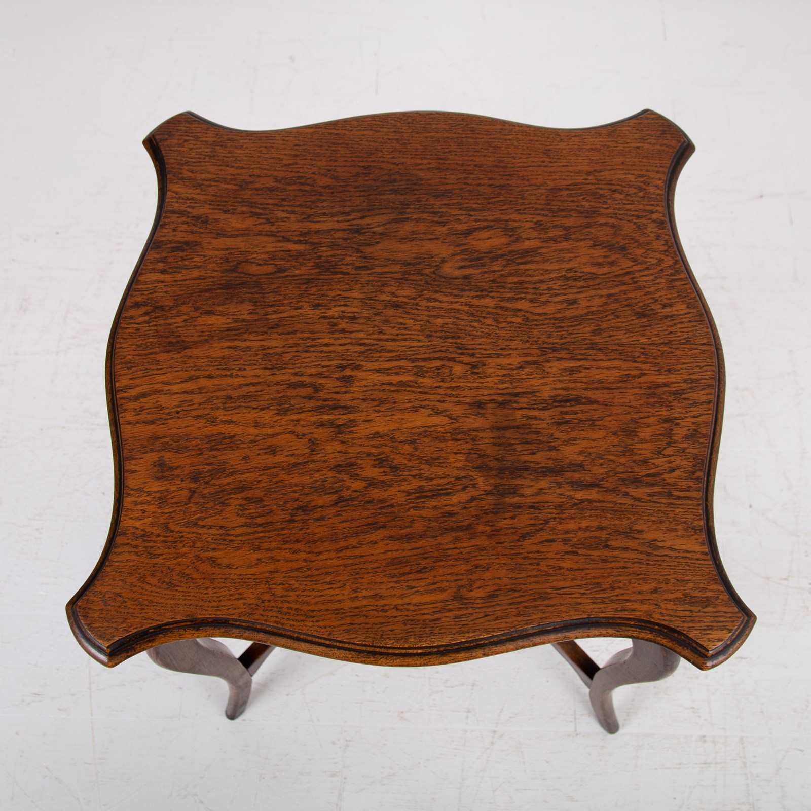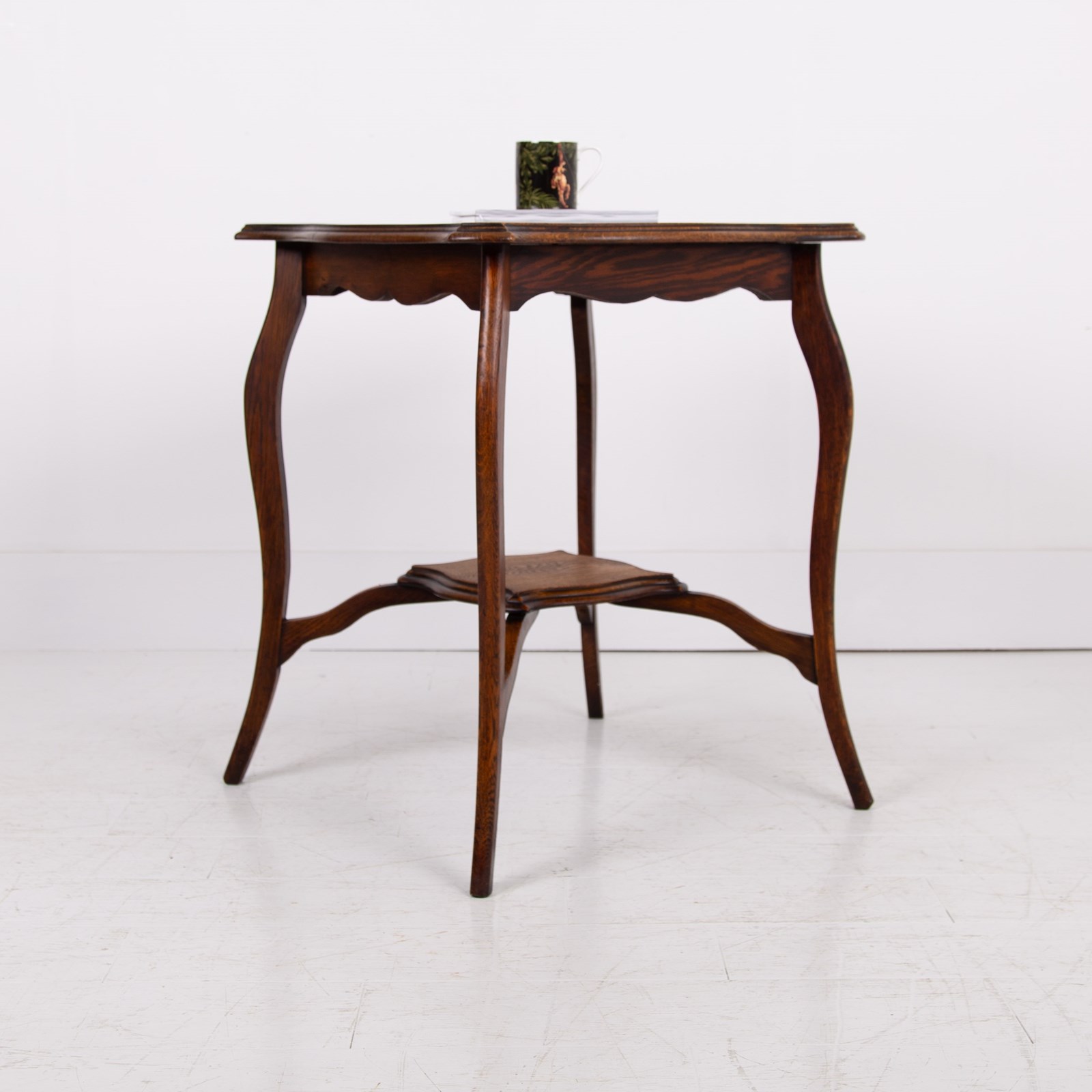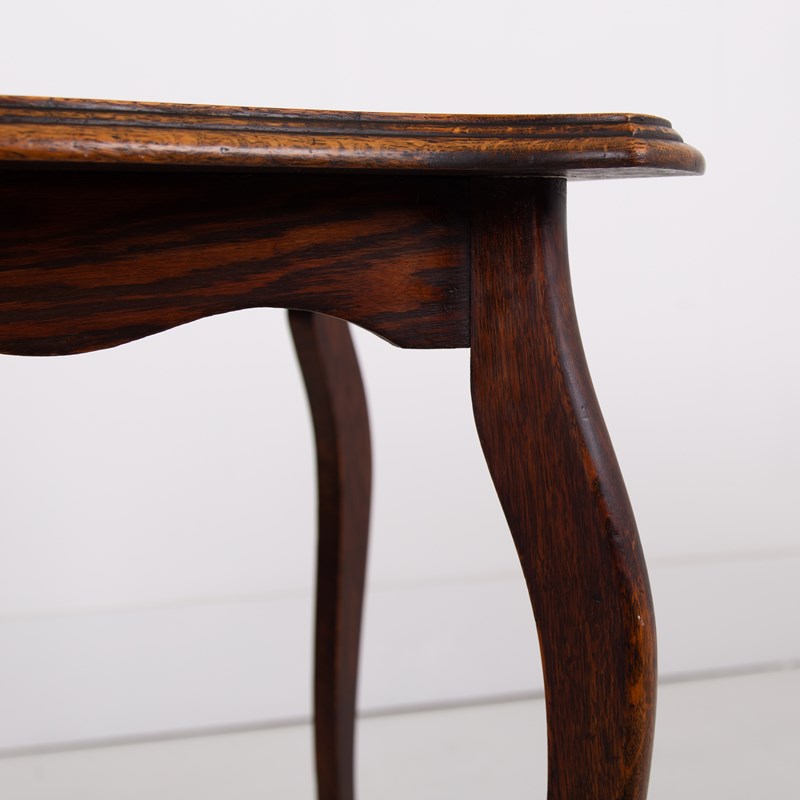 We have a lovely solid English oak side table C.1905 of good proportions and sitting in a rather nice condition. The form is highly decorative with cabriole legs and pleasing on the eye molding to the shaped table top.