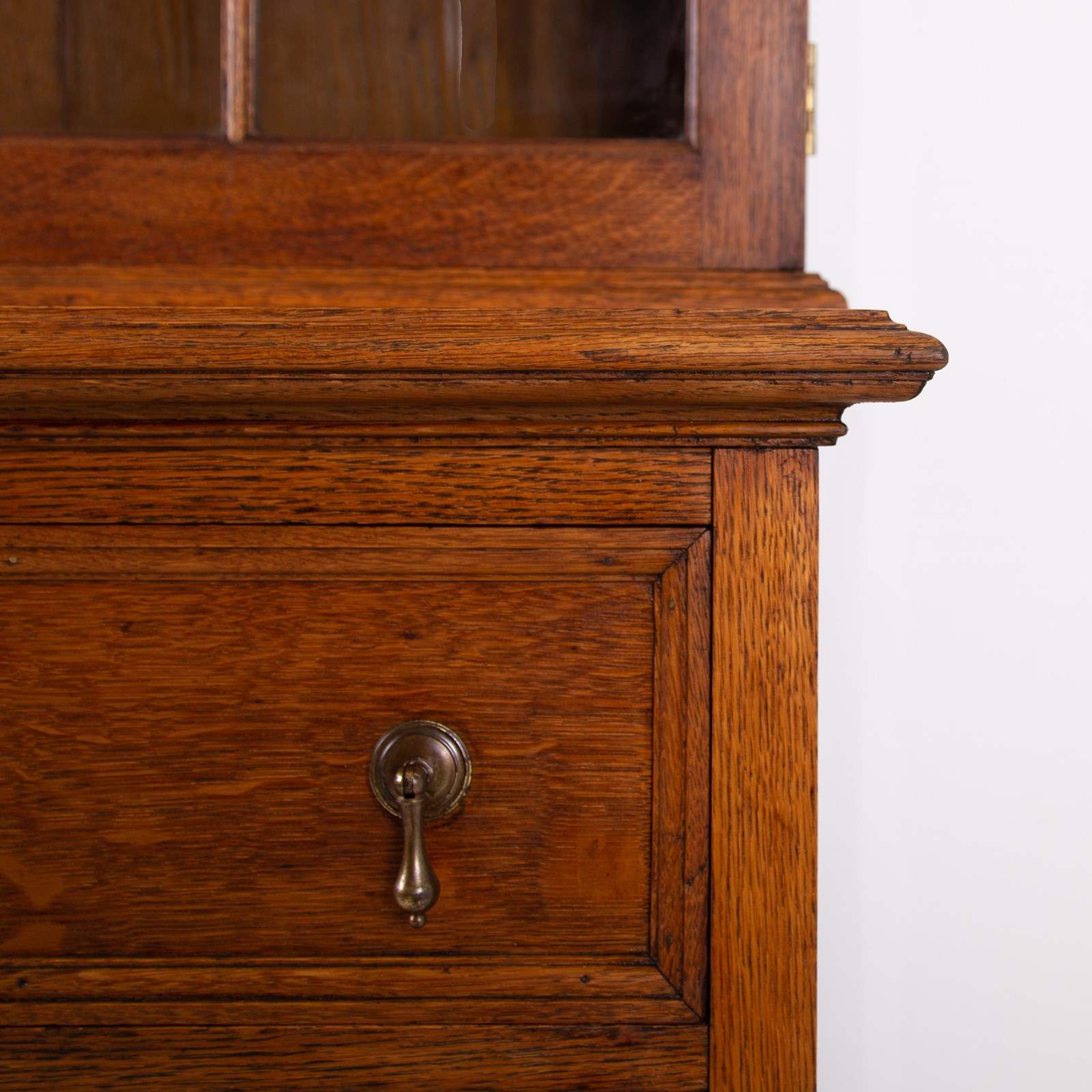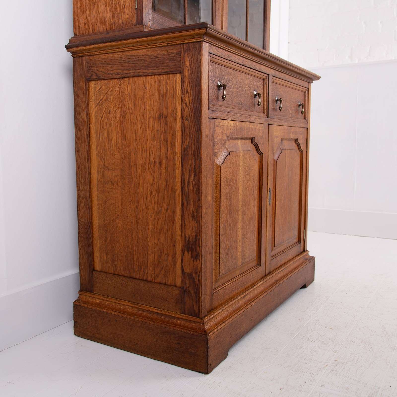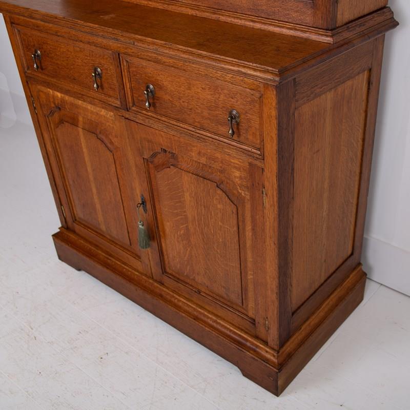 Firstly the timber used is of a lovely grain and tone - leaning towards golden in colour. The piece sits well - not too large in scale, with the top half having a decoratively framed oak pair of doors with original glass hiding a trio of adjustable oak shelves which close by way of a working lock and key. The lower half consists of 2 framed deep oak drawers with drop pendant handles, both working as they should, beneath which sits a two door cupboard with a full shelf inside which could be removed if you desire. The cupboard with panelled doors mimicking the glazed doors to the top closes by way of the same working lock and key. We have a deep plinth to the base, attractive molding, and well sized cornice to the top.