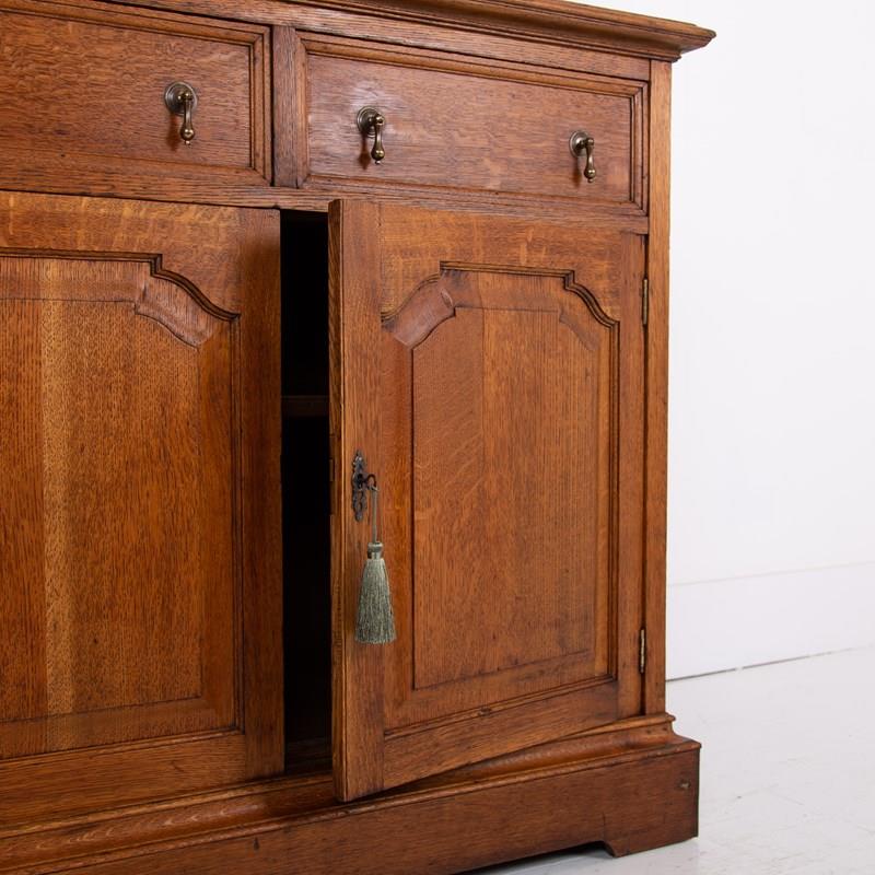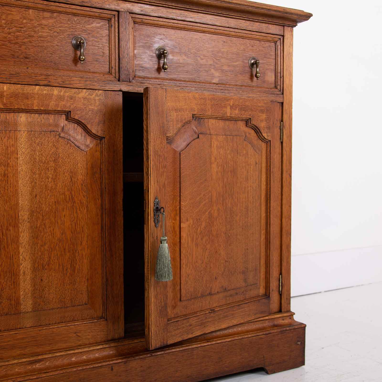 The condition is good. The cabinet sits solid with sensible historic wear but nothing off putting. Our workshop has carefully cleaned the piece and hand waxed to enhance the grain and tone of the English oak. The cabinet is ready for placing and separates into two for easier moving.