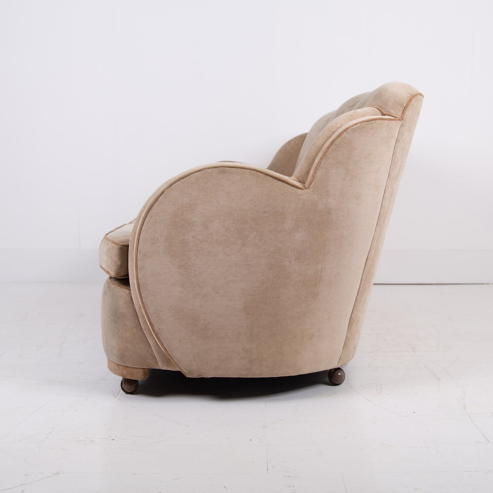 We have a fabulous looking Art Deco cloud sofa by Harry and Lou Epstein which currently sits in a worn short cut velvet fabric which our upholsterer would be happy to fully re-upholster at a cost of £835 plus VAT. You would require around 8-9 metres of fabric, depending on pattern, which we would be happy to assist with the sourcing of swatches and an initial chat about patterns and colours etc.
