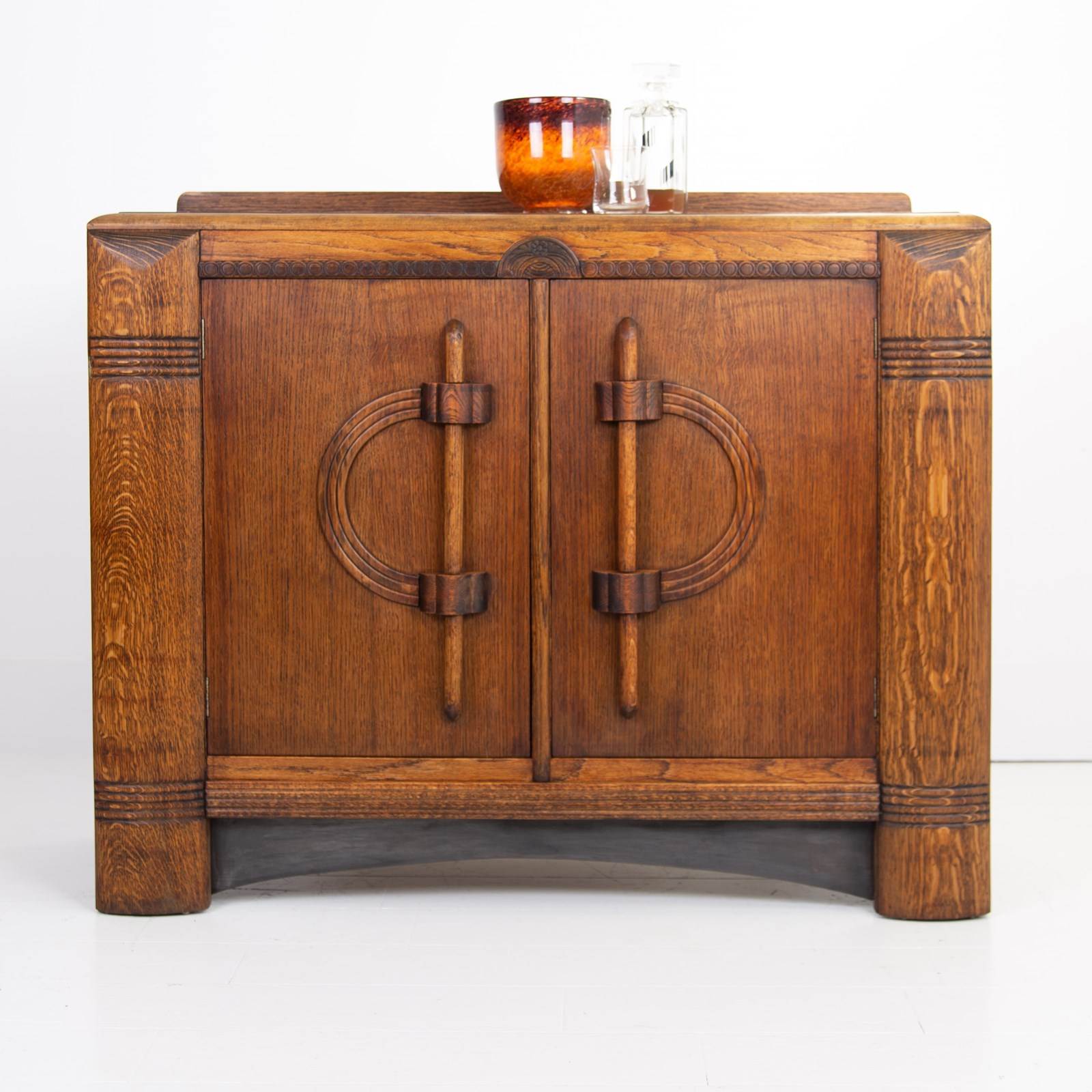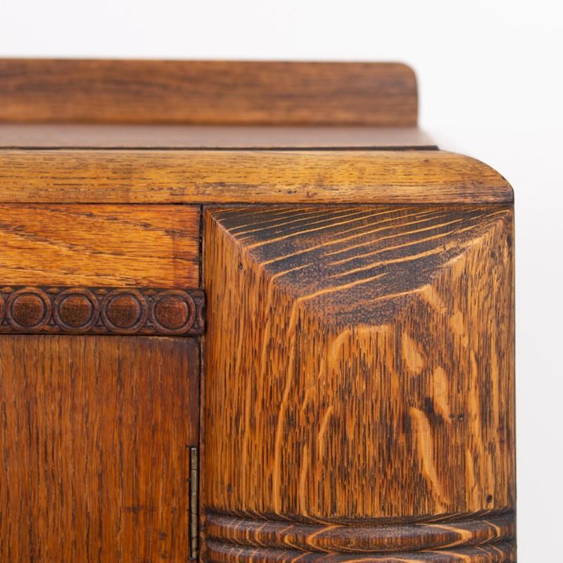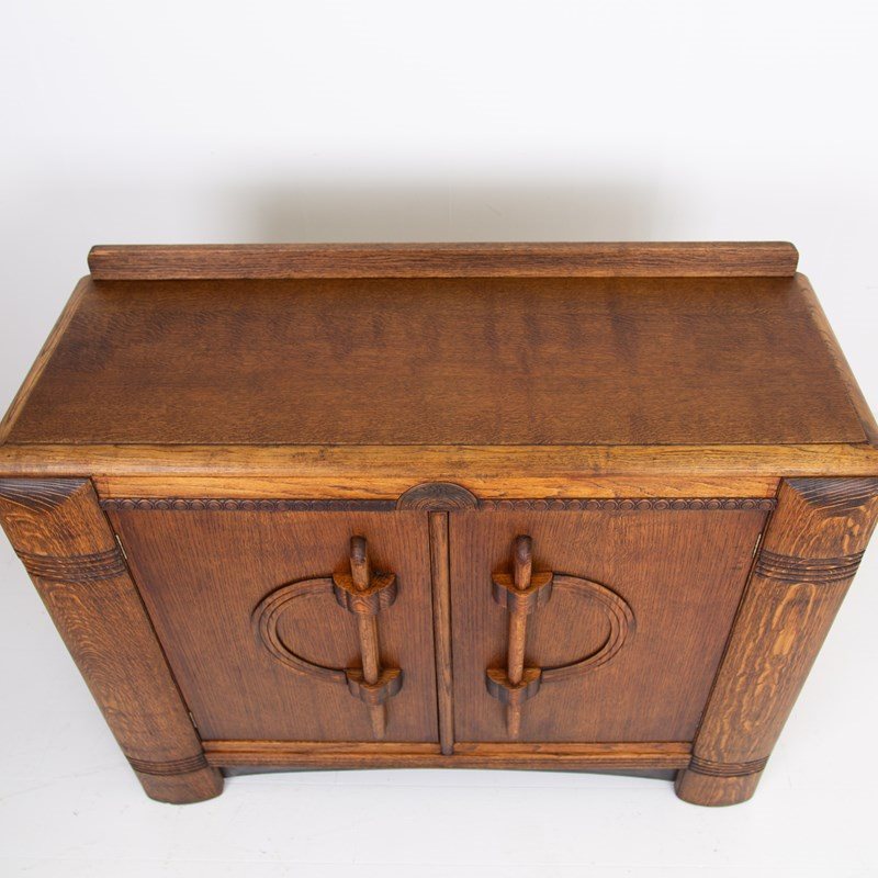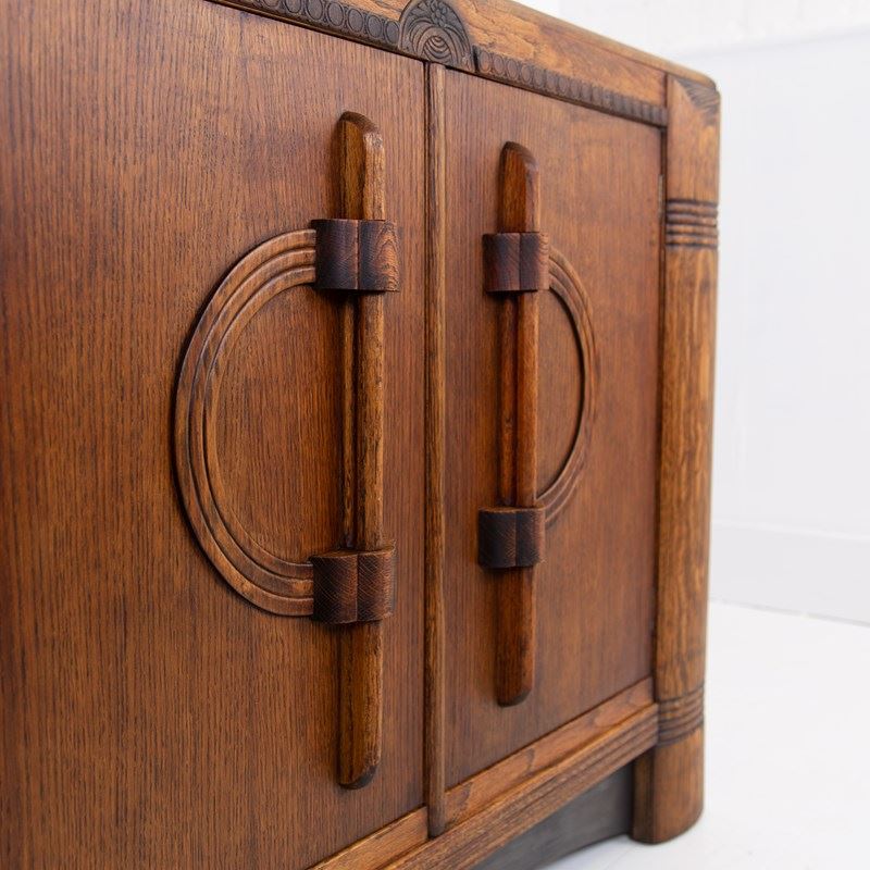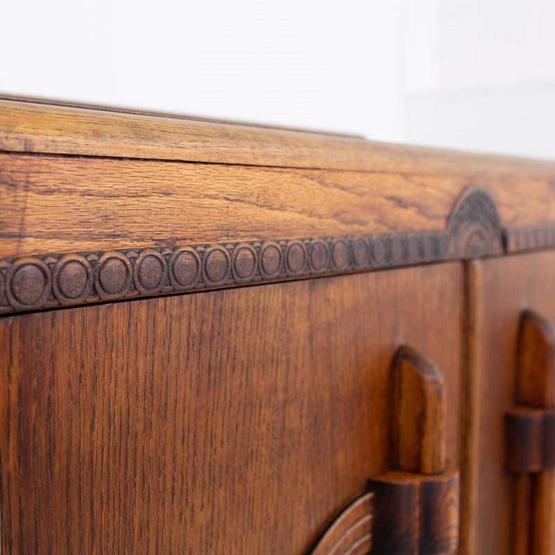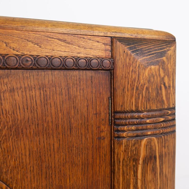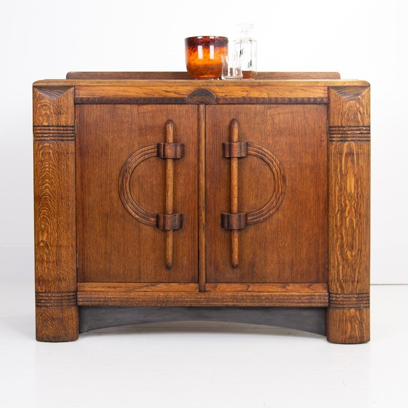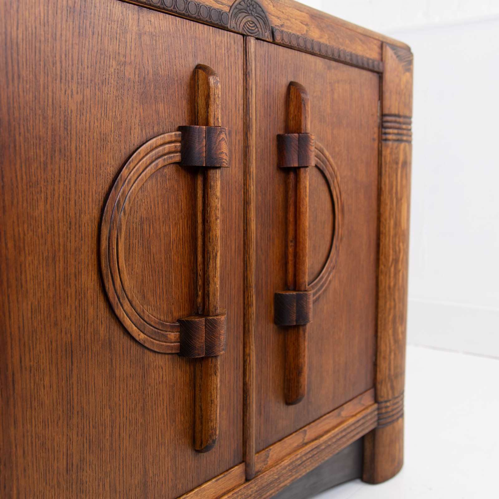 A good looking oak Art Deco cabinet sideboard. This one takes its design from the Art Deco period with its oversized ribbed columns to the front, large oak decorative semi circles and thin line of pretty applied flowers and circles to the top and deco style oak handles to the two cabinet doors.