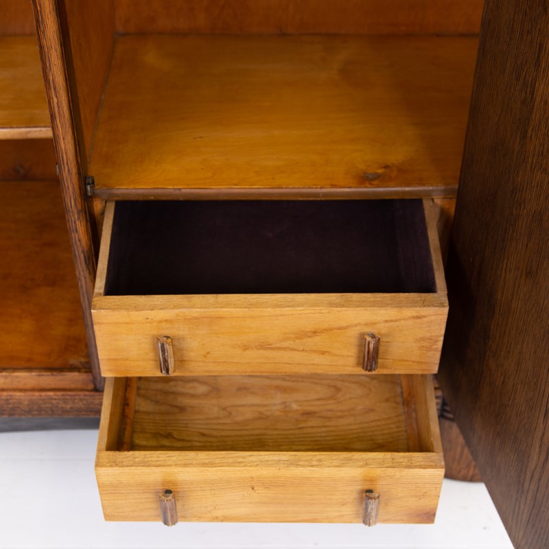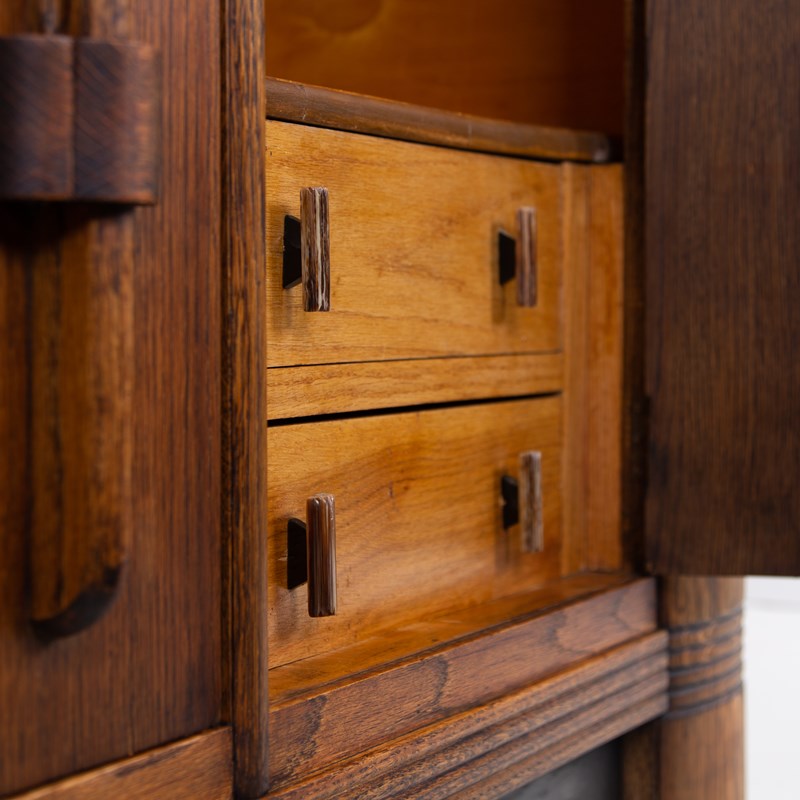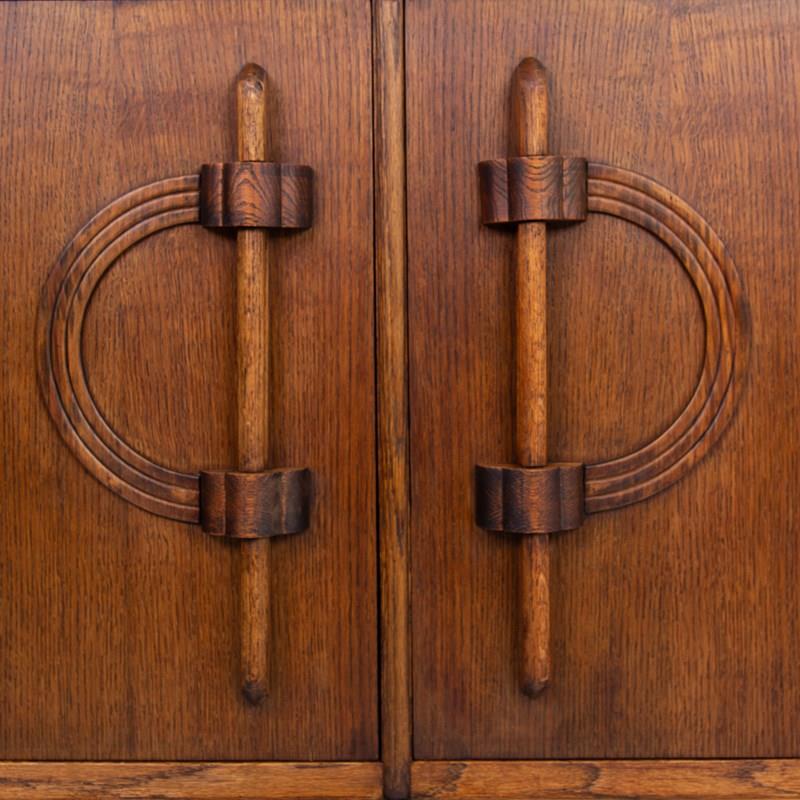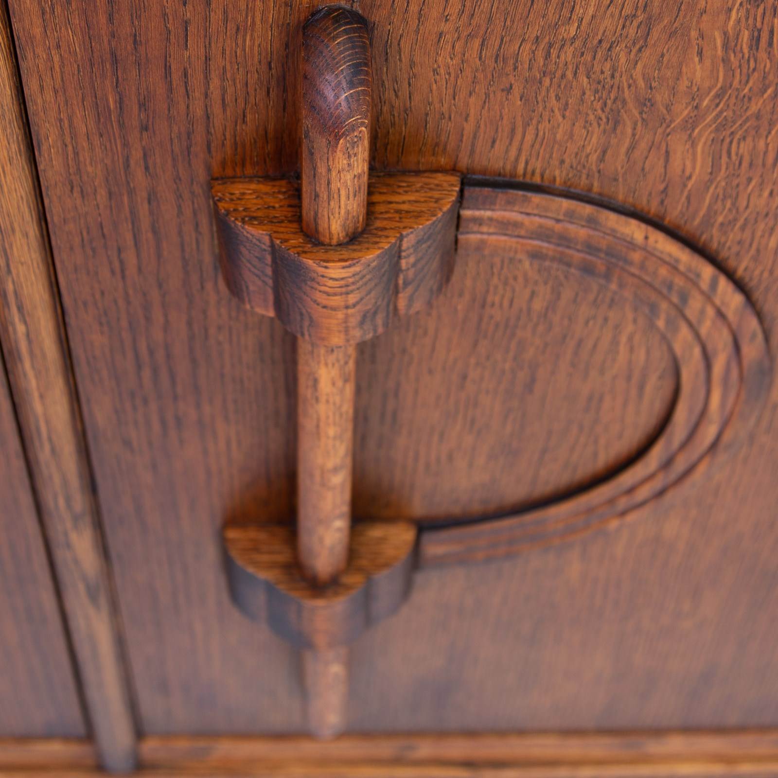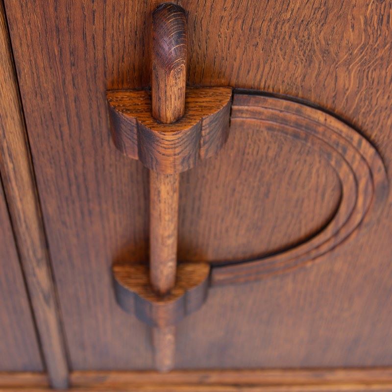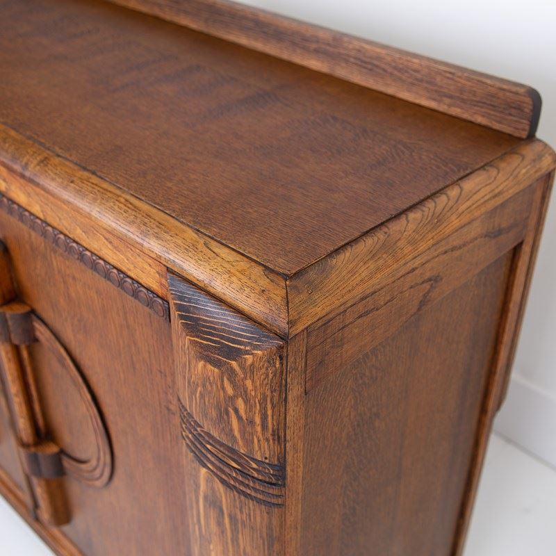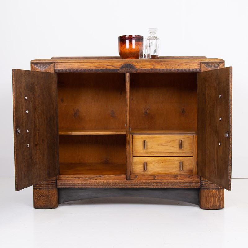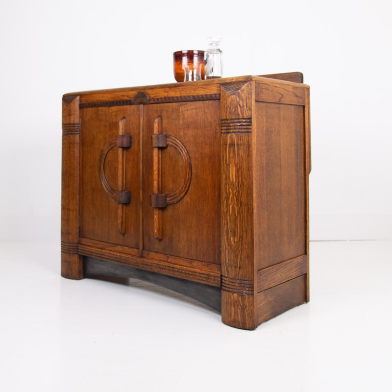 A good looking oak Art Deco cabinet sideboard. This one takes its design from the Art Deco period with its oversized ribbed columns to the front, large oak decorative semi circles and thin line of pretty applied flowers and circles to the top and deco style oak handles to the two cabinet doors.