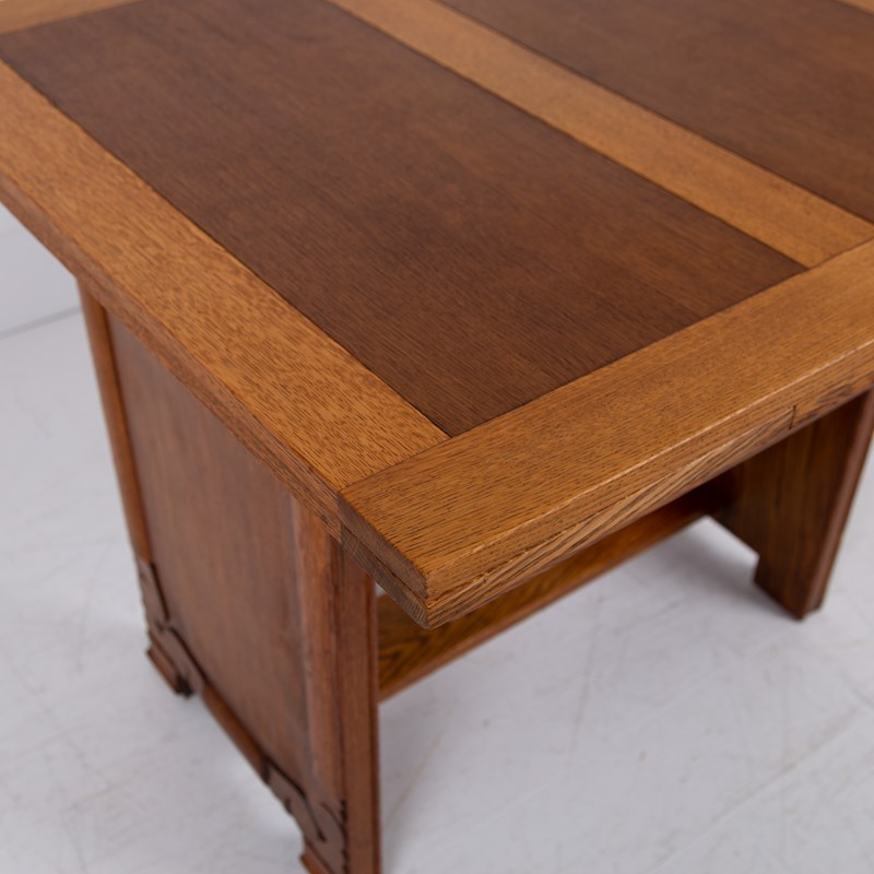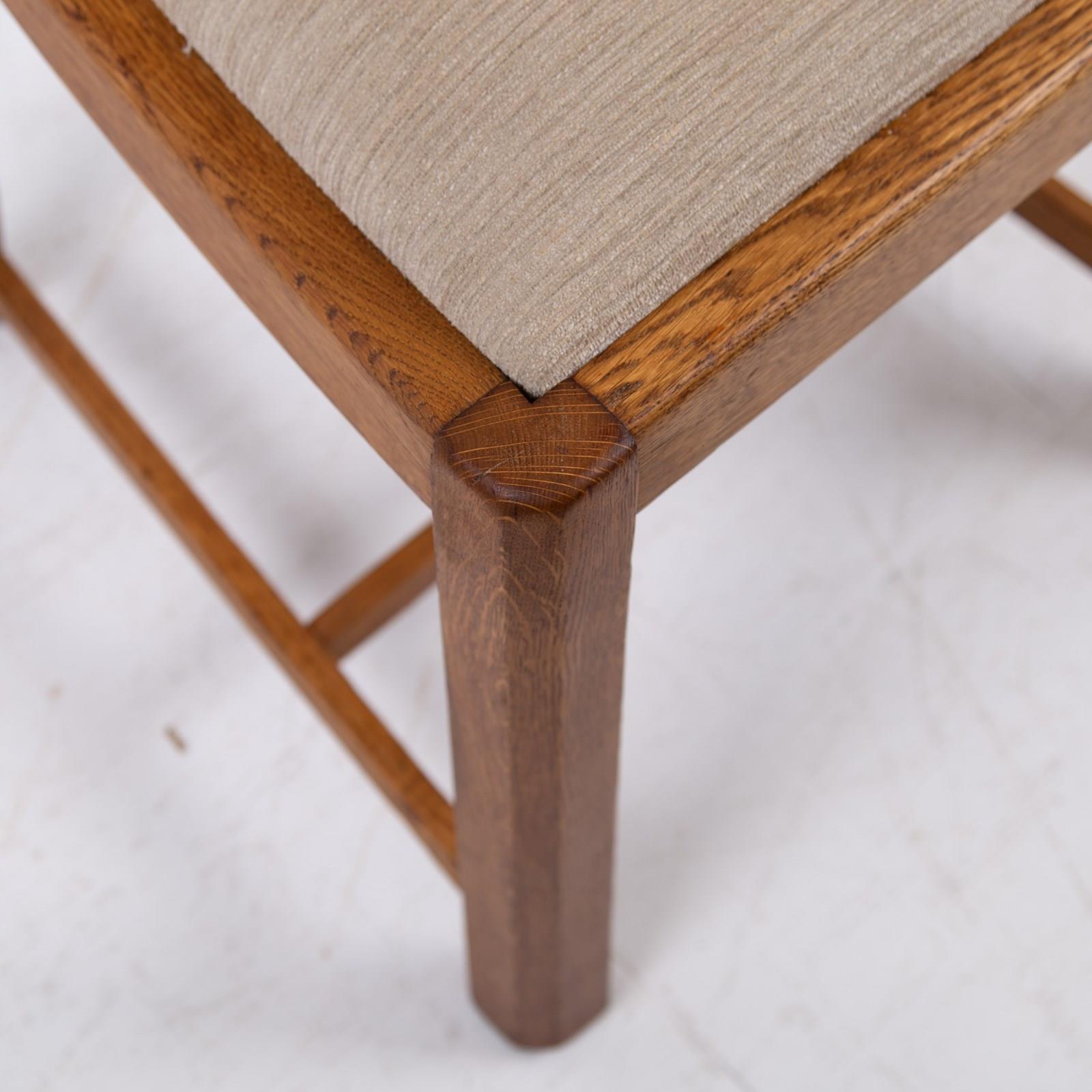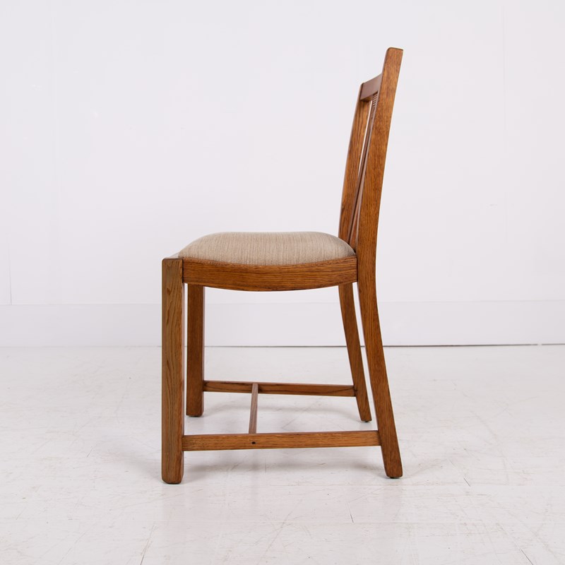 A great set - the four chairs are in fine order with an attractive raised motif to the back, well angled front legs, a good wide seat with arched sides making them a little more attractive and more comfortable. The drop in seats are neat, plump with little wear in a light stone coloured fabric and very usable. If you require new seats our upholsterer would charge £210.00 plus VAT and you would require 2-3 metres of fabric. The table sits well with extendable, matching leaves, underneath the attractive two toned oak top. The top is in fine order with little wear as are the extra leaves. Expect a little wear to the base but the table and chairs sit solid and firm. The table top will separate from the base for easier placing.