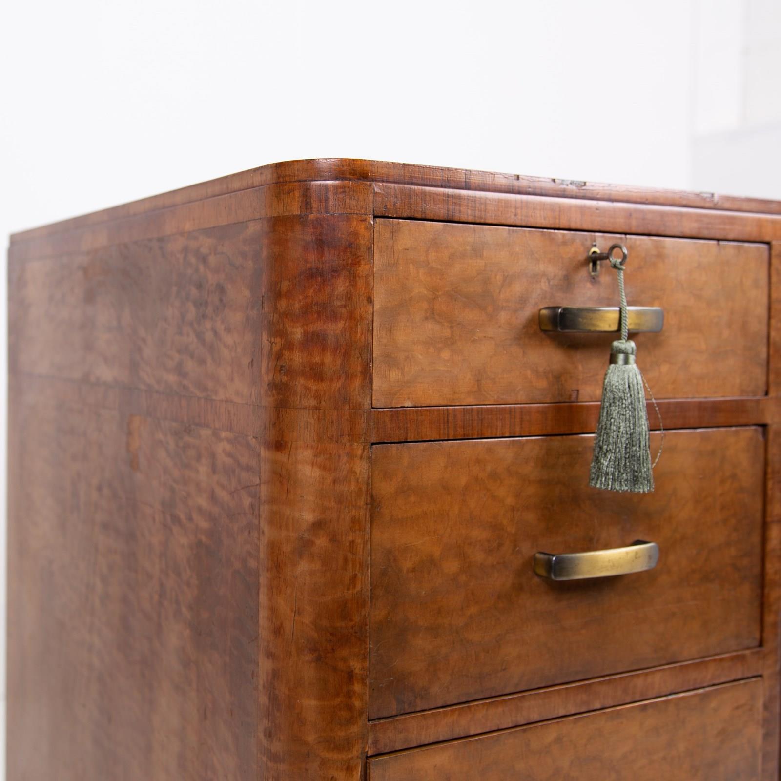 The olive covered leather insert with its walnut surround sits on a combination of one long drawer and a flight of 4 smaller drawers. We have gentle rounded edges and an inverted plinth to the base. All subtle Art Deco features and good on the eye.