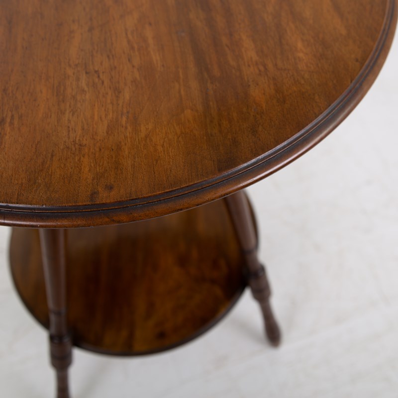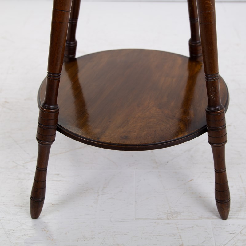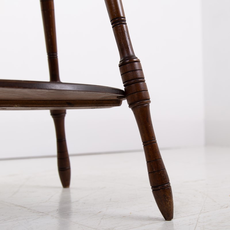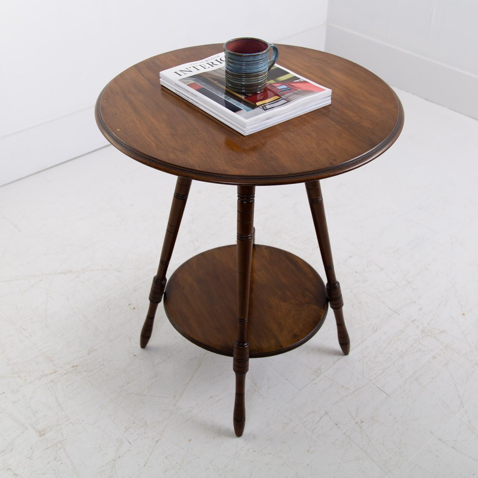 A rather handsome looking 2 tier Arts & Crafts side table of good scale and sitting in original polish, unmessed with condition. Enjoying the look of this one with its well turned legs, simple round top, scale and gentle historic aging.
