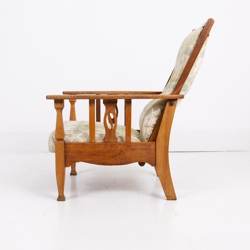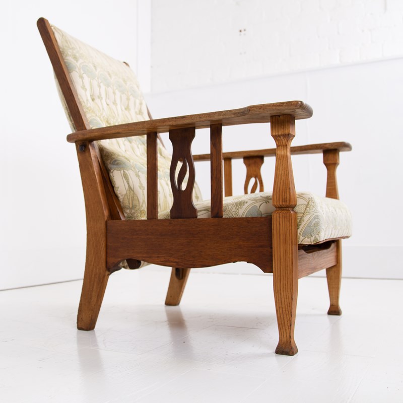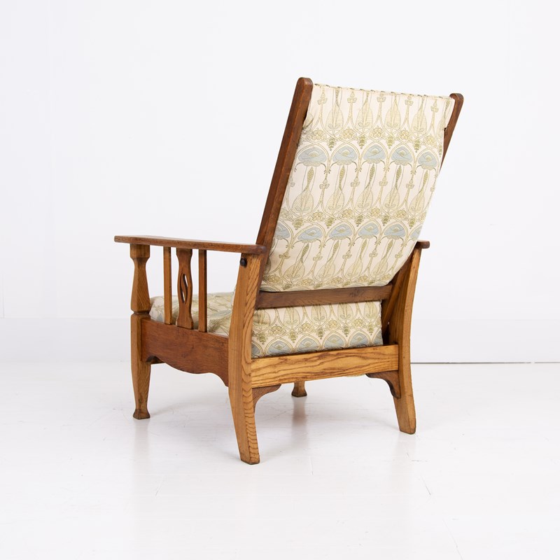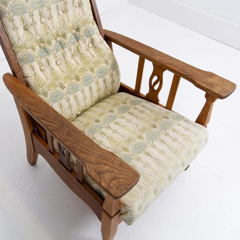 The chair currently sits in a worn and marked patterned Mackintosh woven jacquard fabric and our upholsterer Mark would be happy to fully reupholster at a cost of £380 plus VAT and you would require around 4 metres of fabric which we are happy to assist in sourcing etc. The lighter oak frame has historic aging and as mentioned offers a light reclining motion if you wish to chill.