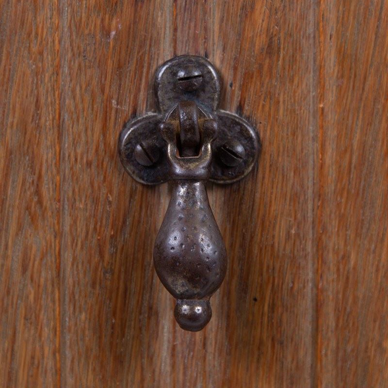 We have 2 deep drawers either side of a decent sized middle drawer which all open by way of a lovely drop pendant knob. The four legs are lightly shaped and we have a middle stretcher to the base. The oversailing top finishes the look. All well crafted, heavy for its size and made with careful attention. We have a working lock and key, a little clunky and stiff to the middle drawer.