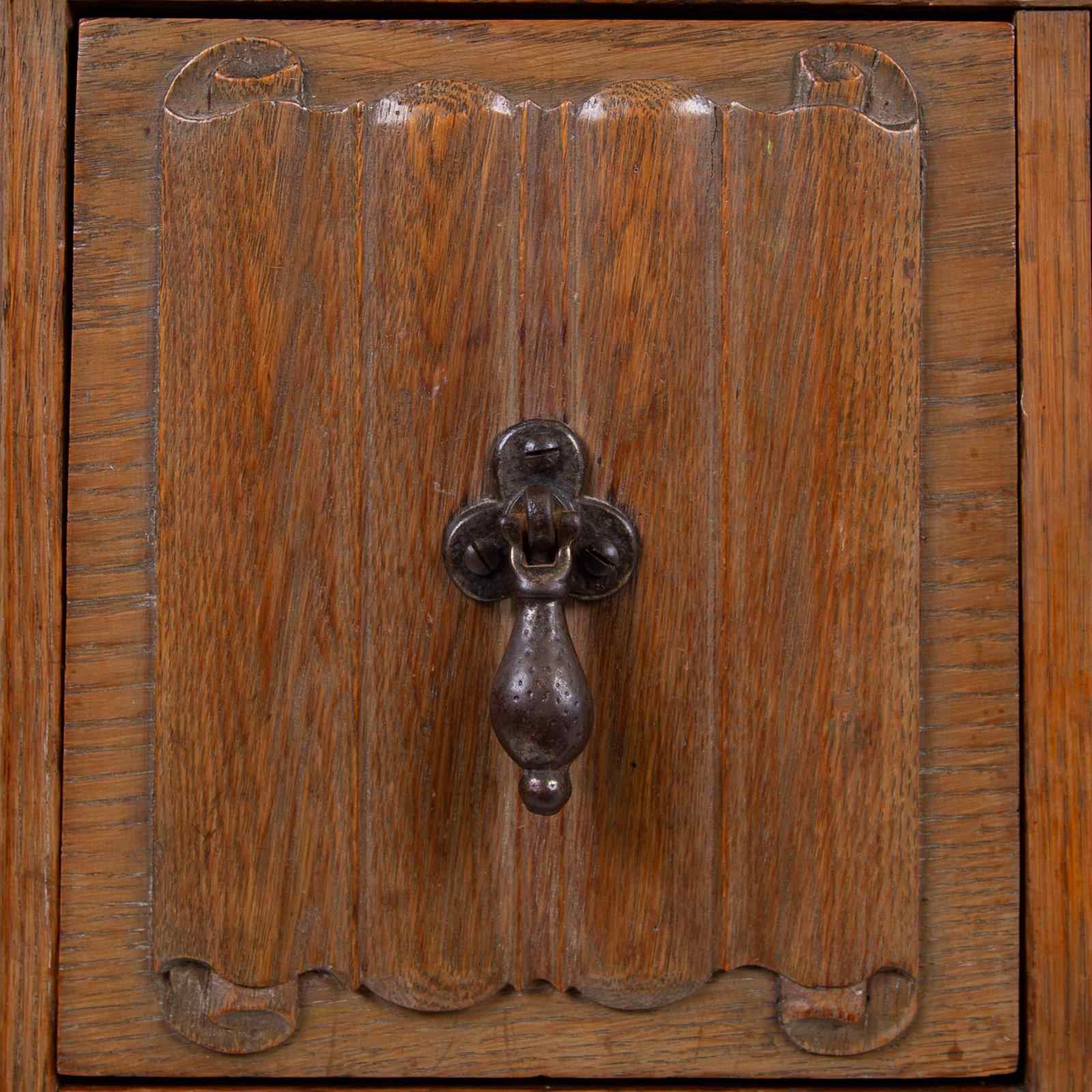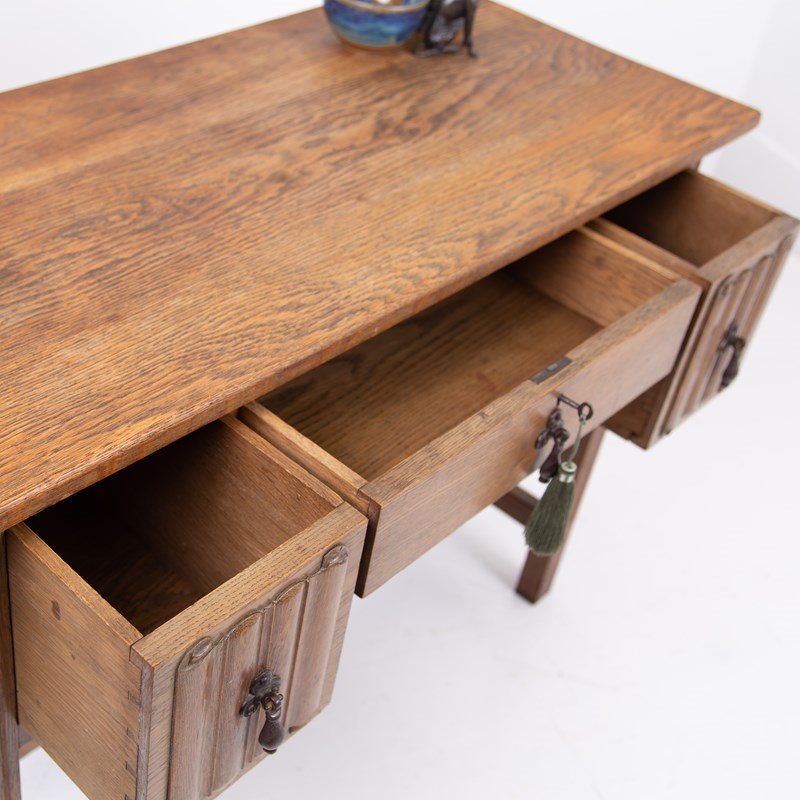 A very charming Arts & Crafts solid English oak desk with attractive linen fold pattern to the two deep side drawers. The desk possesses a pleasing grain and tone to the oak - of a lighter shade than most and is sensibly historically aged.