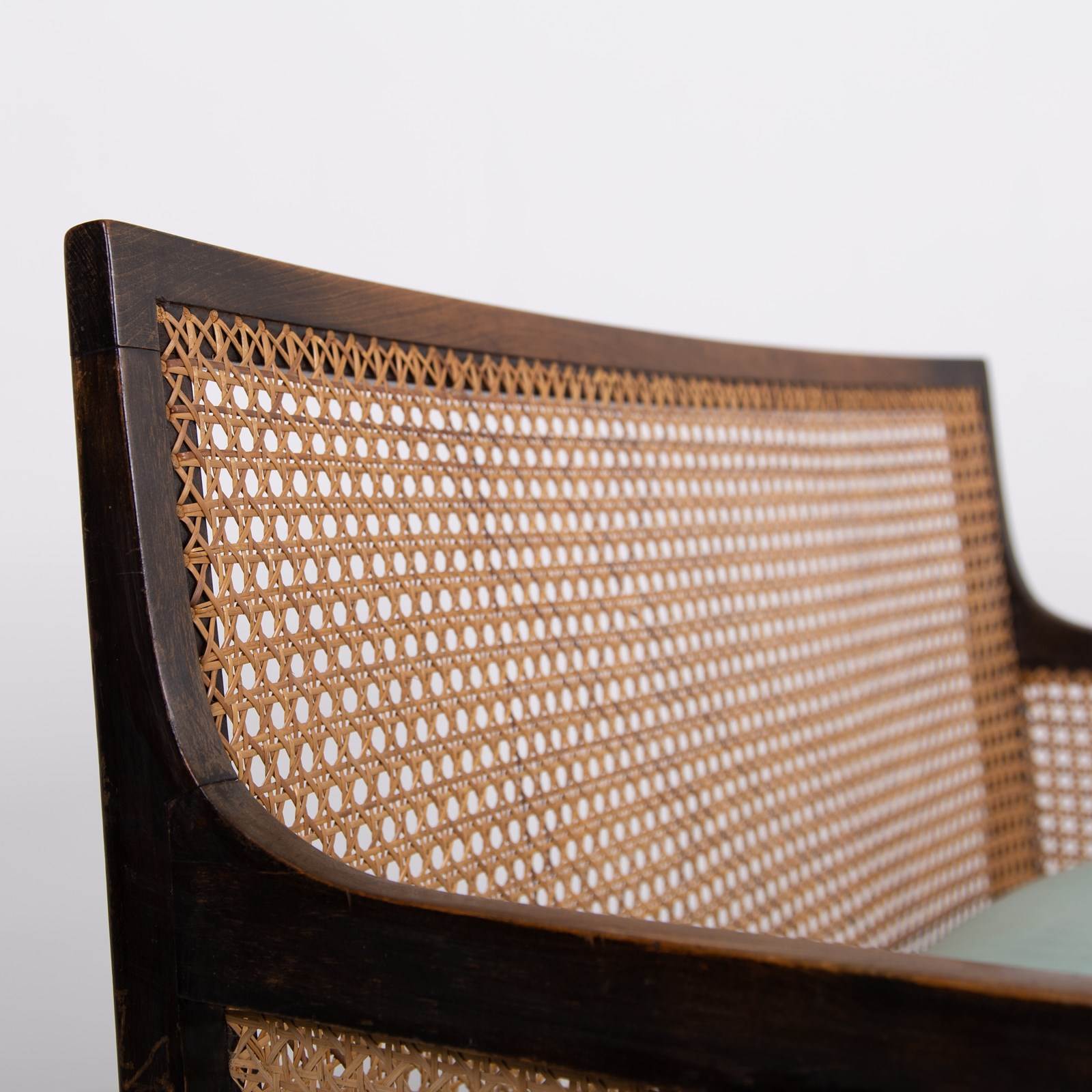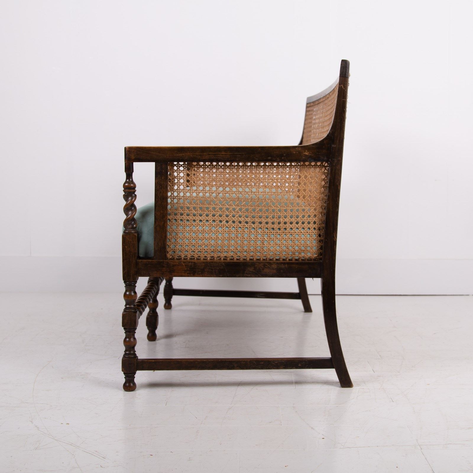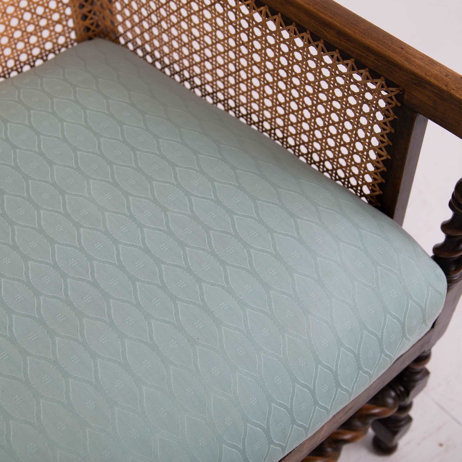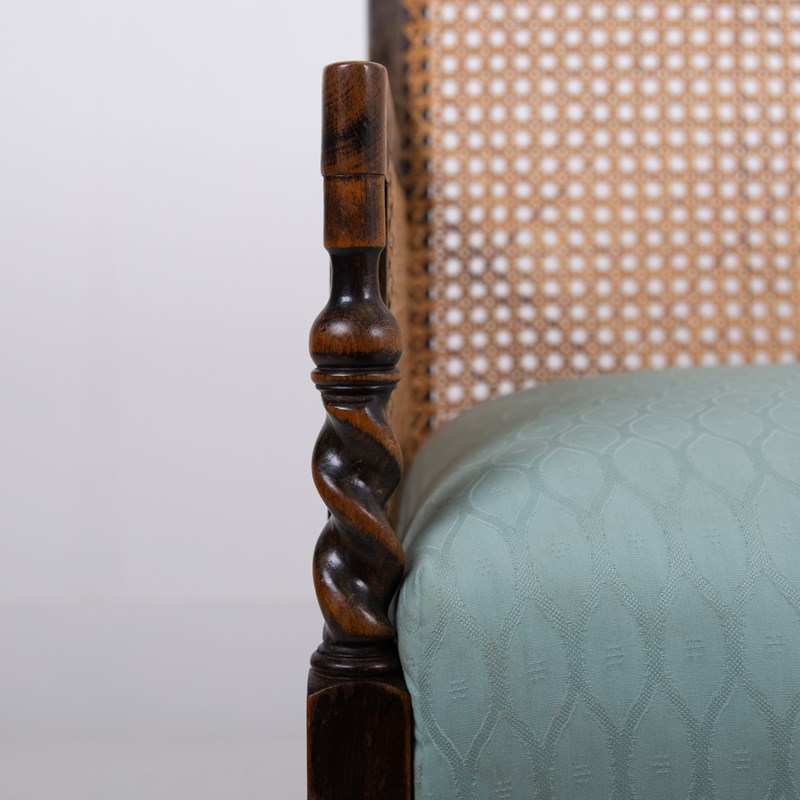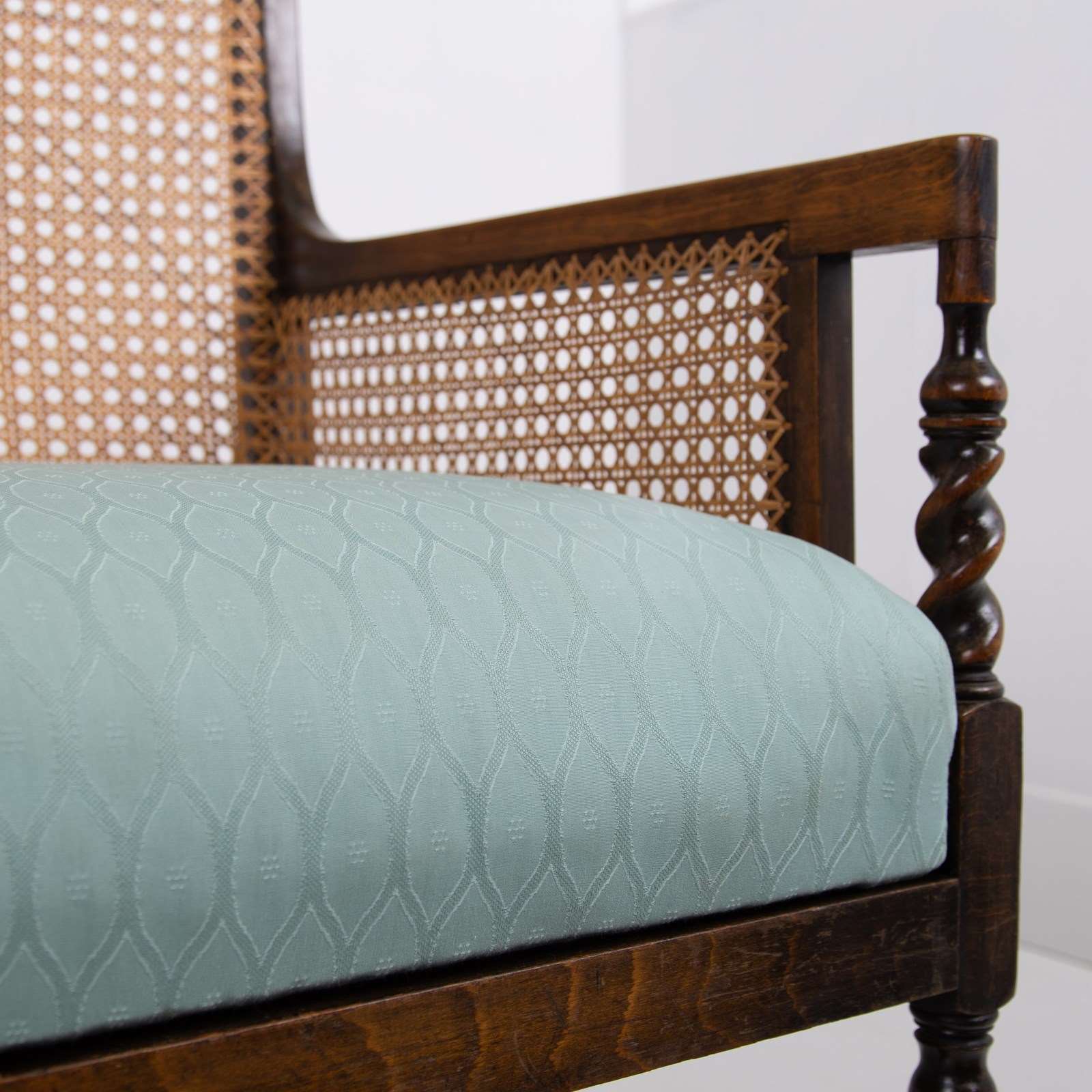 Condition is good with a firm well aged frame - repair free, the cane work is strong and likely a costly refurbishment and is just starting to age up nicely. The sprung seat in a woven light sage green is perfectly usable however if you would like new upholstery our upholsterer can oblige for £220 plus VAT and you would require around 2 metres of fabric which we can assist in sourcing if you wish. Please let us know when ordering.