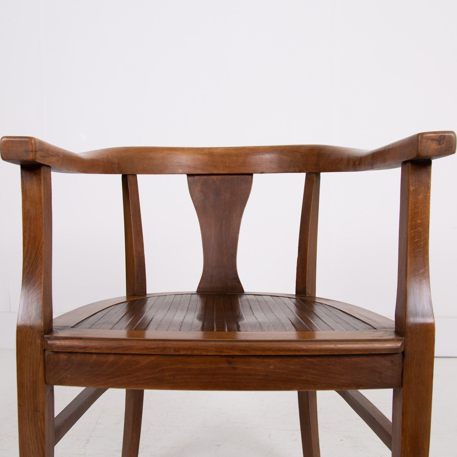 Sitting in a lovely time-worn condition and dated 1935 underneath with a ribbed shaped seat, the chair has an effortless design, very much of the era and is faintly industrial in style with some good width, berth and depth.